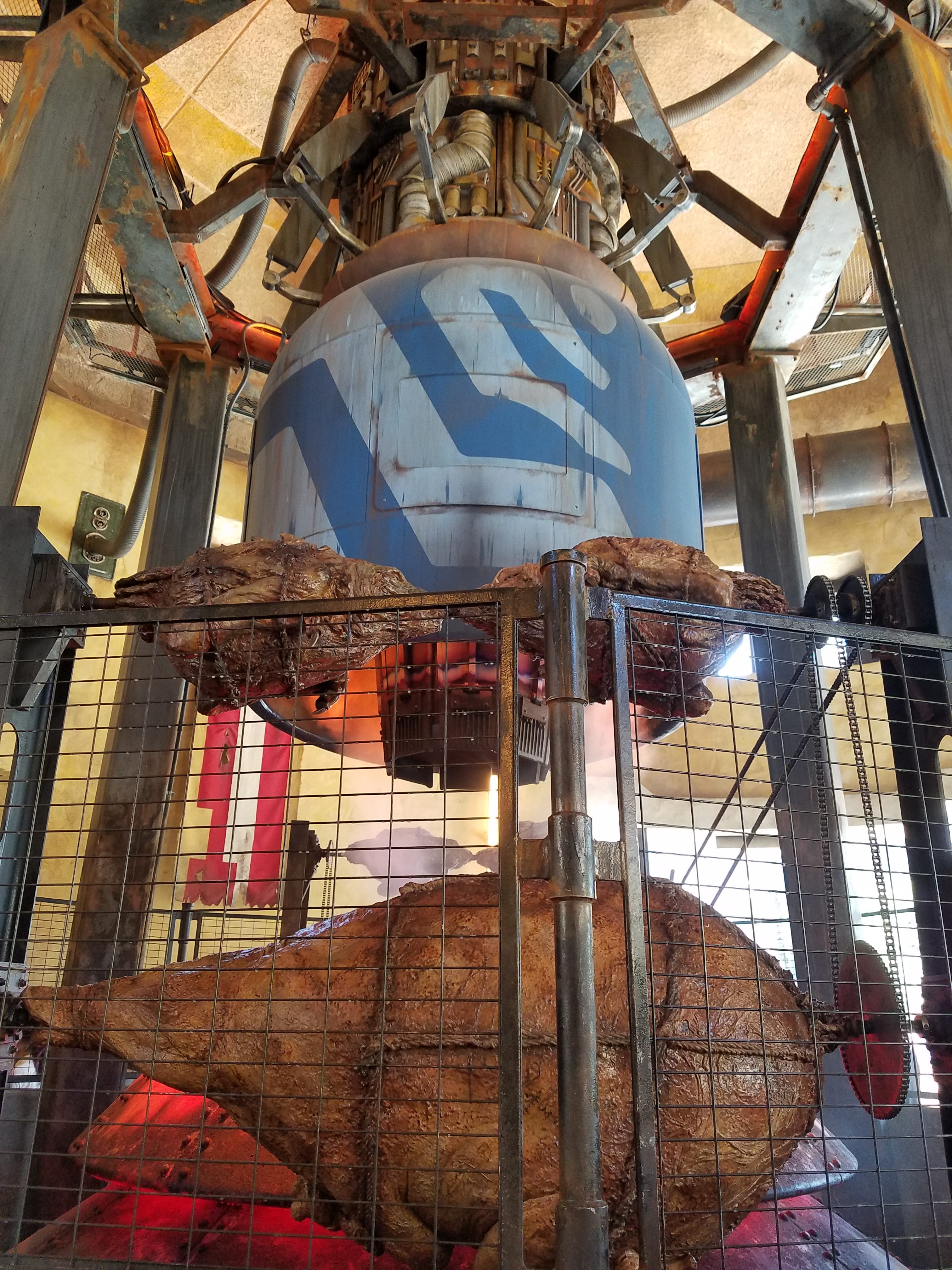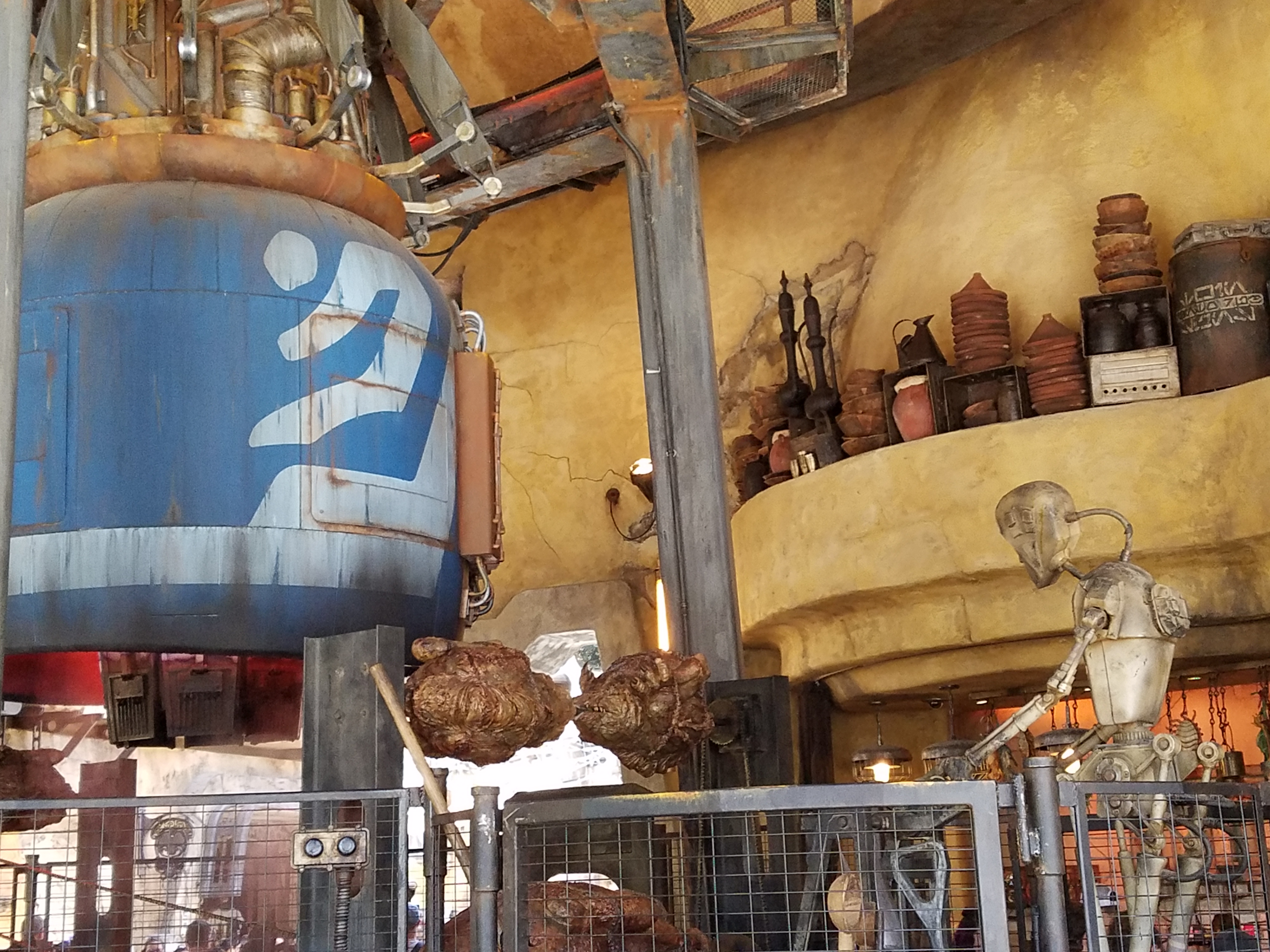 Before leaving Docking Bay 7, we put in our mobile orders for Ronto Roasters. We tried a Ronto Wrap (roasted pork, grilled pork sausage, peppercorn sauce, tangy slaw, wrapped in pita) and were able to customize it to remove the slaw. It was only a few minutes wait for them to prepare it. This was more of a standing area, but it had really cool theming.