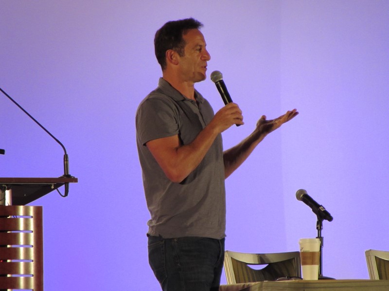Of course, there were plenty of Harry Potter questions. One was discussing working with child actors, and he seemed to appreciate working with them, as they seemed to be veterans when he came into the series, and they all seemed to turn out well in the end. He also told a pretty funny story about how he filmed a scene with Richard Harris who played Dumbledore. When he was told “action” he said he thought Richard Harris had forgot his line, but then while waiting for Harris to go, he wondered if he was the one who forgot his line. Turned out Harris was just giving him a hard time. The real funny part come up next, which involves the CGI for a character named “Doby” (I haven’t seen Harry Potter. He basically talks about how me mimed actions which involved him kicking and knocking on the head this CGI creature named Doby. Chris Columbus was question his mimes, but Isaacs explained his actions and Chris Columbus seemed ok with it. While I haven’t seen these scenes in the film, it sounds hilarious. Isaacs also talks about him creating his “exit line” where he said, “Harry Potter won’t always be around to save the day” and Daniel retorted, “Don’t worry, I will!”