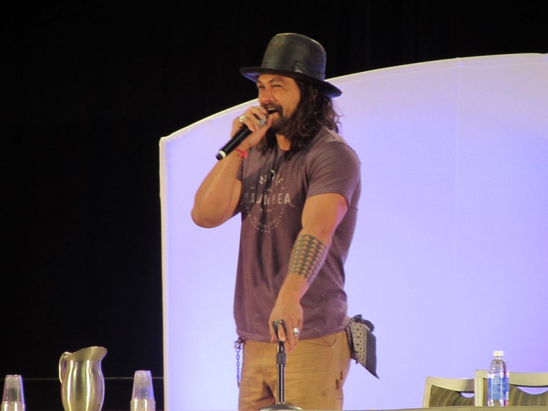 After Summer Glau’s panel at Phoenix Comicon, Jason Momoa was up. He came out and received a massive welcome from the crowd, pretty eager to see him. Turns out among the audience was his mother, so the panel would be PG-13. I have to say–Momoa had a pretty awesome hat on. Of course, he greets the crowd started with some Dothraki, since he played Khal Drogo in Game of Thrones.