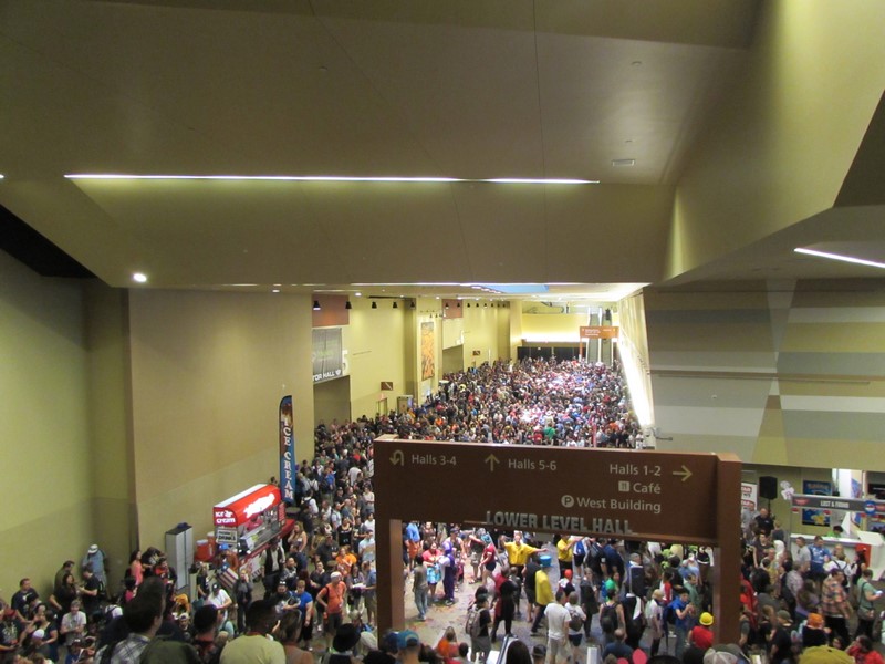 When we got there, it was just a couple minutes to 10am by the time we headed down the escalator toward the Exhibit Hall. Just maneuvering to the escalator was noticeably more crowded than the day before. Then as we went down the escalator, we saw that the floor was packed with people waiting to be let into the Exhibit Hall, way more crowded than Friday had been. But this was to be expected, as most Saturdays at comic conventions are the most crowded.