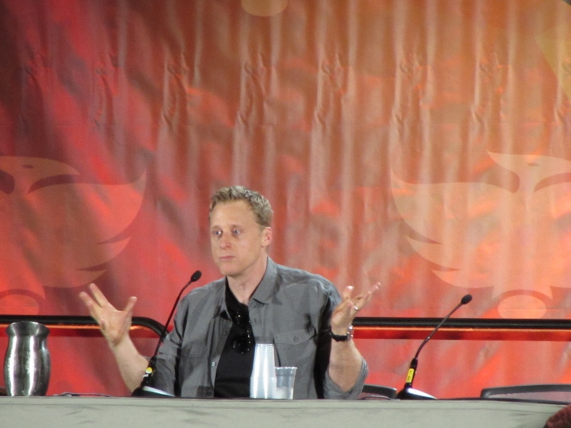 Alan Tudyk came on stage to a roaring applause, thanks primarily to Firefly, and did his obligatory photo with the crowd. He apologized for being late, and was worried he was really late (he was about 15 minutes late). Tudyk proceeded to talk about how big the con is, and how many people are in this room (it was almost to capacity). He apparently has a “bag of crap” from which he will give items to the questioners, signed by himself. He apologized for leaving his good bag of crap at home, and he says he had an extra crappy bag of crap today.