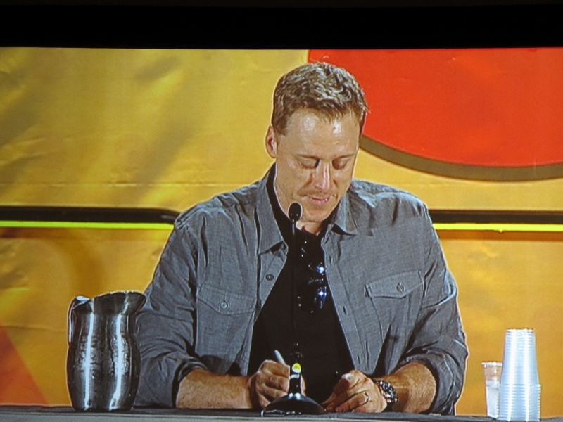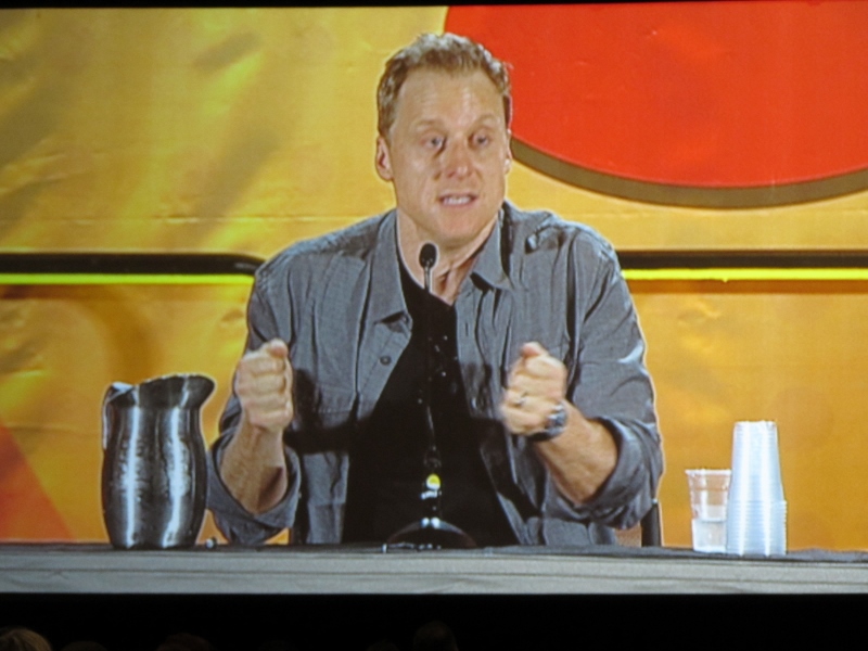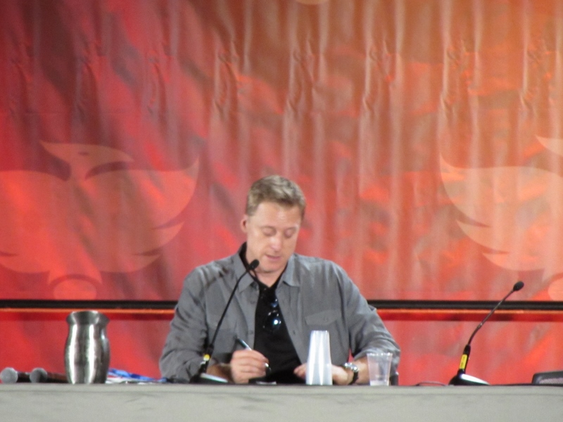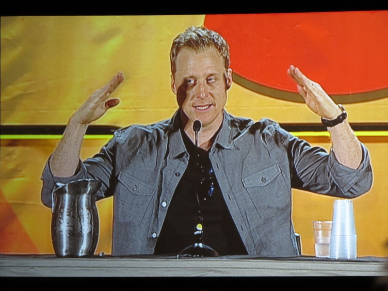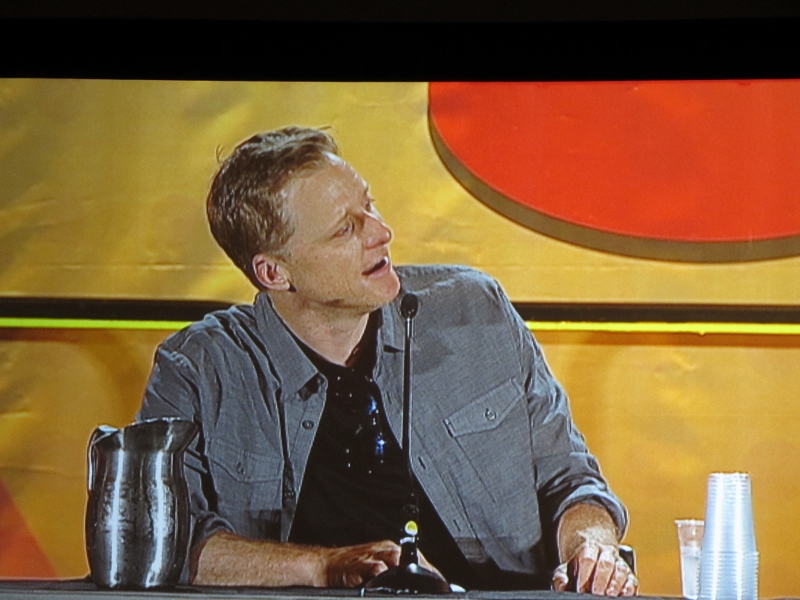 The next questioner asked Tudyk who he would like to have lunch with, dead or alive. Tudyk said he doesn’t really know though. Gene Wilder was a name he dropped. Jesus too, but they don’t speak the same language. Jimmy Carter was another name dropped. He also said he would like to see a Queen concert, or have lunch with John Lennon. This question gets some Con Man stickers, that apparently have nudity…?