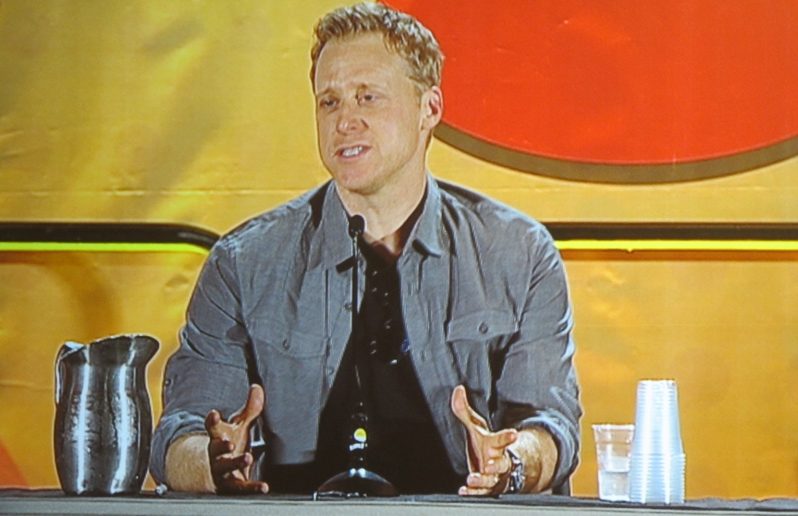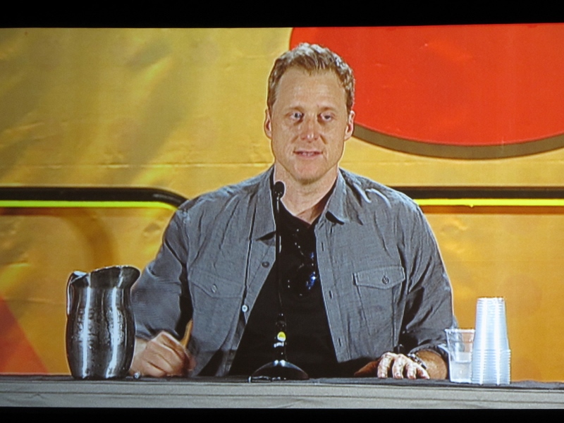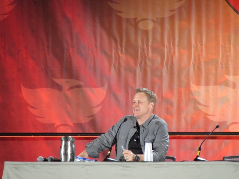 The first question asked of Alan Tudyk is if he has ever been able to plan his own death on film, and then asked what it would be. Alan talked about how he had some good ones, such as his Star Wars and Firefly deaths, among others. His idea for how he would like to die would be while something extraordinary is happening, like a tiger fight and/or shark boxing. He settles on shark fighting. The questioners’ reward for this question? A bottle of body lotion.