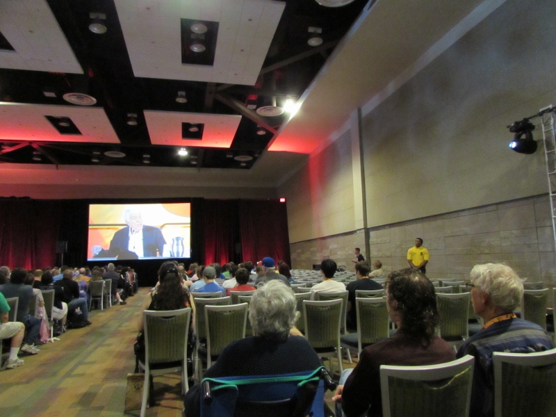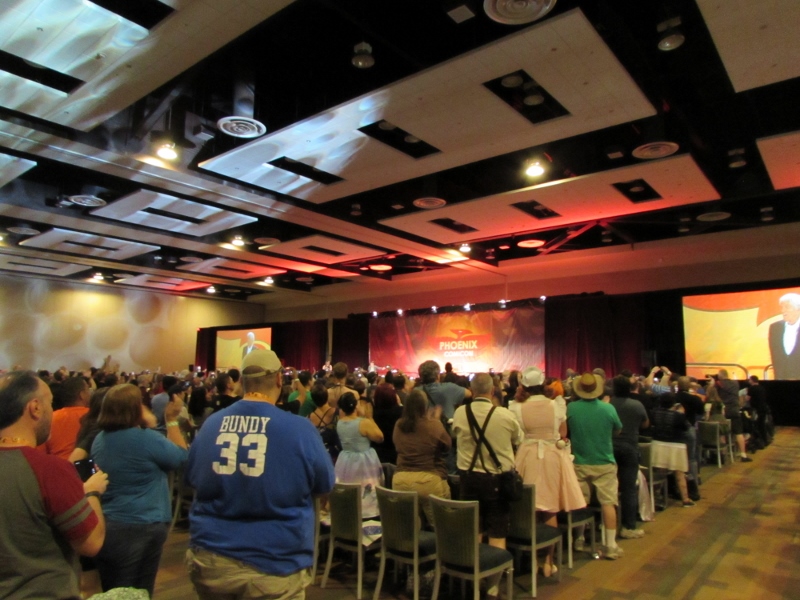 As Neal McDonough’s panel began to wrap up around noon in West 301A, I headed over next door to West 301BCD for Dick Van Dyke’s panel, which was scheduled to begin at 12:15pm — or so I thought. Although listed on the Programming schedule on Phoenix Comicon’s website and app as 12:15pm to 12:45pm, it apparently was actually 12:30pm to 1:00pm. But that was fine, it just allowed me to get a decent aisle seat in general admission seating.