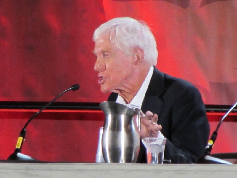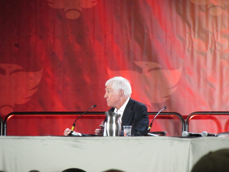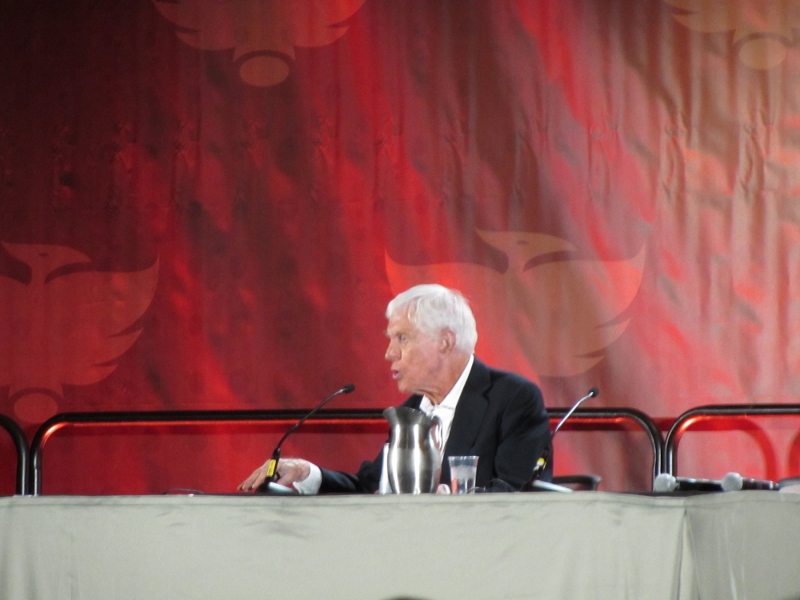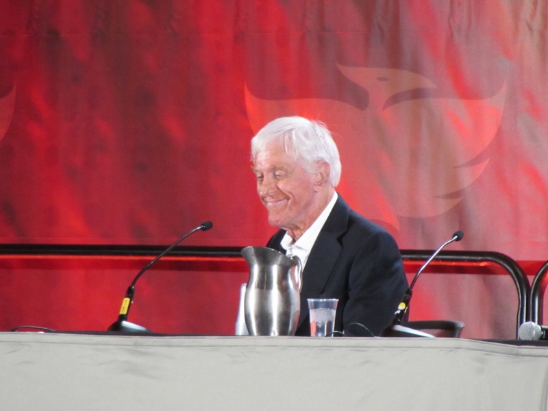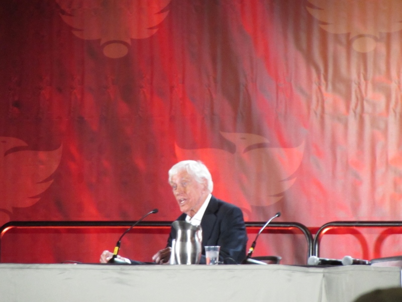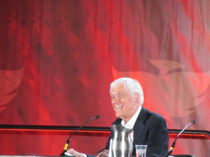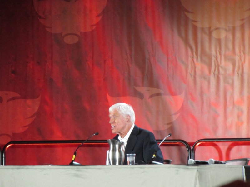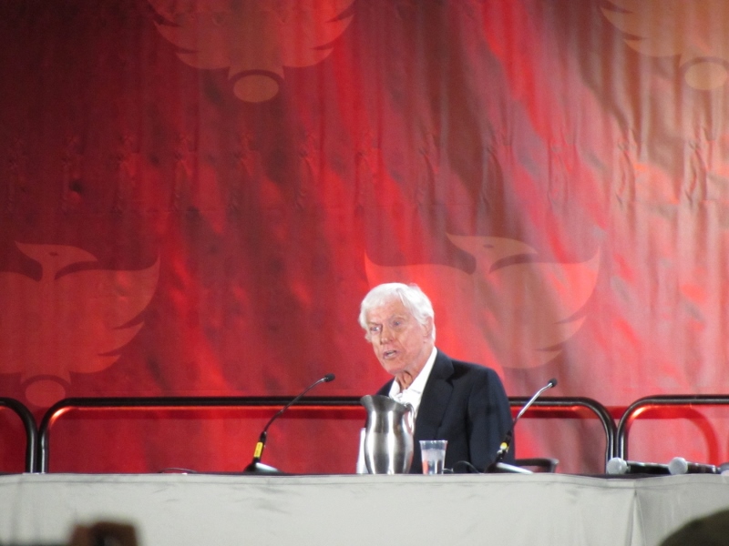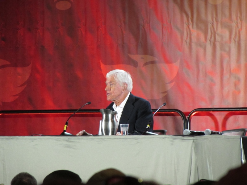 Before handing it over for audience questions, the moderator asked a question of her own about a certain surfing trip that Dick Van Dyke had been on. He told us that it had happened a long time ago, but he was in Virginia Beach learning to surf, and had gotten tired, so he was floating by the breakers. Then he fell asleep, and when he woke up, there was no land in sight. Suddenly, fins started appearing all around him. Thankfully, they turned out to be dolphins, and they bumped the bottom of his board, pushing him all the way to shore!
