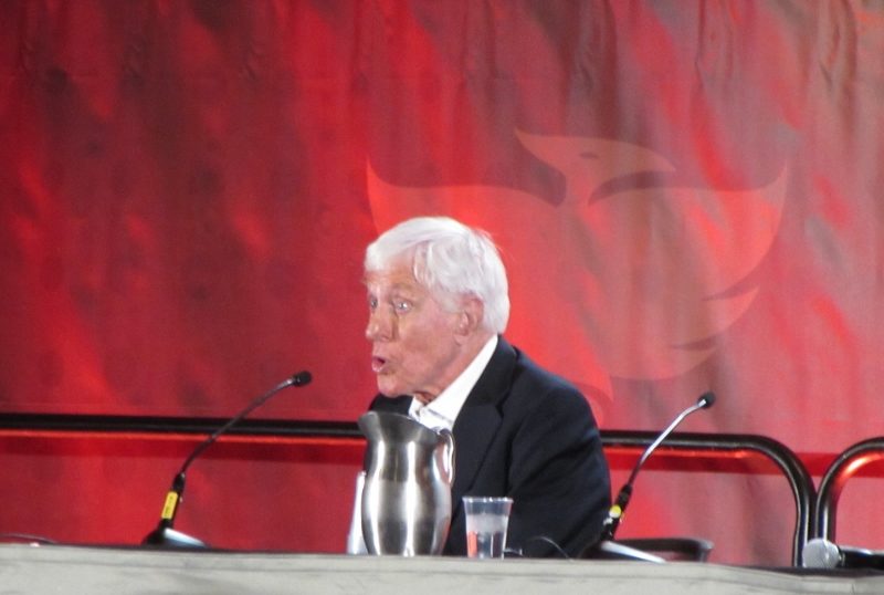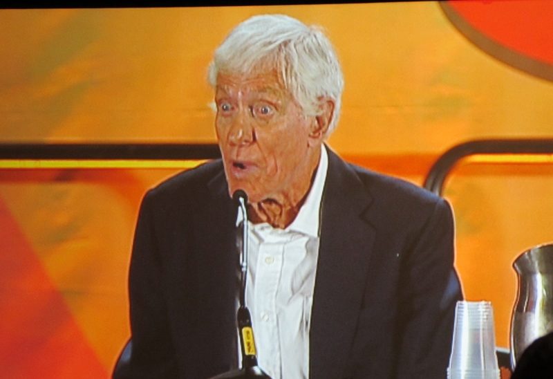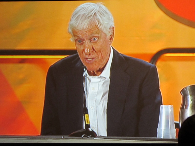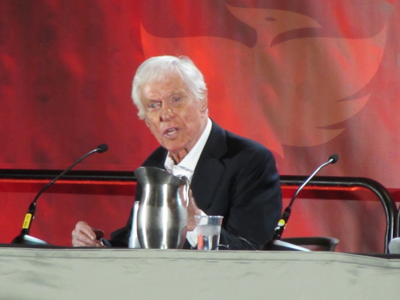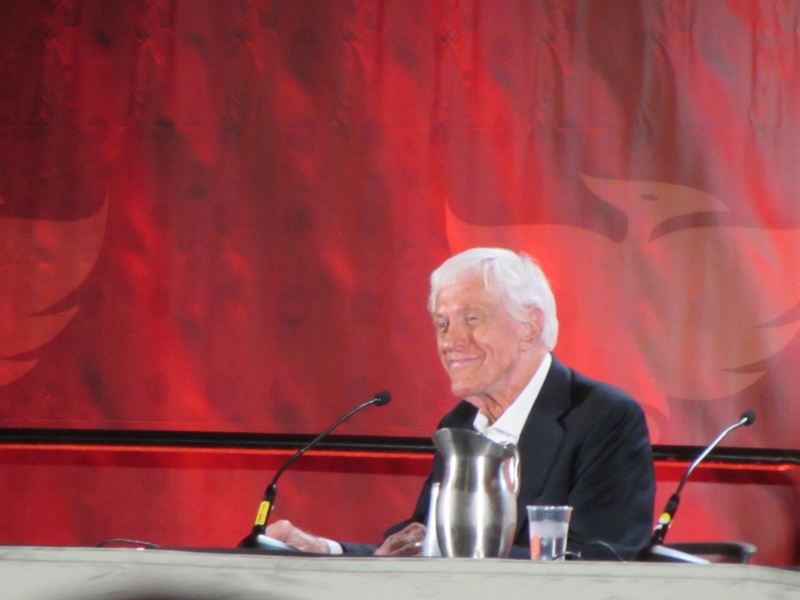 Three microphones were set up in the various aisles for audience members to come up to stand in line to ask questions. The first audience member asked how his approach to acting has evolved from when he started to today. Dick answered that he never planned anything that happened to him. He started out as a radio announcer at the local radio station before television. Someone asked him if he could dance, and he said, “Sure.” Then one thing after another happened, none of which he ever planned, “It just happened to me!” he said, attributing it to serendipity.