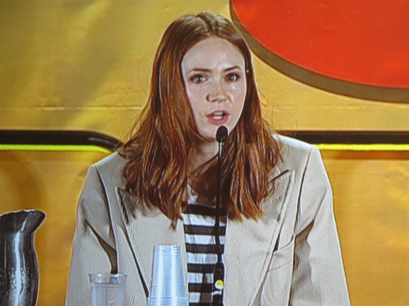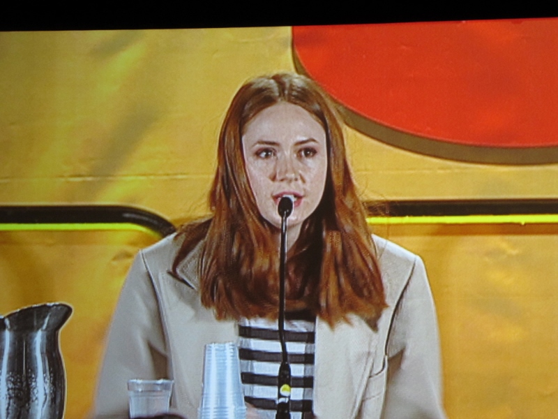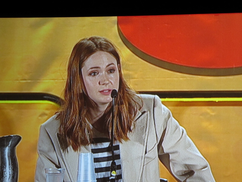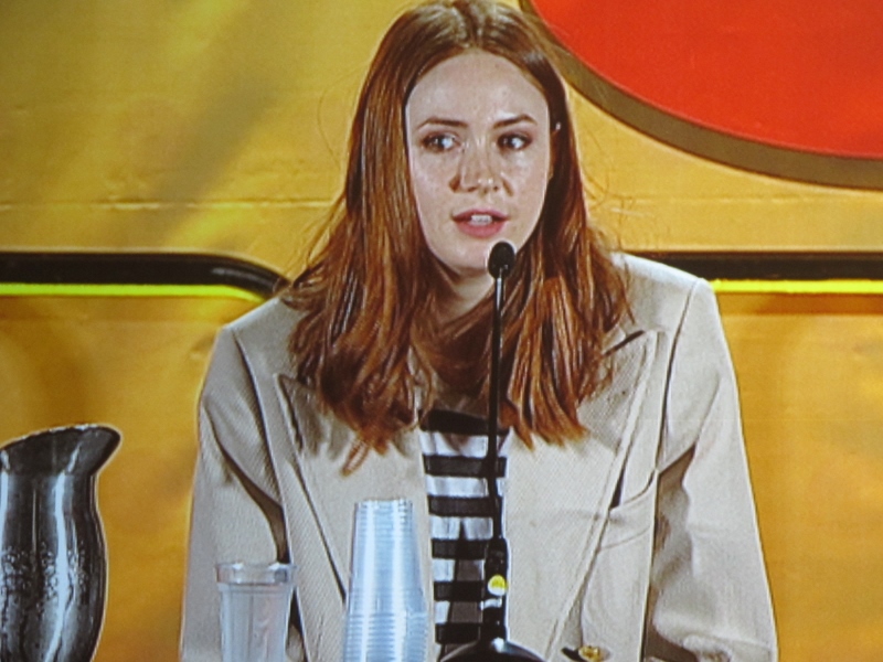 Flipping to the other side of the coin, Karen was asked what her least favorite episode to film was. She didn’t have a specific one to name, but said that any episode where they had to be in the cold was not fun. But back to the funny side of things, Karen was asked what evil character Amy would like to befriend, and it is apparently the Daleks, primarily because it seems like the most fun job for the people who operate the Daleks. Back to Matt Smith, apparently in the episode Dinosaurs on a Spaceship the Doctor kisses Rory, and a questioner asks if that was scripted. Karen said she didn’t know, but “feels like it wasn’t”. Of course, Karen was also asked what her favorite character she has played has been, and she said it had to be Amy Pond because she is the most like that character. As for Karen’s favorite time period of Doctor Who, Karen said she most enjoyed Tennant and Billie Piper’s era. As for what Karen would steal from the Doctor Who set? Matt Smith’s sonic screwdriver.