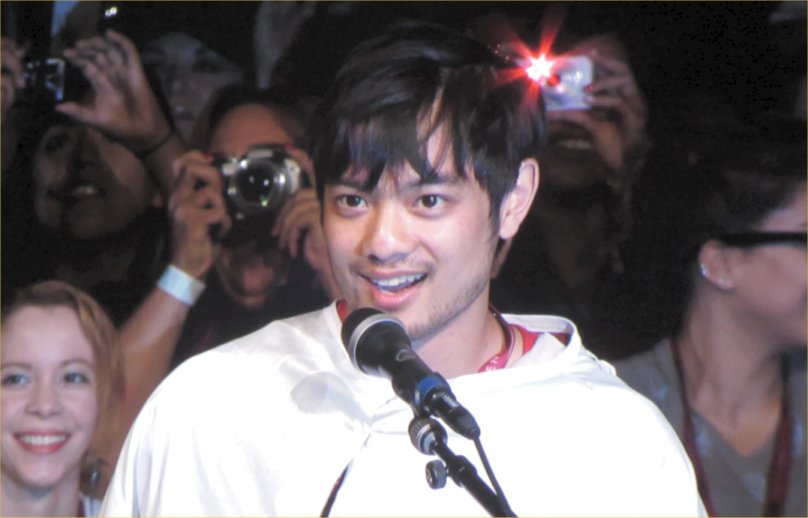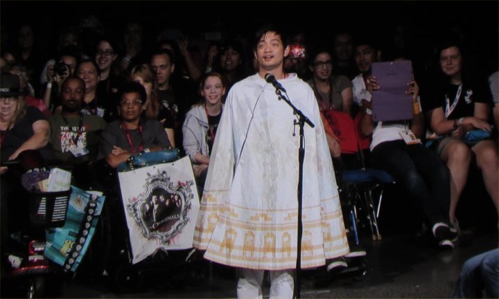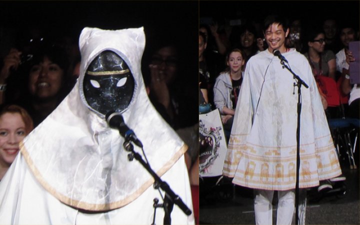 The next audience question comers from a creepy, silent nun-looking costume–only it doesn’t say anything for a while. After a couple seconds the costumer takes his mask off, and it is Osric Chau! For those who don’t know, that is Kevin Tran from Supernatural. You can probably guess what his question is–he asks when Kevin is returning to the show. Carver replies, “Now? Never!” No clear answer is given, but personally, I have a feeling he will be back.