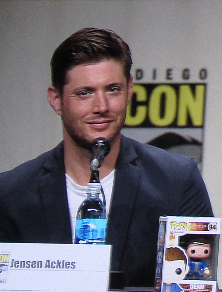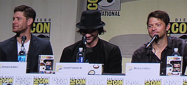 After the clip ends, the moderator Brian Truitt is brought out, who is from USA Today and describes himself as the number one Supernatural fan. He brings out the panelists—Jeremy Carver, one of the writers, Jared Padalecki who plays Sam Winchester, Misha Collins who plays Castiel, Mark Sheppard who plays Crowley, and Jensen Ackles comes back out. All but Mark Sheppard have Funko Pop figurines of themselves (made by Funko Pop, who has all sorts of collectible characters for almost any show, movie or comic book franchise). Someone made a doll for Mark though, out of a Starbucks cup and aluminum foil. Jensen, Jared and Misha are kind enough to give their figures away to the first people in line (Jared kindly makes it a point to include the first person in the ADA line as well!)