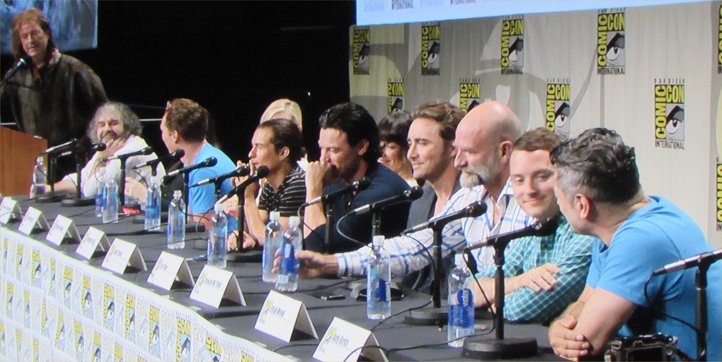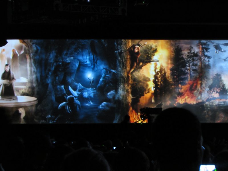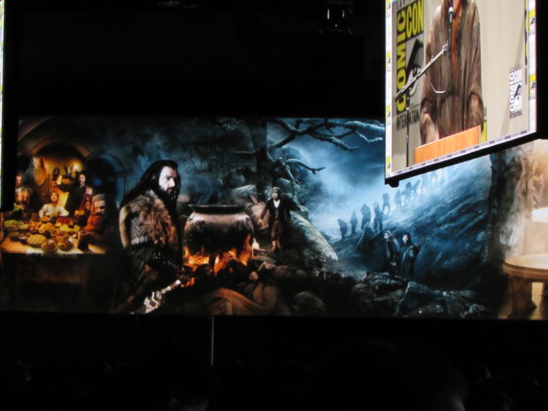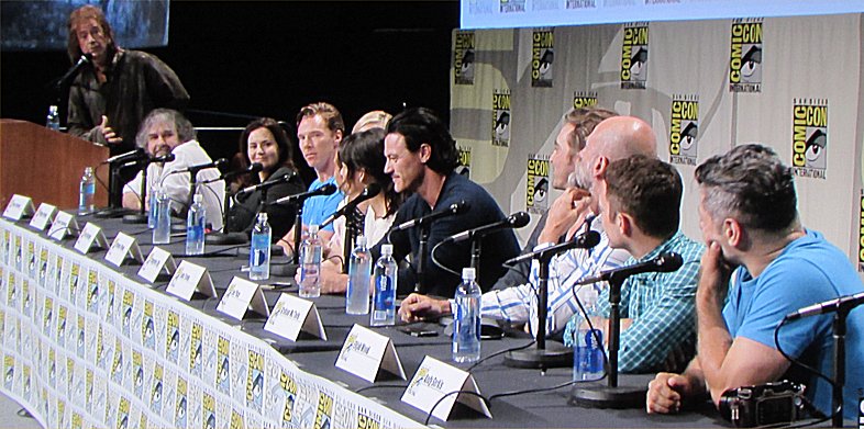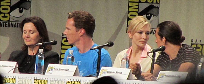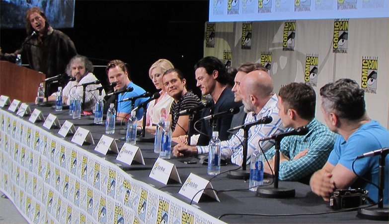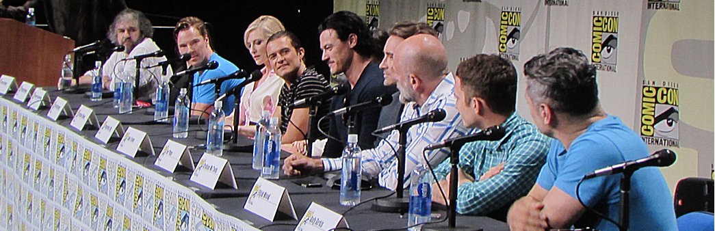 The panelists are introduced, and the panel is a pretty big one. Peter Jackson of course shows up, the director of The Hobbit, as well as screenplay writer Philippa Boyens, and actors Benedict Cumberbatch, Elijah Wood, Andy Serkis, Cate Blanchett, Orlando Bloom, Evangeline Lilly, Graham McTavish, Lee Pace, and Luke Evans.