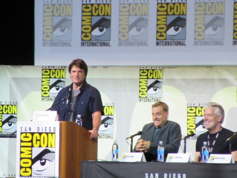Nathan Fillion came out on stage first, announcing that he would be moderating the panel, and confessed that he had never moderated a panel before. However, he joked, “I run a tight ship.” (Fillion would continue to repeat this joke throughout the panel.) He then brought out a full slate of panelists, including Alison Haislip, Casper Van Dien (who Fillion said beat him out for the role in Starship Troopers), Lou Ferrigno, Nolan North, Liam McIntyre, Felicia Day, Mindy Sterling, producer PJ Haarsma, and finally Alan Tudyk. Upon introducing Tudyk, Fillion announced, “I’m only going to say it one time: he’s more talented than me.”