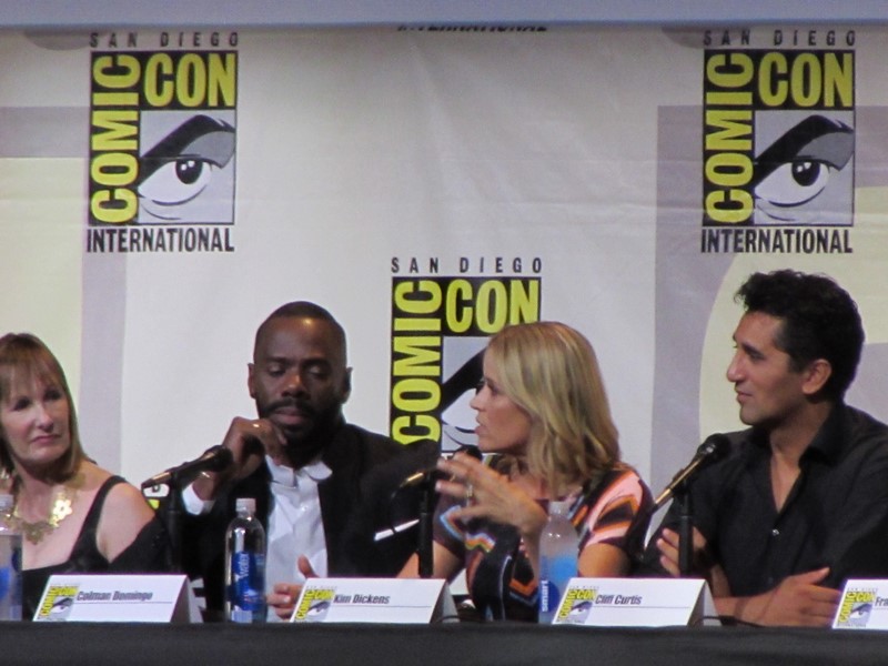 Another question was what the cast members want their characters to do more of. Alycia Debnam-Carey spoke about how the characters are now separated, so you’ll get to see them more individually. Curtis thinks the most important thing to Travis is family, and that he wants Travis to get the family back together. Dickens said that she wants to explore Madison’s past. At this point, Hardwick inserted his theory that one day Madison would call up Rick and say, “Yo Rick, it’s your cousin, Madison Grimes!” Domingo would like to see Strand have more compassion — and find a weapon. Dickens and Hardwick insisted that Domingo should do a “Thriller” dance — maybe for Comic-Con next year?!
