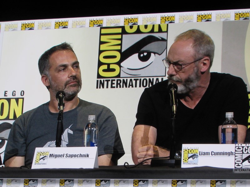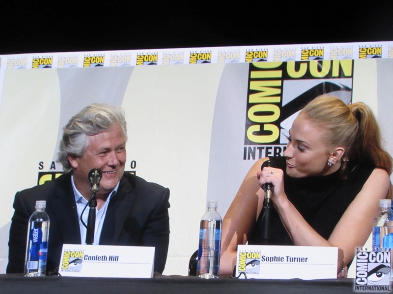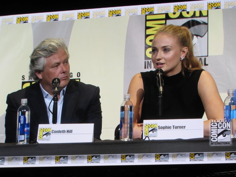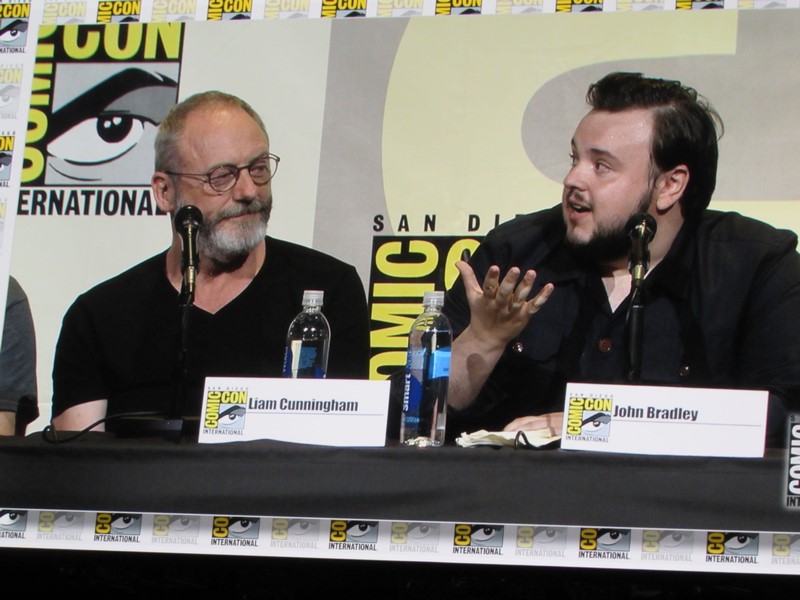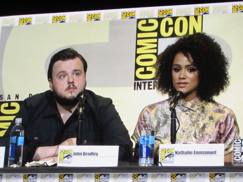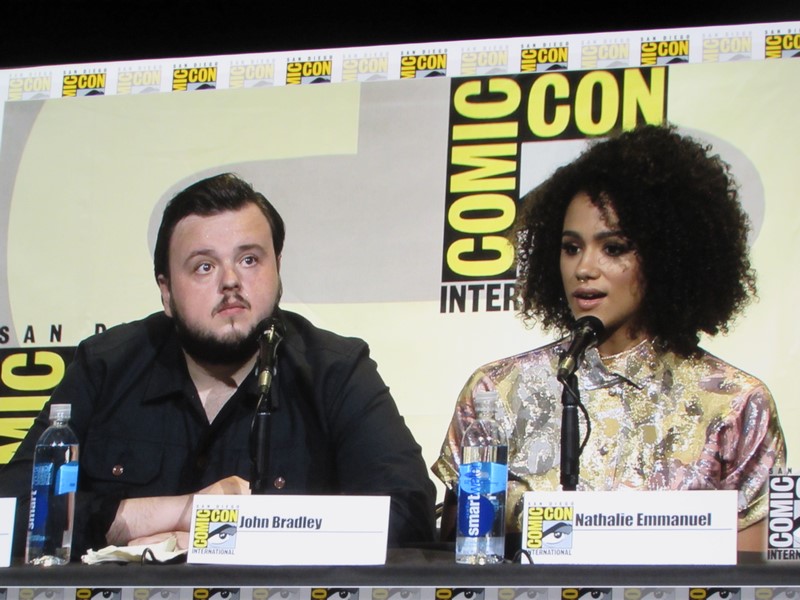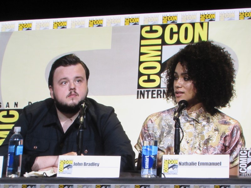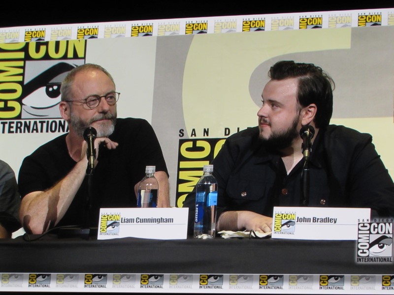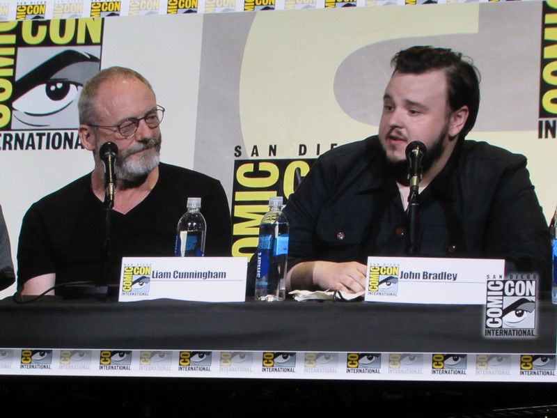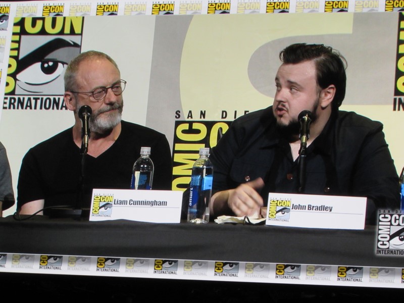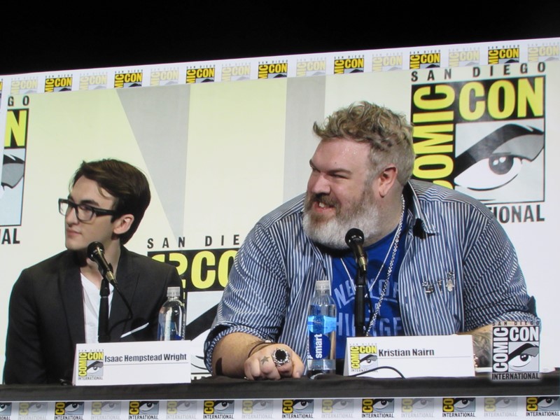 He then brought out the panelists (while the Game of Thrones theme song was playing in the background), which included creators/executive producers/writers David Benioff and D.B. Weiss, director Miguel Sapochnik, and cast members Liam Cunningham (Davos), John Bradley (Samwell), Nathalie Emmanuel (Missandei), Conleth Hill (Varys), Sophie Turner (Sansa), Iwan Rheon (Ramsay), Faye Marsay (the Waif), Isaac Hempstead Wright (Bran), and Kristian Nairn (Hodor). Of course, Kristian Nairn was greeted with chants of “Hold the door!” from the crowd.