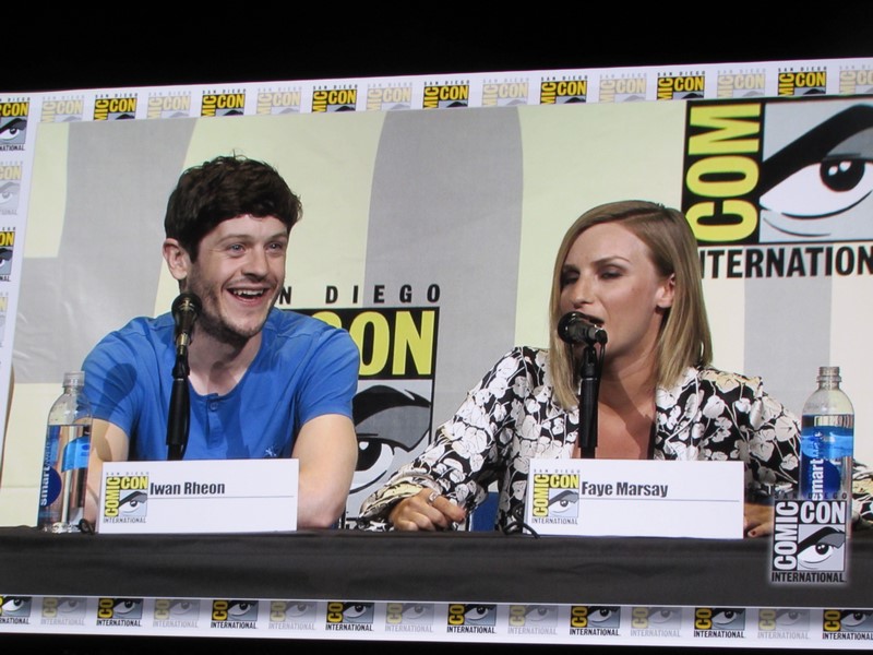 The panel was then opened up for audience Q&A. Button lady asked Sophie Turner what scene she was most looking forward to acting when she first read the script this season, to which Turner said it was the Ramsay scene, saying it had been building up to this, her first kill, “and I’m so glad it was Ramsay!” Iwan Rheon replied, “It was an honor to be killed by you.”