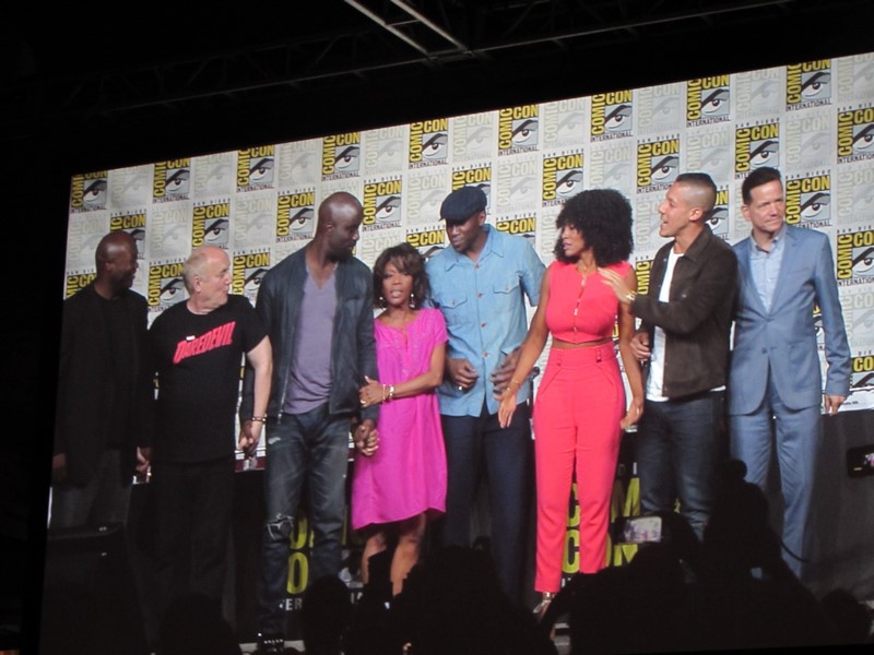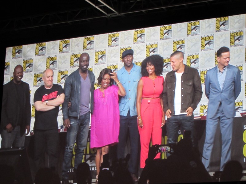 Soon it was time for the Luke Cage panel. A decent number of people left after Teen Wolf, but the room seemed to fill up after that. It was almost 5:45pm, when suddenly the lights went out, and a 2 minute countdown appeared on the screen. At the end of the countdown, we saw a clip that featured footage from Daredevil, Jessica Jones, and some new Luke Cage footage — which then ended with the Punisher. Jeph Loeb, executive producer and Marvel’s Head of Television came out on stage to moderate, commenting that this was hopefully the “first of many Marvel Netflix panels.” He showed us that he was wearing a Daredevil shirt underneath his Luke Cage jacket, and he also put on a Jessica Jones hat. Loeb then split up the crowd into three different groups, the right side of the room being Daredevil, the middle being Jessica Jones, and the left being Luke Cage. He had each group yell out the name of their assigned show one after the other. These kind of warm up antics seem to be pretty typical with Jeph Loeb, based on the Agents of SHIELD panel that he moderated at WonderCon earlier this year.