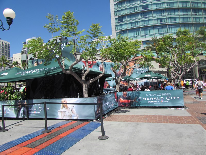 Then we ventured out to take a look at the various offsites, since we hadn’t had a chance to do that yet, and we didn’t really have anywhere else to be until much later in the afternoon. First we went over to the Batman v Superman offsite next to the Omni Hotel, where there was a large statue of Superman, and a Batmobile on display. You could stand in line to get some swag, no badge required. There was a guy going through the line scanning badges for a contest though, and if you won, then you would get to take a picture sitting in the Batmobile. On the way back, we passed by the NBC offsite, featuring Emerald City decorations, free frozen yogurt in honor of The Good Place, and a gravitron ride for Timeless.