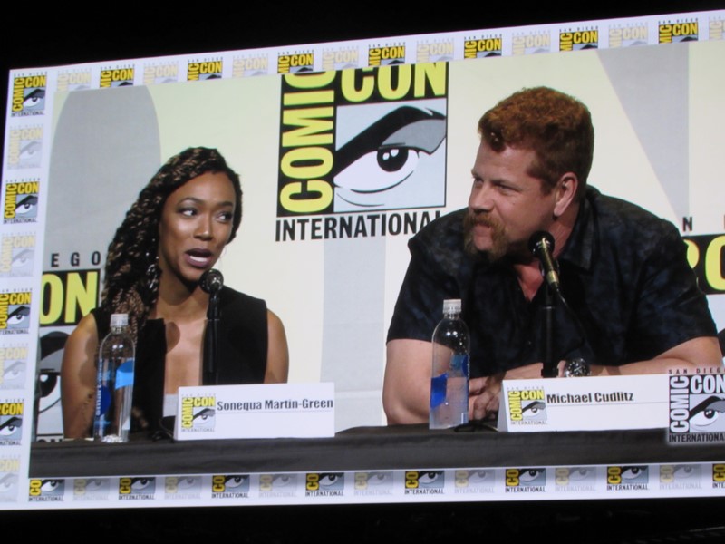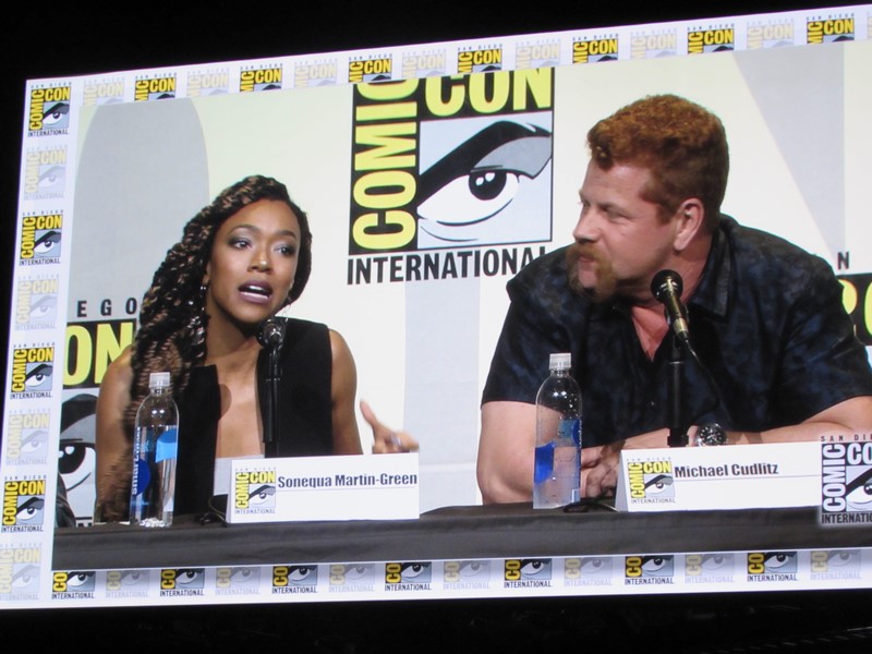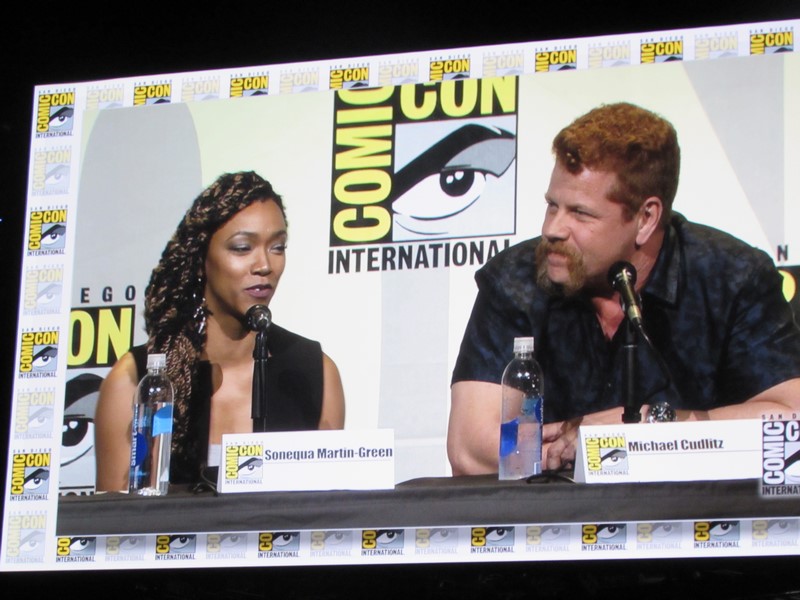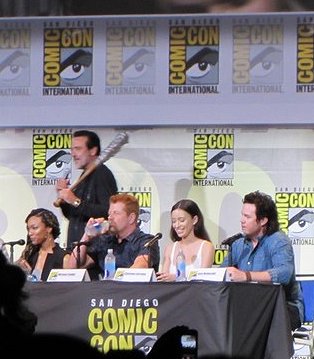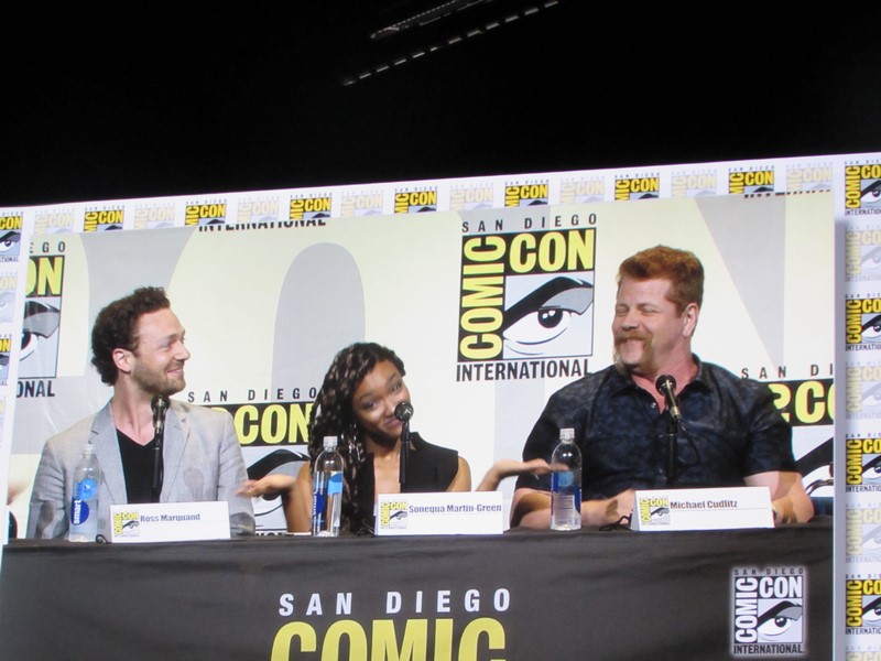 During the trailer, the producers left the stage, except Scott Gimple, and cast members were brought out, including Andrew Lincoln (Rick), Norman Reedus (Daryl), Danai Gurira (Michonne), Chandler Riggs (Carl), Steven Yeun (Glenn), Lauren Cohan (Maggie), Ross Marquand (Aaron), Sonequa Martin-Green (Sasha), Michael Cudlitz (Abraham), Christian Serratos (Rosita), and Josh McDermitt (Eugene).