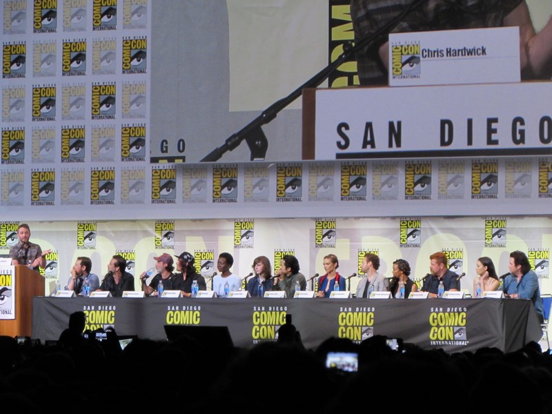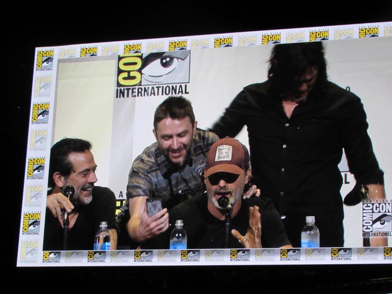 After Chris Hardwick finished up his “pee break” following the Fear the Walking Dead panel, he returned to the stage shortly after 1:00pm to begin The Walking Dead panel. Hardwick announced that Season 7 would premiere on Sunday, October 23, and contain 8 episodes for the first half of the season, and then would return in 2017 with 8 more episodes. He revealed that Greg Nicotero directed the Season 7 premiere, which was written by Scott Gimple. Also, there will be a preview special on Sunday, August 14. Of course, Talking Dead will follow each episode throughout the season.
