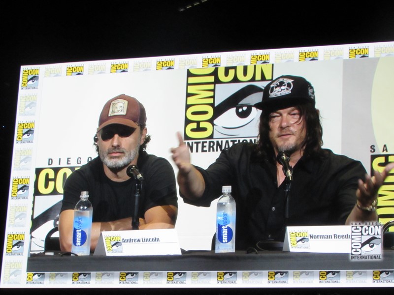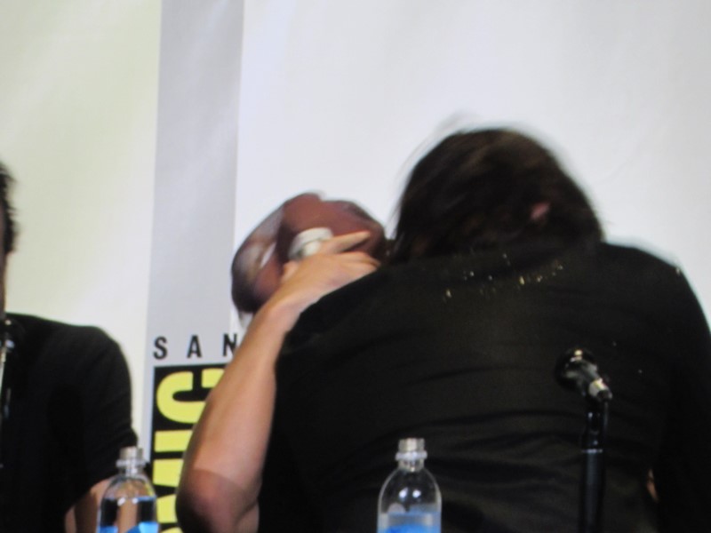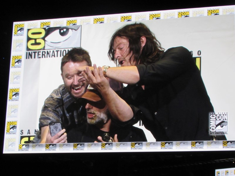 Norman Reedus then gave us a rundown on the various pranks that he and Andrew Lincoln have played on each other. One time they went to Tokyo, and Reedus speaks a bit of Japanese, so Lincoln asked Reedus to teach him how to say “Thank you for having me in your country” but then it turned out what he was actually saying was, “Where’s the toilet?” Reedus also put chickens in Lincoln’s trailer one day. In retaliation, Lincoln wrote on Reedus’s window “Andy’s bitch” after he had gotten his windows tinted. Lincoln also sent Reedus a package on set that exploded with glitter in his face when he opened it! However, we got to watch video of how Reedus got him back for that one: Lincoln gets into his car, turns on the air conditioner — and glitter comes out of the vents! Lincoln said that now they call him “Sparkles” and “Glitter Boy.” But Lincoln decided to get Reedus back right then and there, on stage, and pulled out a handful of glitter and blew it at Reedus! Unfortunately, this plan backfired, as most of the glitter blew back on Lincoln, and got stuck in his beard!