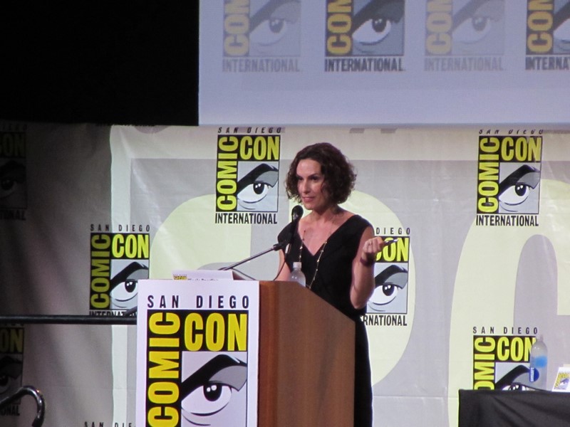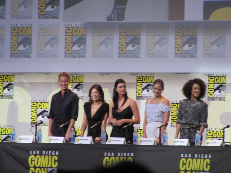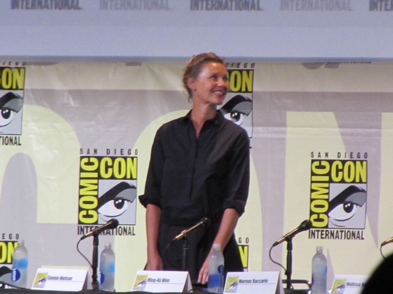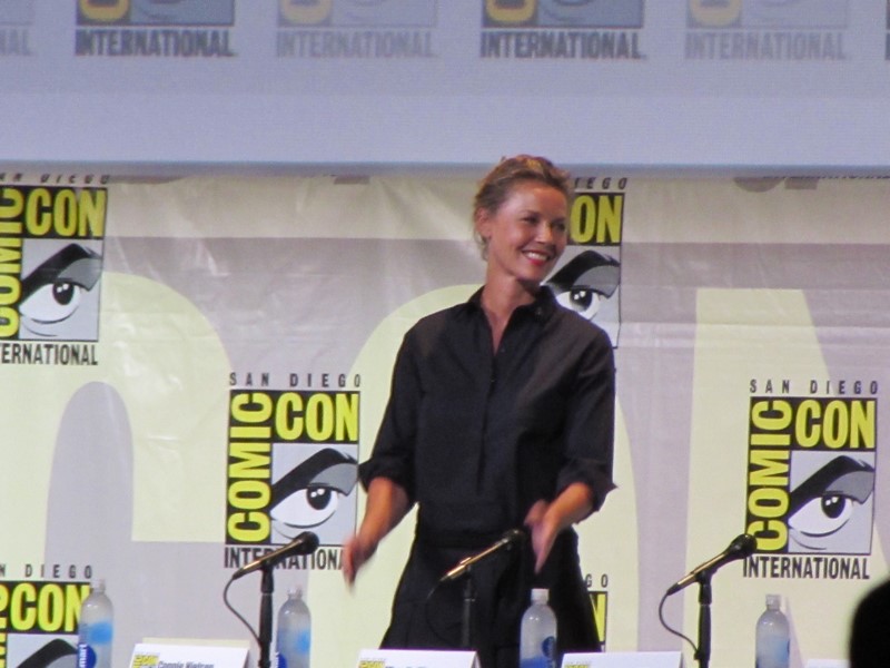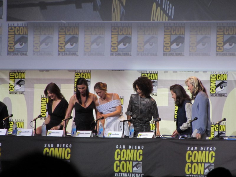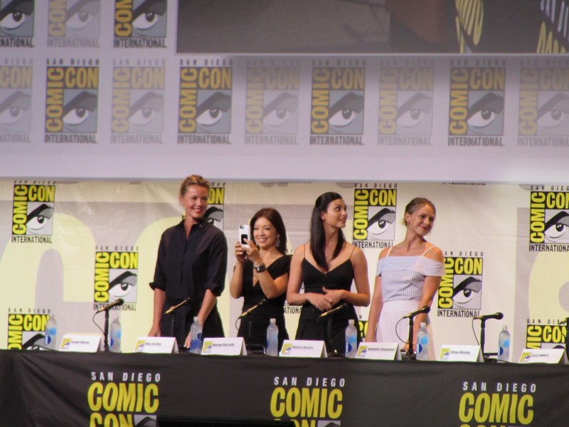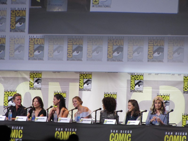 The moderator started off the panel by going down the line asking the panelists what “kick ass moment” they were most proud of for the role they are currently in or recently completed. Connie Nielsen (who we had seen earlier in the day on the Wonder Woman panel, as she will be playing Wonder Woman’s mother, Hippoylta) said that her moment was killing her ninth German soldier on the beach with a double sword. Ming-Na Wen (Agent May on Agents of SHIELD) brought up a scene where she beat up three big guys and told them she’d do them a favor by not telling anyone that “a little tiny Asian woman” just kicked their ass. Morena Baccarin liked that in Deadpool, instead of her character, Vanessa, being appreciative of him for saving her, she called him an a-hole for leaving her in the first place.