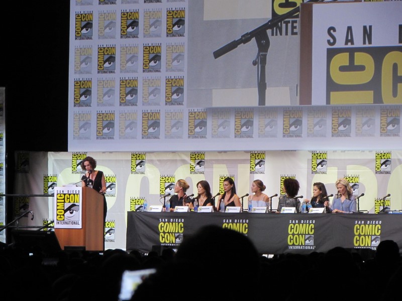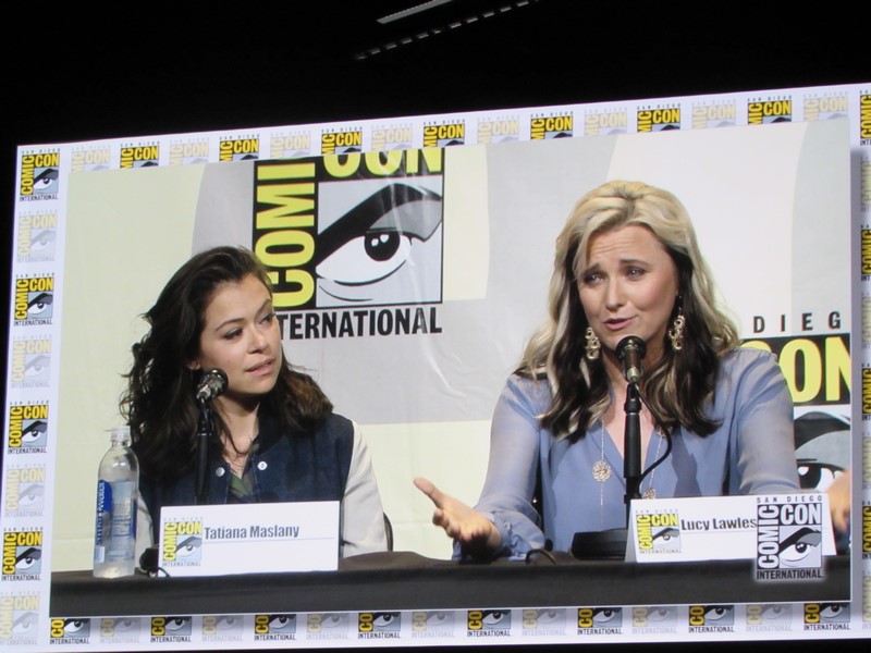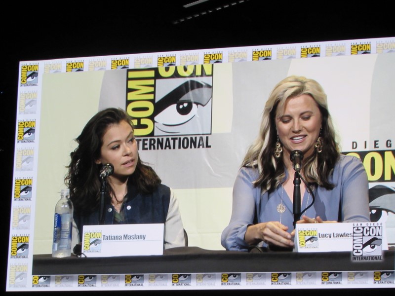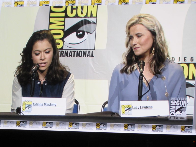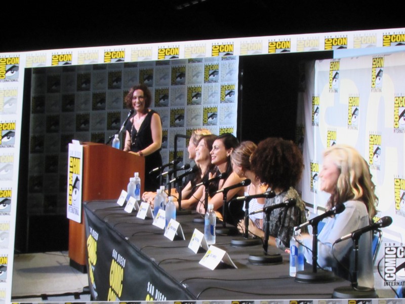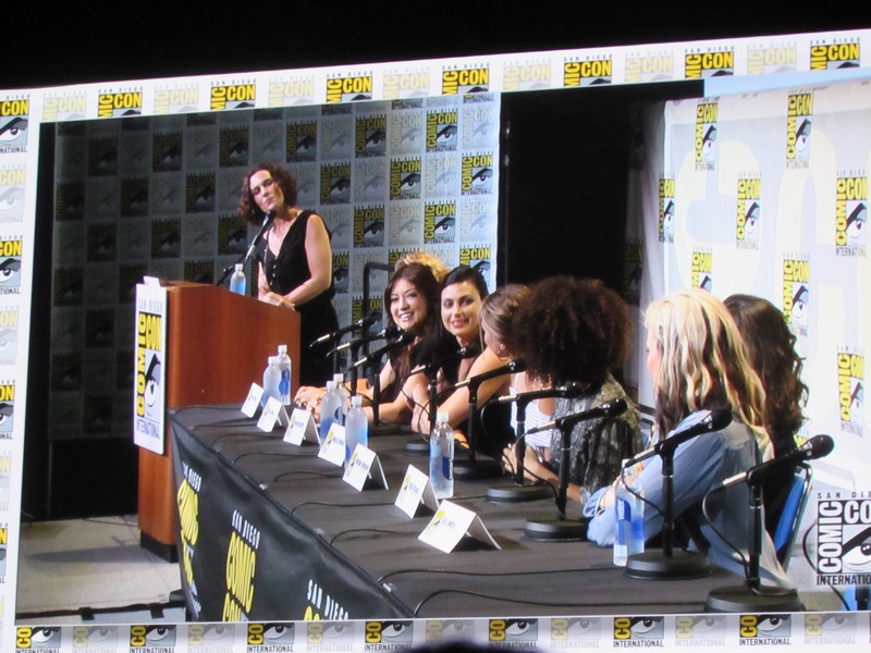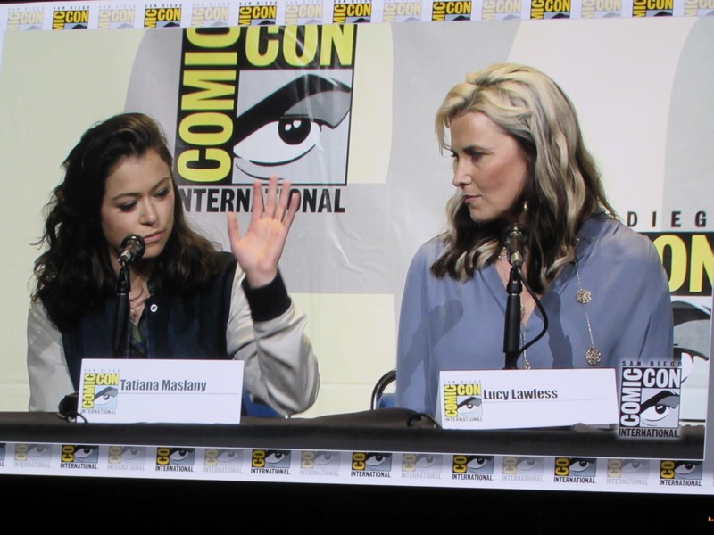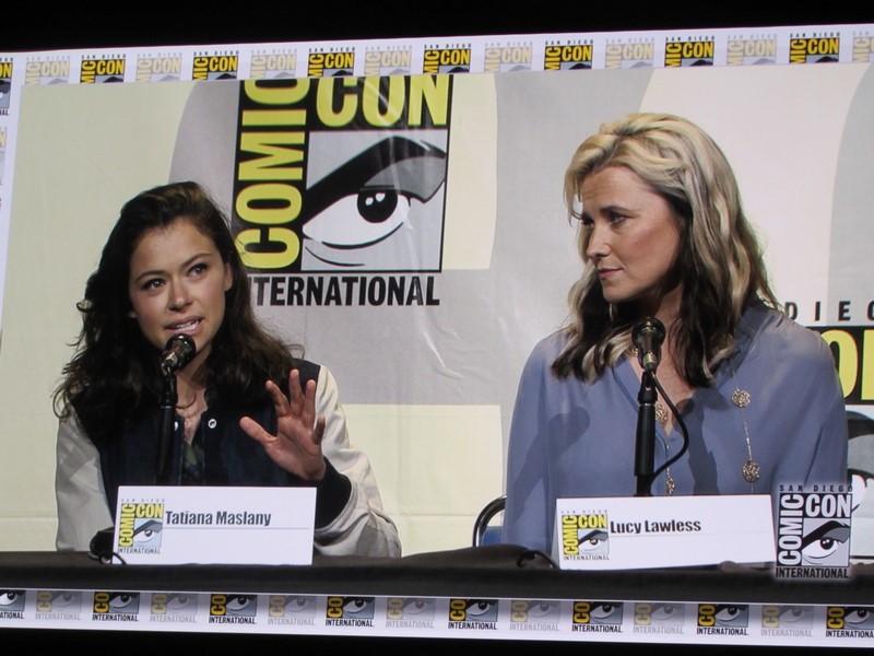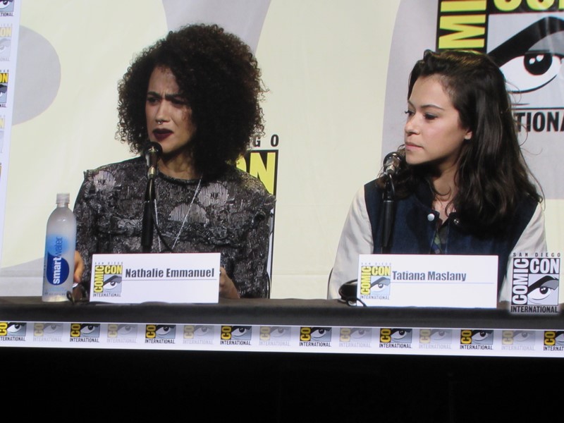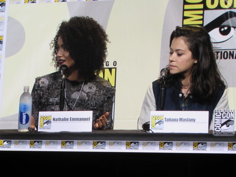 Another question was what was the role the panelists took that scared them to take it. Nielsen’s answer was her character in Boss because her character was unhappy and terrifying, while in her real life she was very happy. Emmanuel talked about being in Maze Runner: The Scorch Trials and how, being a British actress, that was scary for her as her first American film, because it was intimidating doing her American accent in front of Americans. Lawless said that all of her roles have scared her, but that Lucretia (Spartacus) was the scariest role she’s ever had. Maslany said that the fear is what makes her excited about a part — if she’s not afraid, then she’s not interested. Baccarin’s said that her biggest fear is having to be emotional.