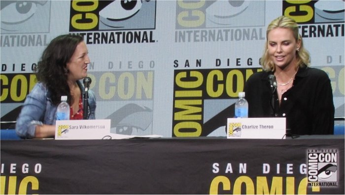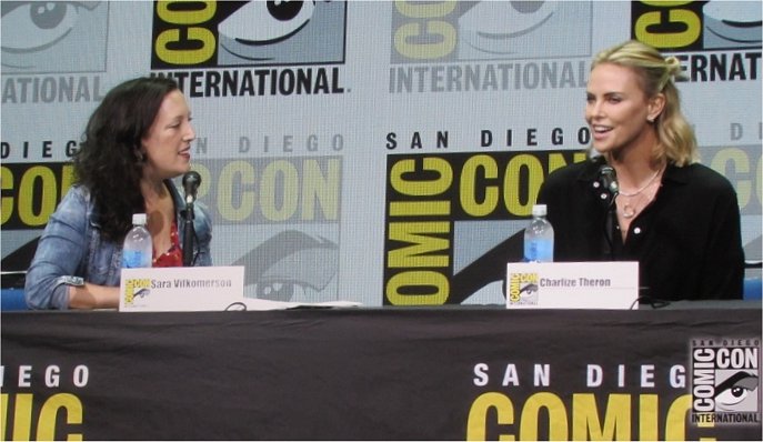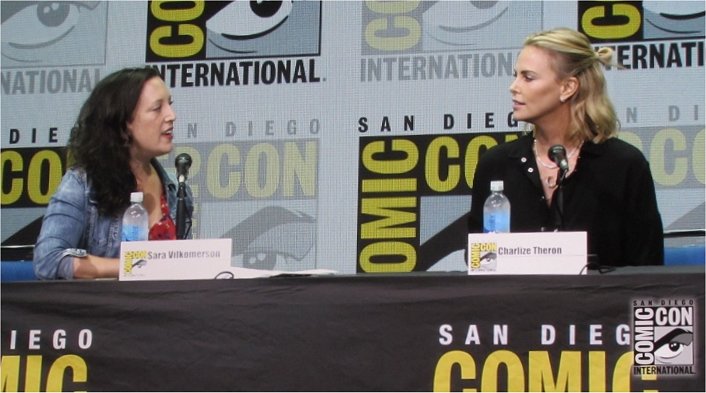Following a one hour intermission after the Warner Bros. panel in Hall H on Saturday, July 22 was Entertainment Weekly’s Women Who Kick Ass panel, which began at 2 pm. When Eddie Ibrahim came on stage to introduce this annual panel, he spoke about how it is close to his heart, and about its importance. He then introduced the moderator, Entertainment Weekly‘s Sara Vilkomerson. Usually this panel features several women, but for the first time this year, it focused on one woman, Charlize Theron, who came on stage and talked about her past roles, as well as her upcoming role in Atomic Blonde as a British spy in 1989.