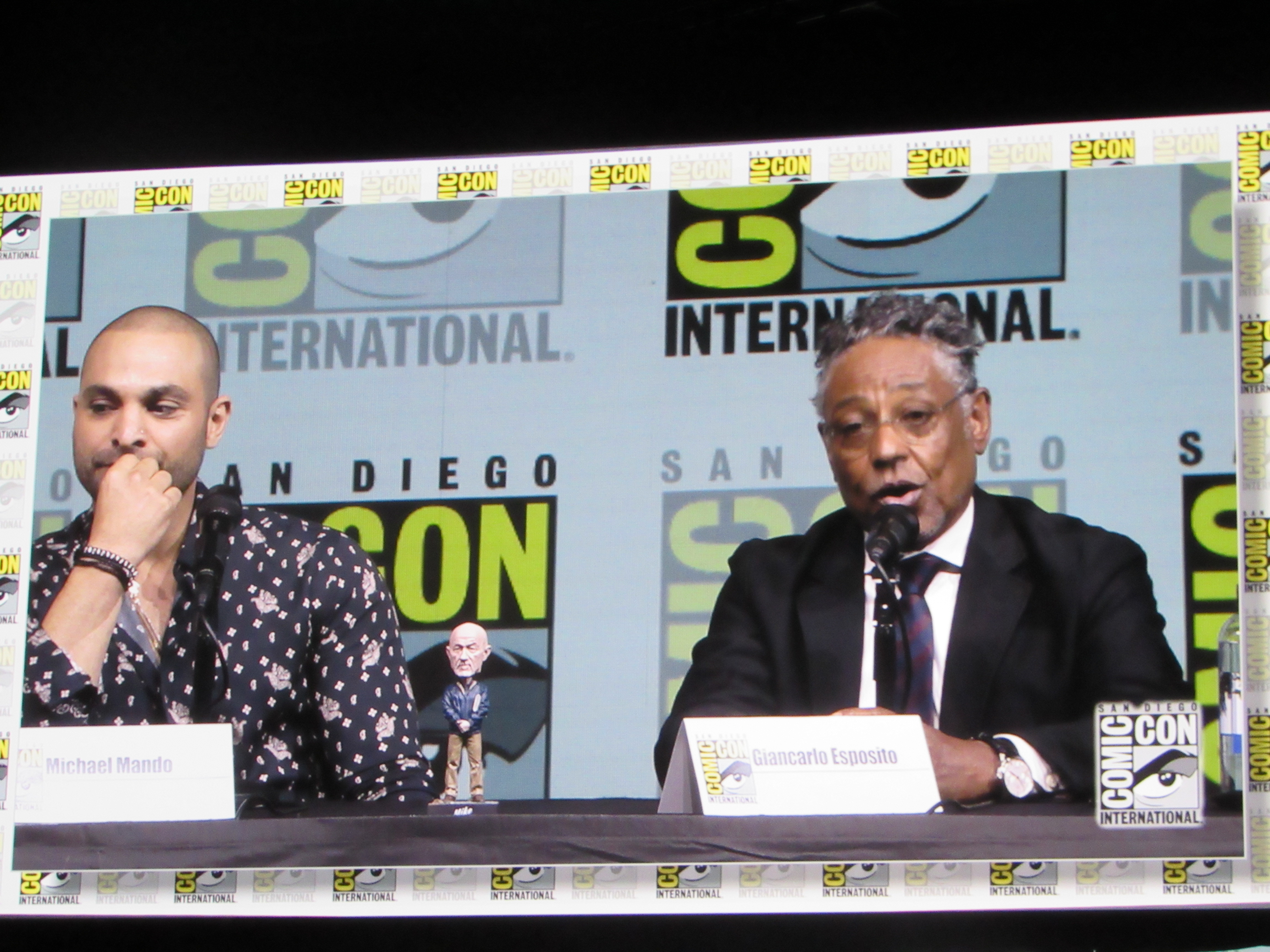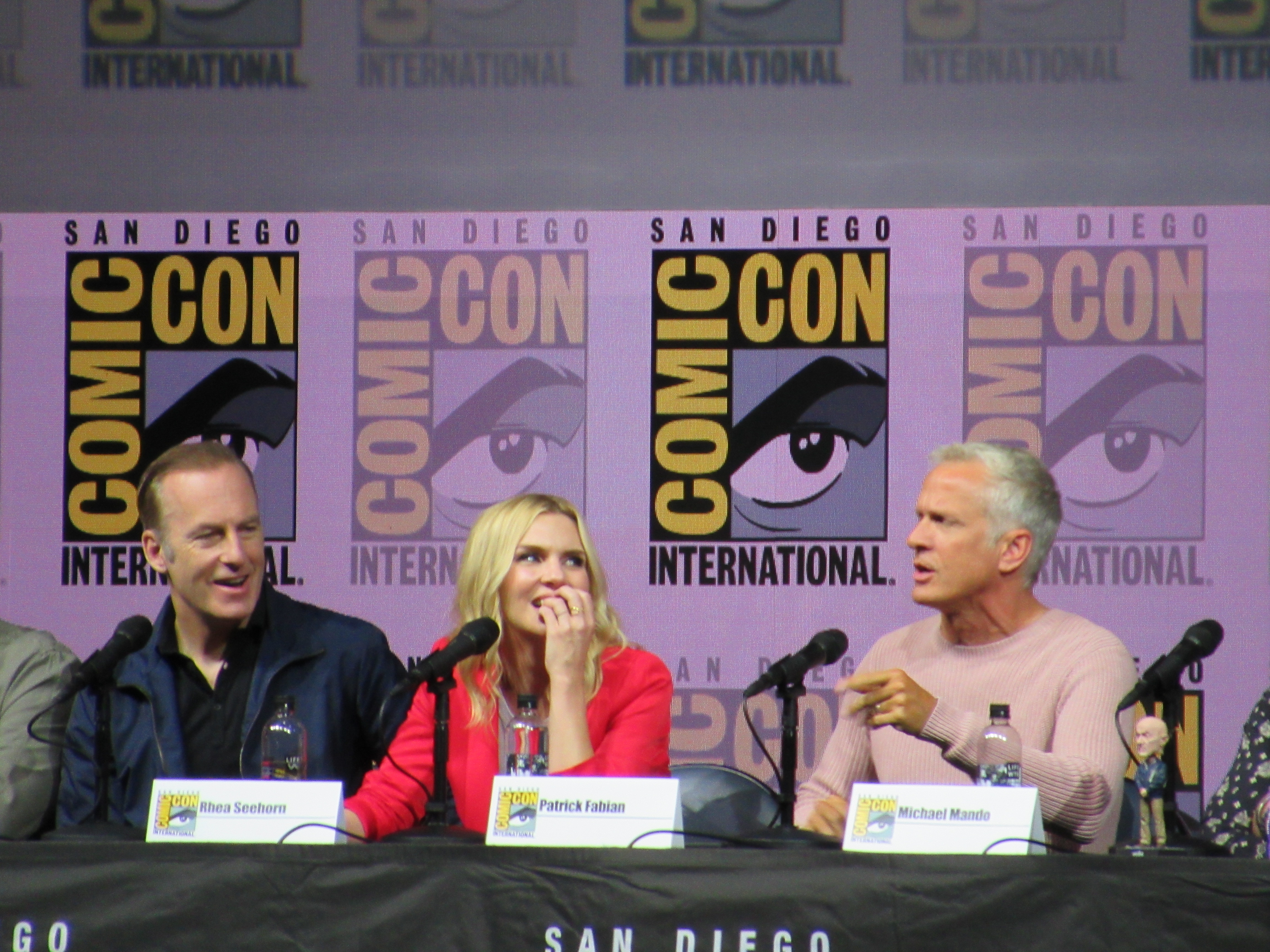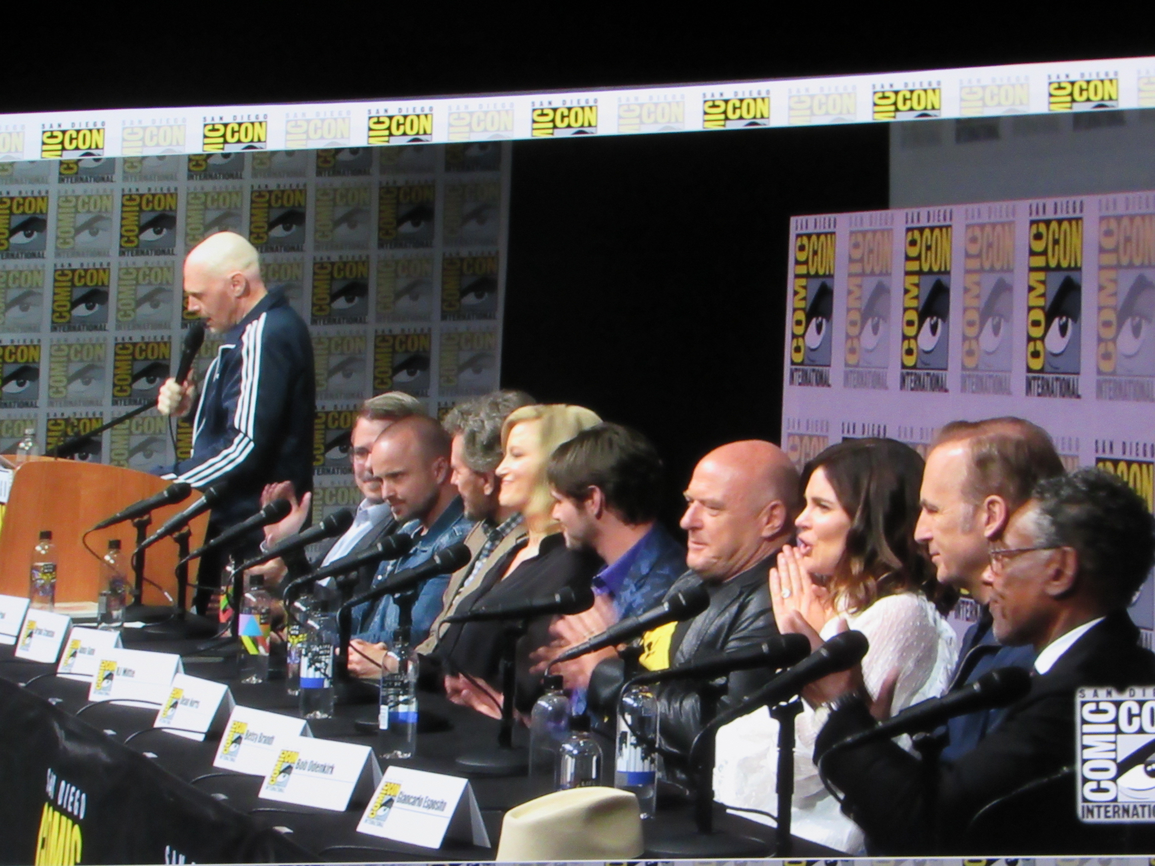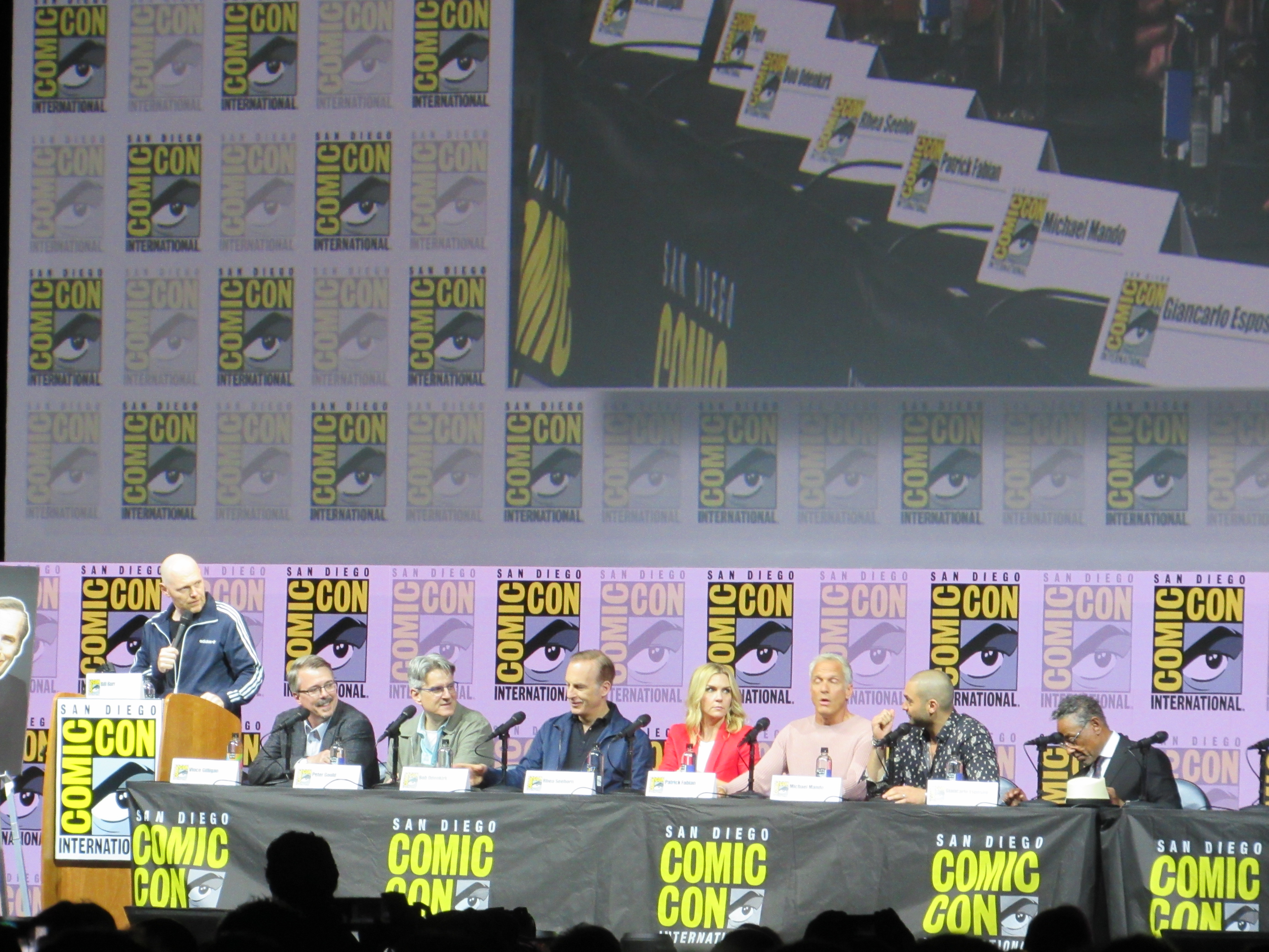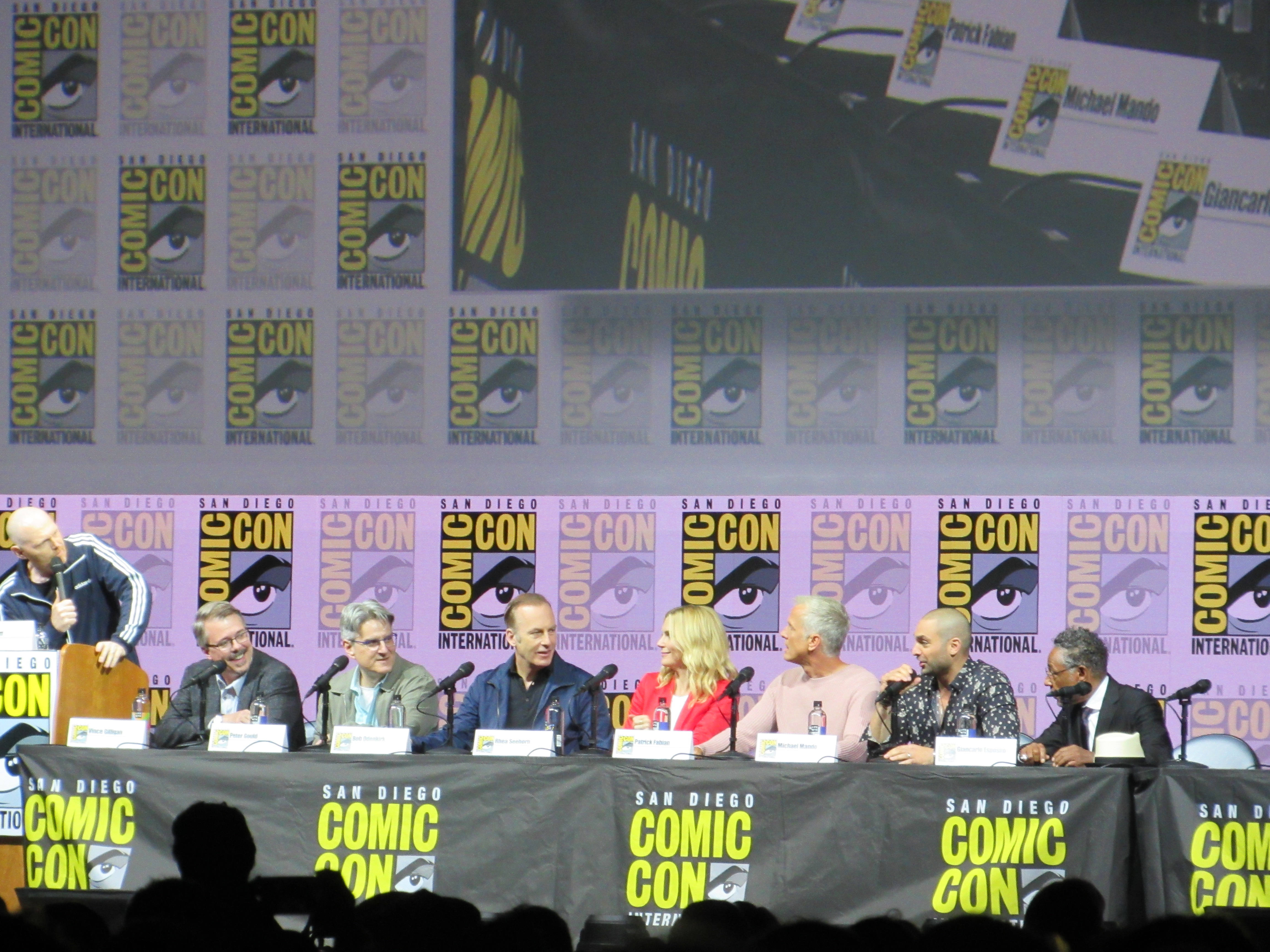 Panelists included creator Vince Gilligan, co-creator and executive producer Peter Gould, and cast members Bob Odenkirk (Jimmy), Rhea Seehorn (Kim), Patrick Fabian (Hamlin), Michael Mando (Nacho), and Giancarlo Esposito (Gus). Jonathan Banks (Mike) was unable to make it to the panel due to knee surgery, but he was represented in bobblehead form.