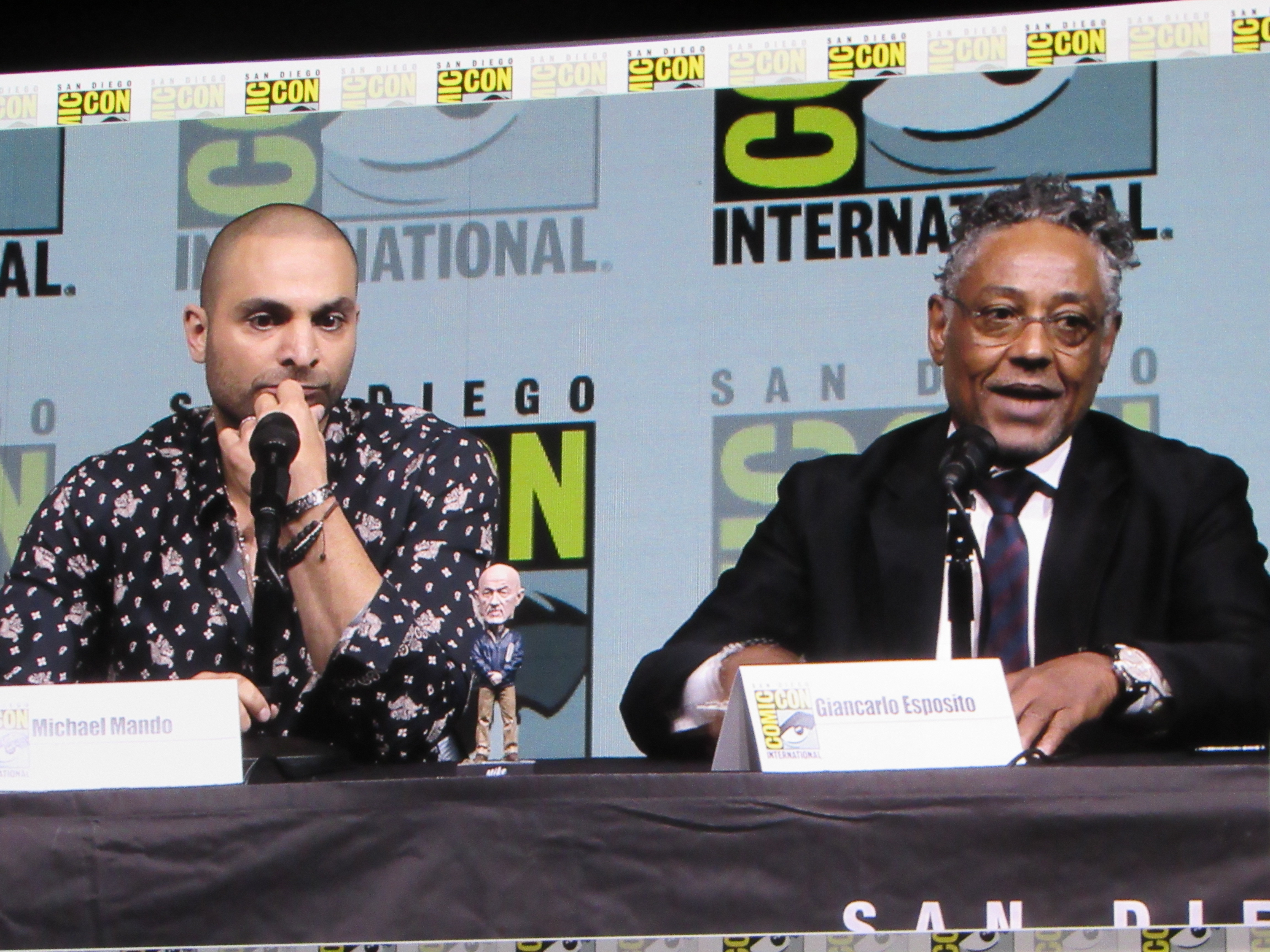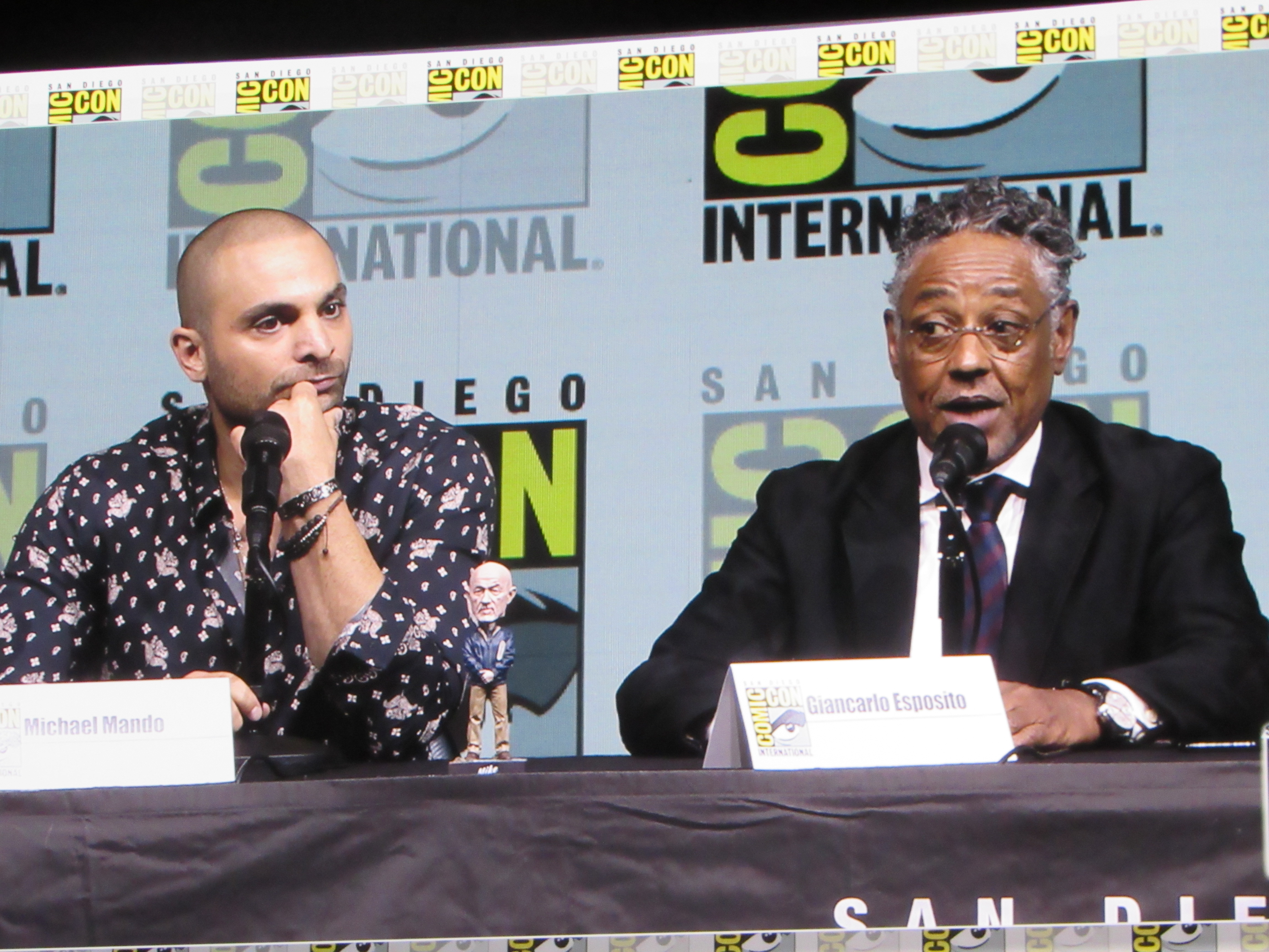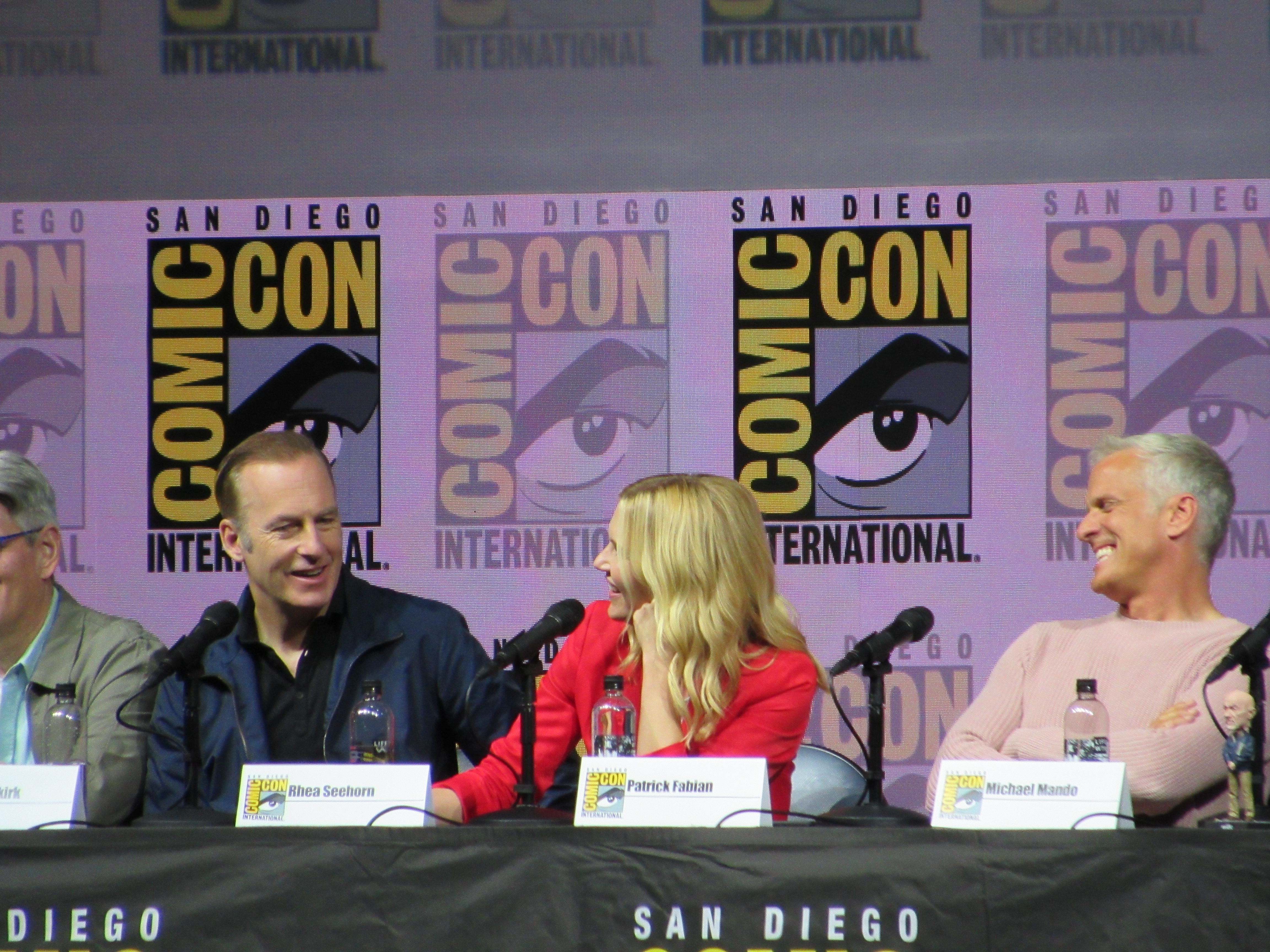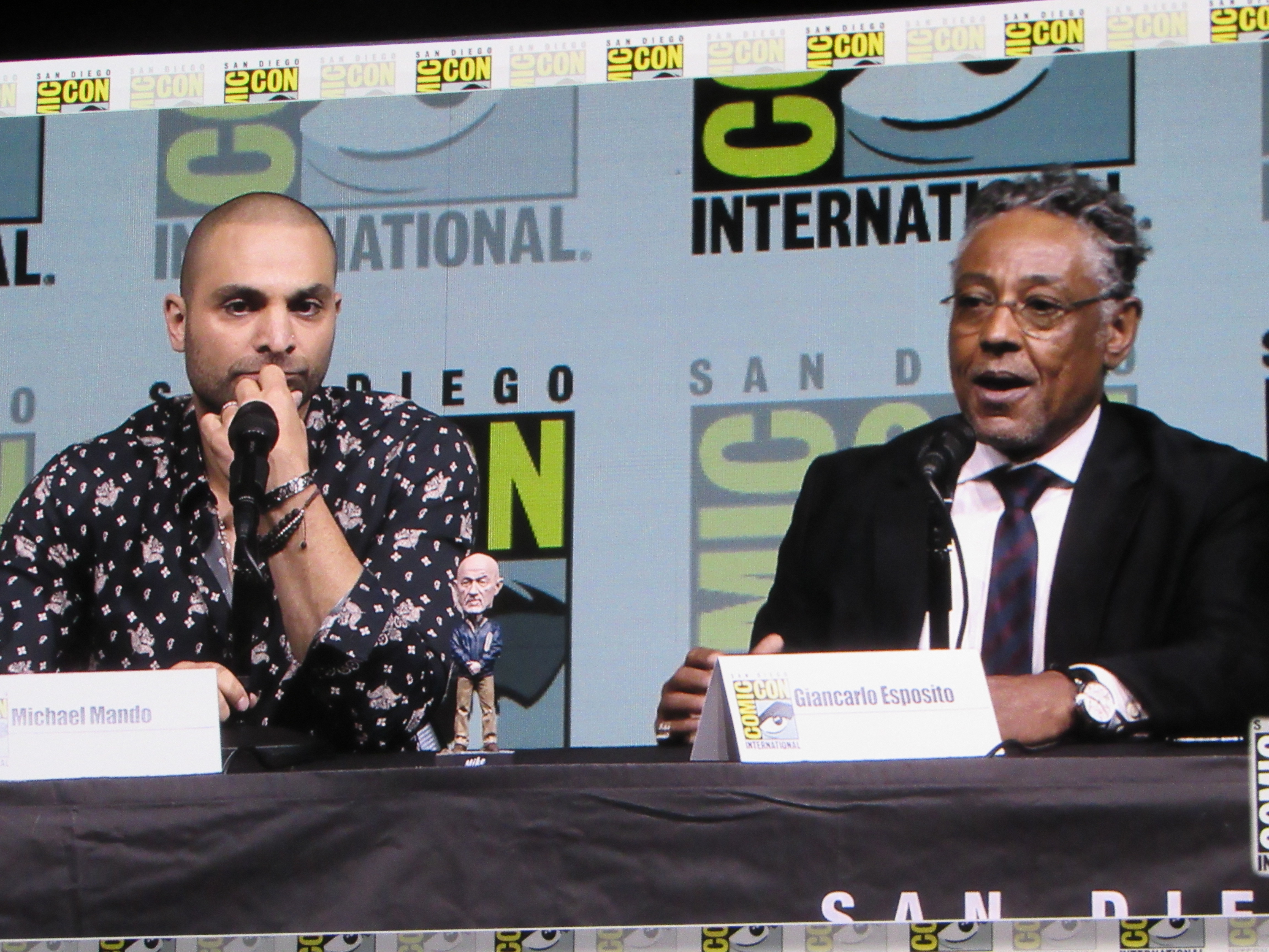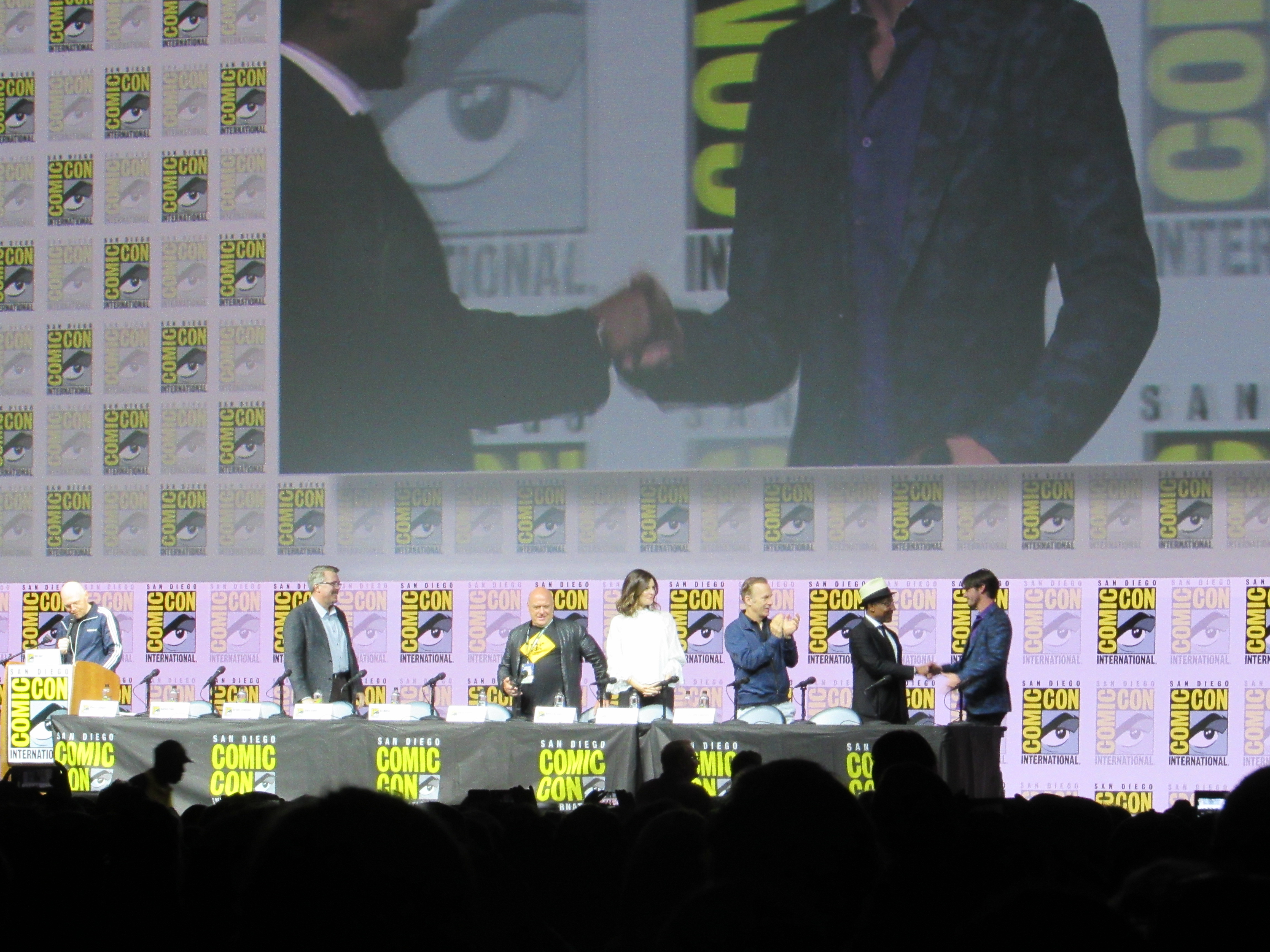 Panelists included creator Vince Gilligan, co-creator and executive producer Peter Gould, and cast members Bob Odenkirk (Jimmy), Rhea Seehorn (Kim), Patrick Fabian (Hamlin), Michael Mando (Nacho), and Giancarlo Esposito (Gus). Jonathan Banks (Mike) was unable to make it to the panel due to knee surgery, but he was represented in bobblehead form.
