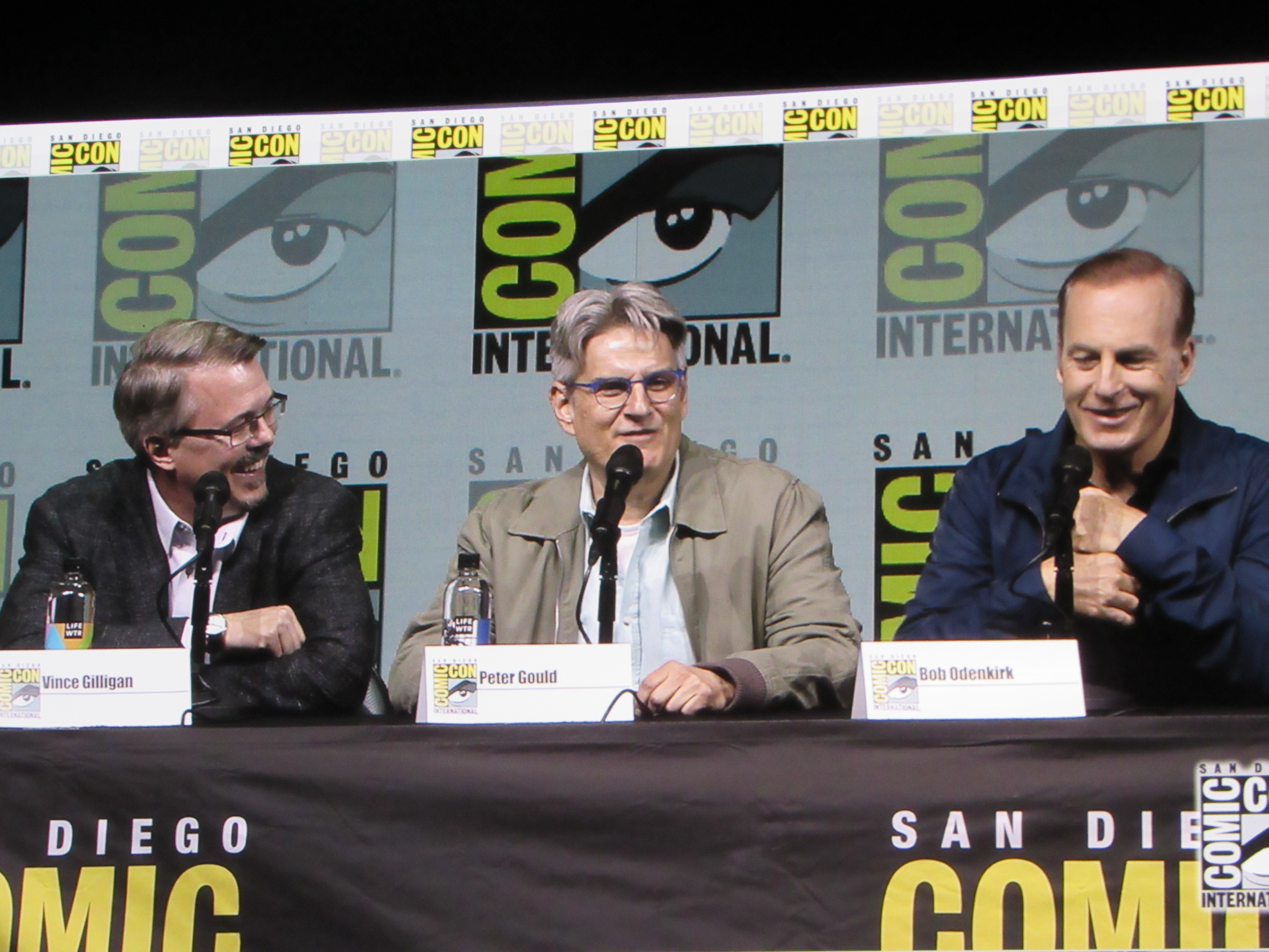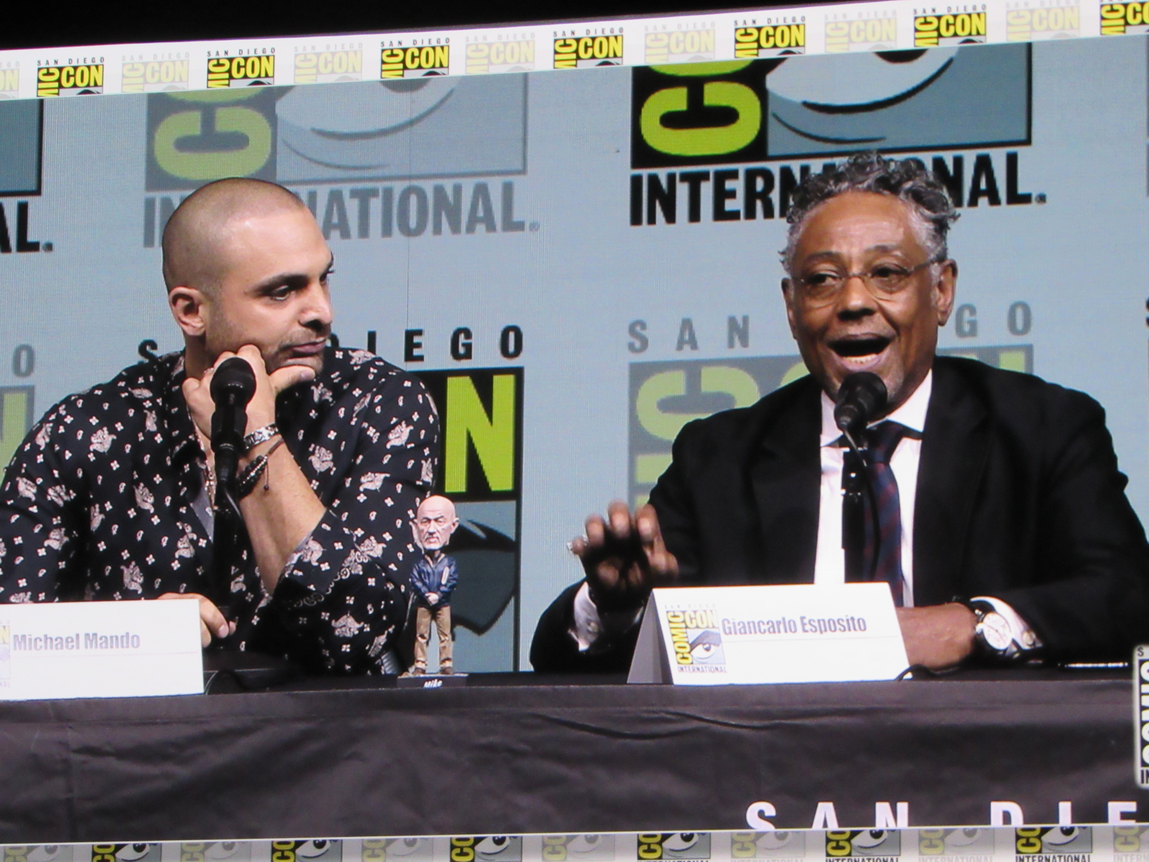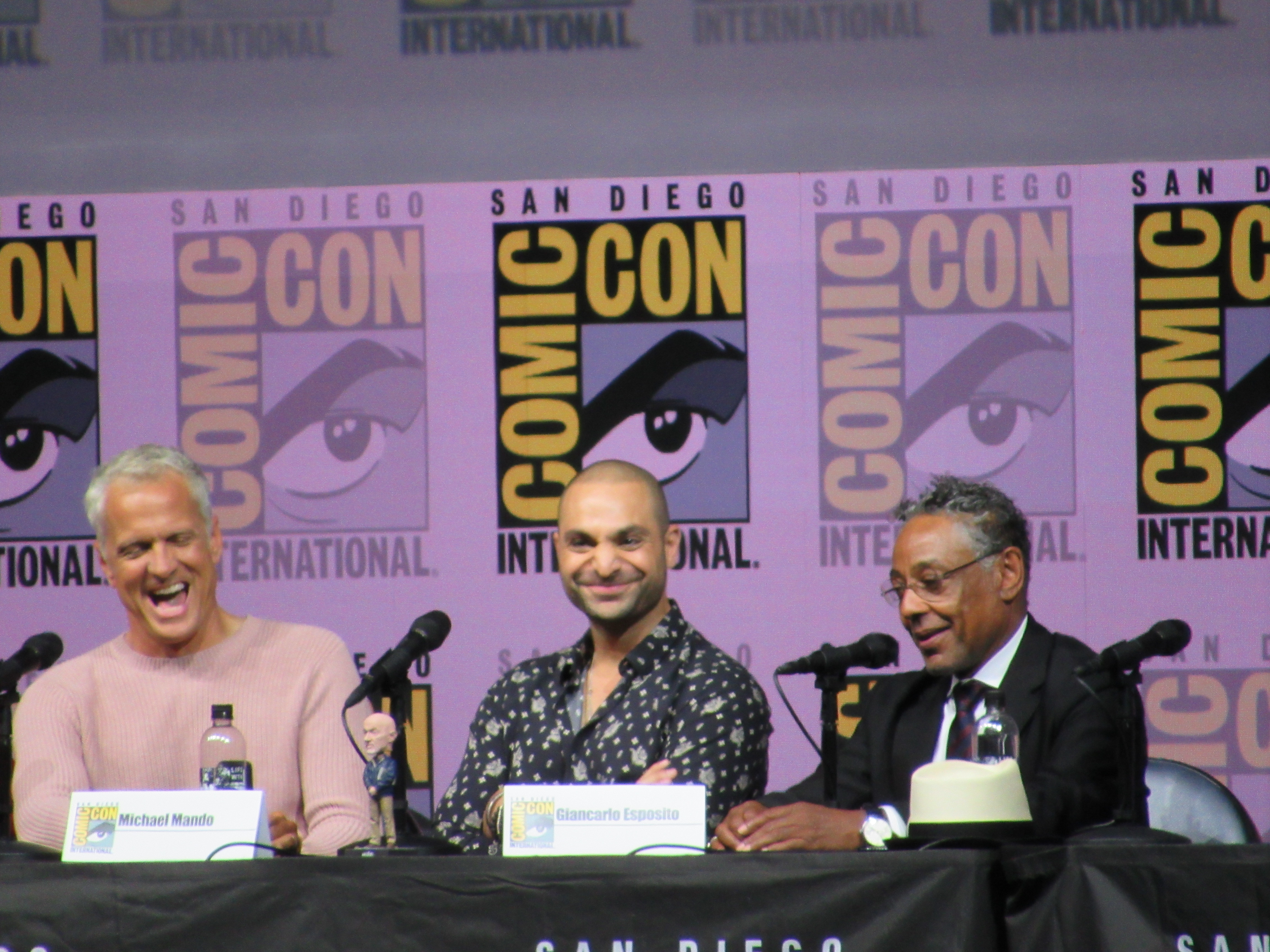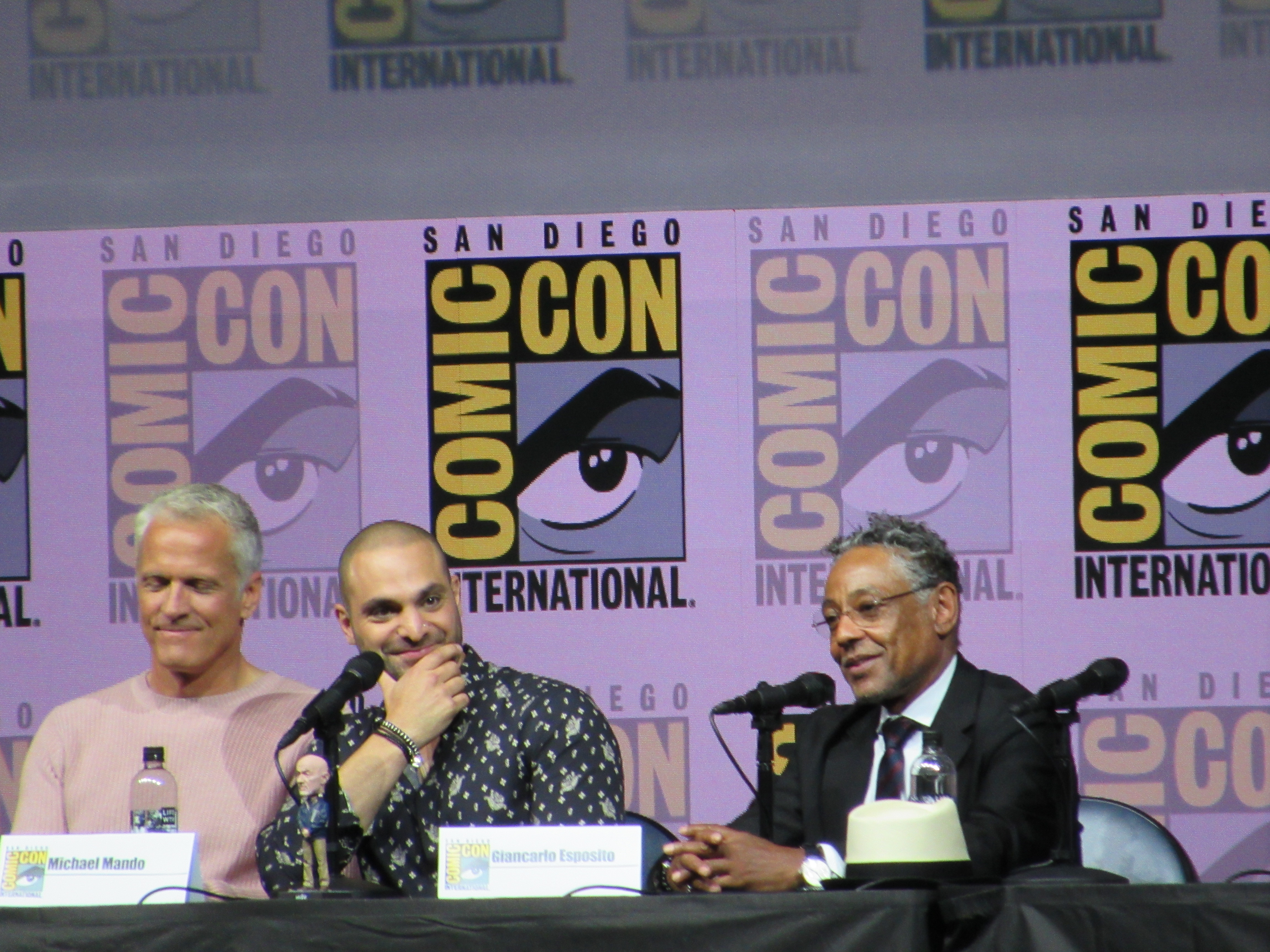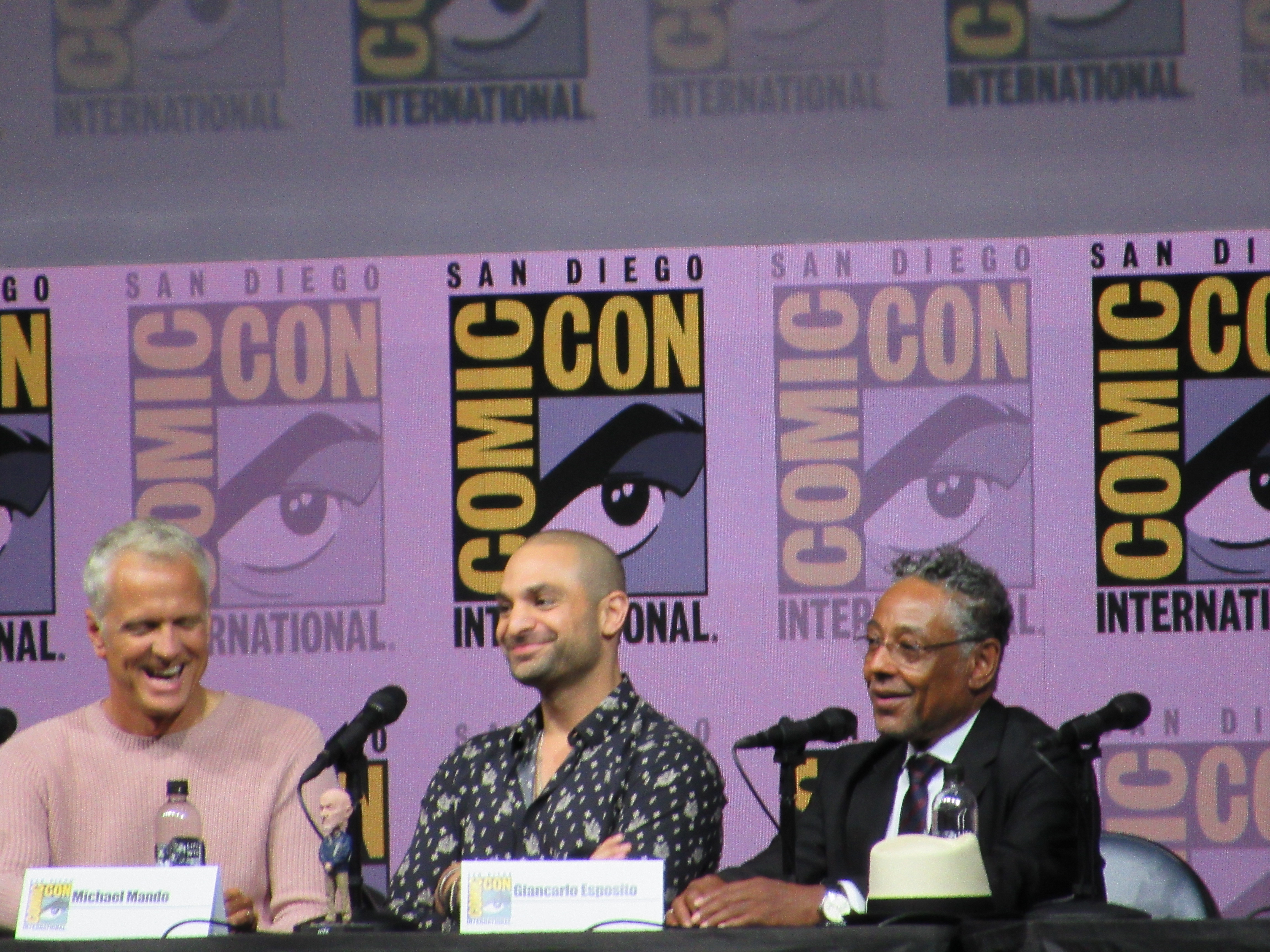 Panelists included creator Vince Gilligan, co-creator and executive producer Peter Gould, and cast members Bob Odenkirk (Jimmy), Rhea Seehorn (Kim), Patrick Fabian (Hamlin), Michael Mando (Nacho), and Giancarlo Esposito (Gus). Jonathan Banks (Mike) was unable to make it to the panel due to knee surgery, but he was represented in bobblehead form.