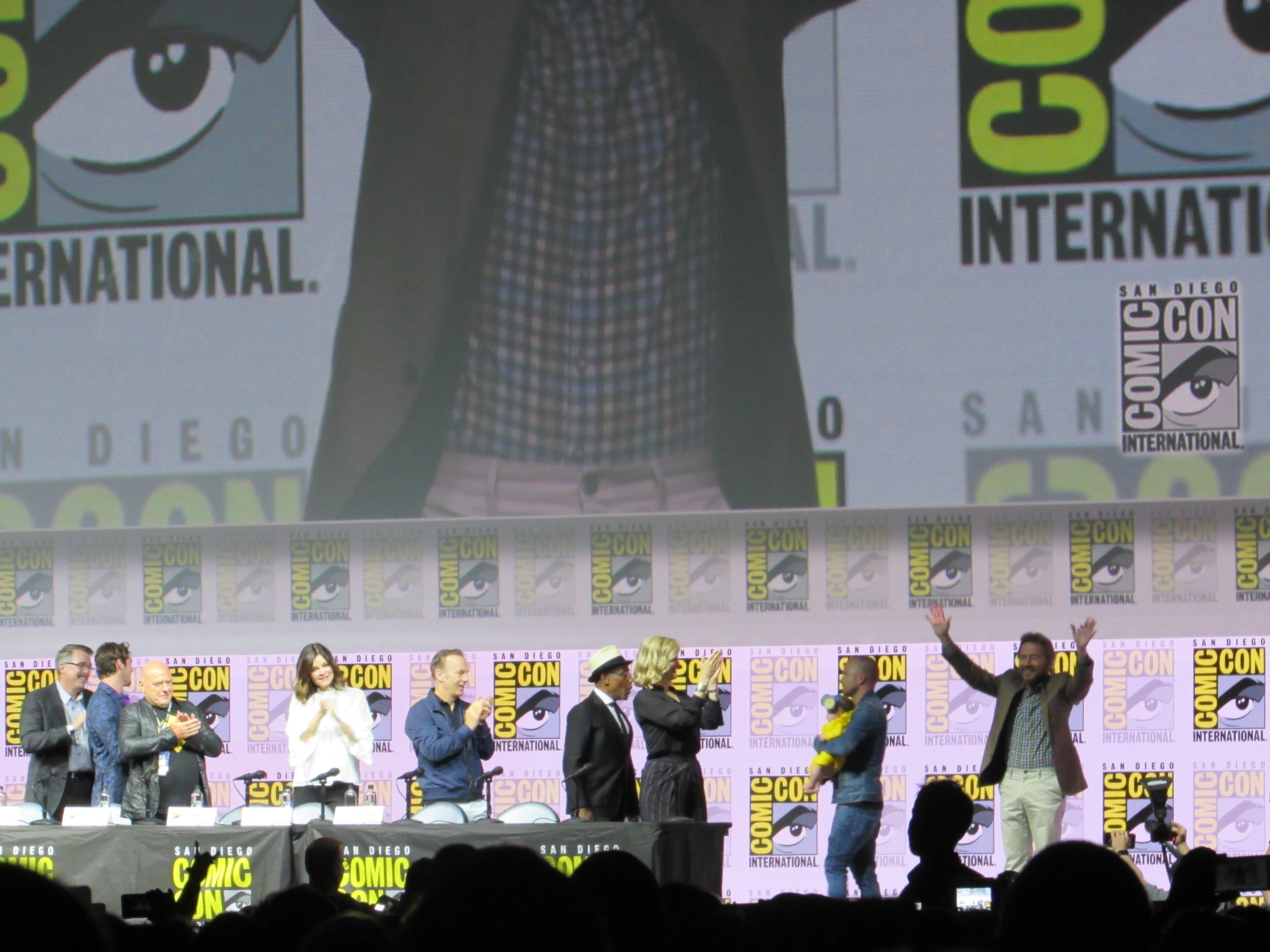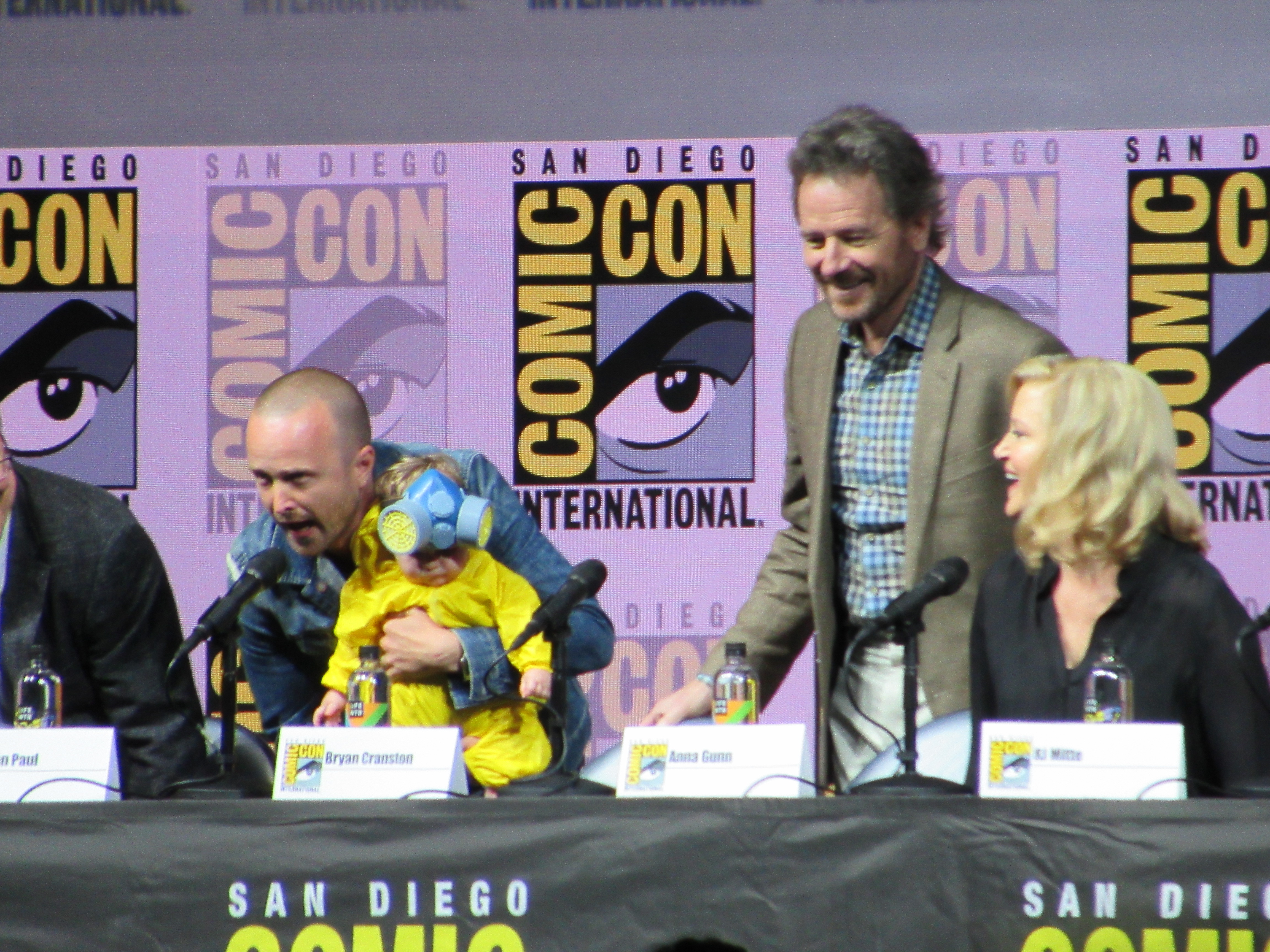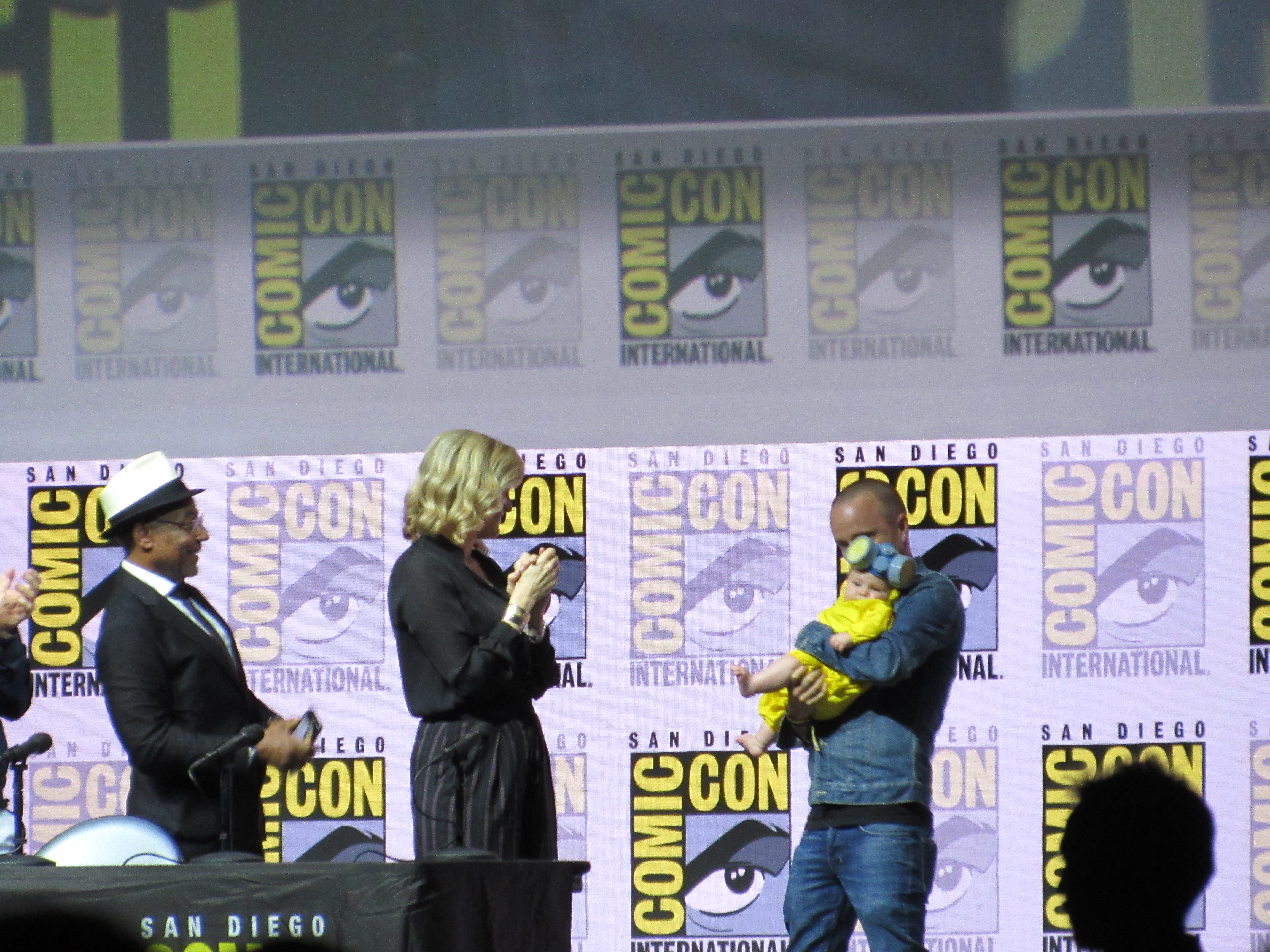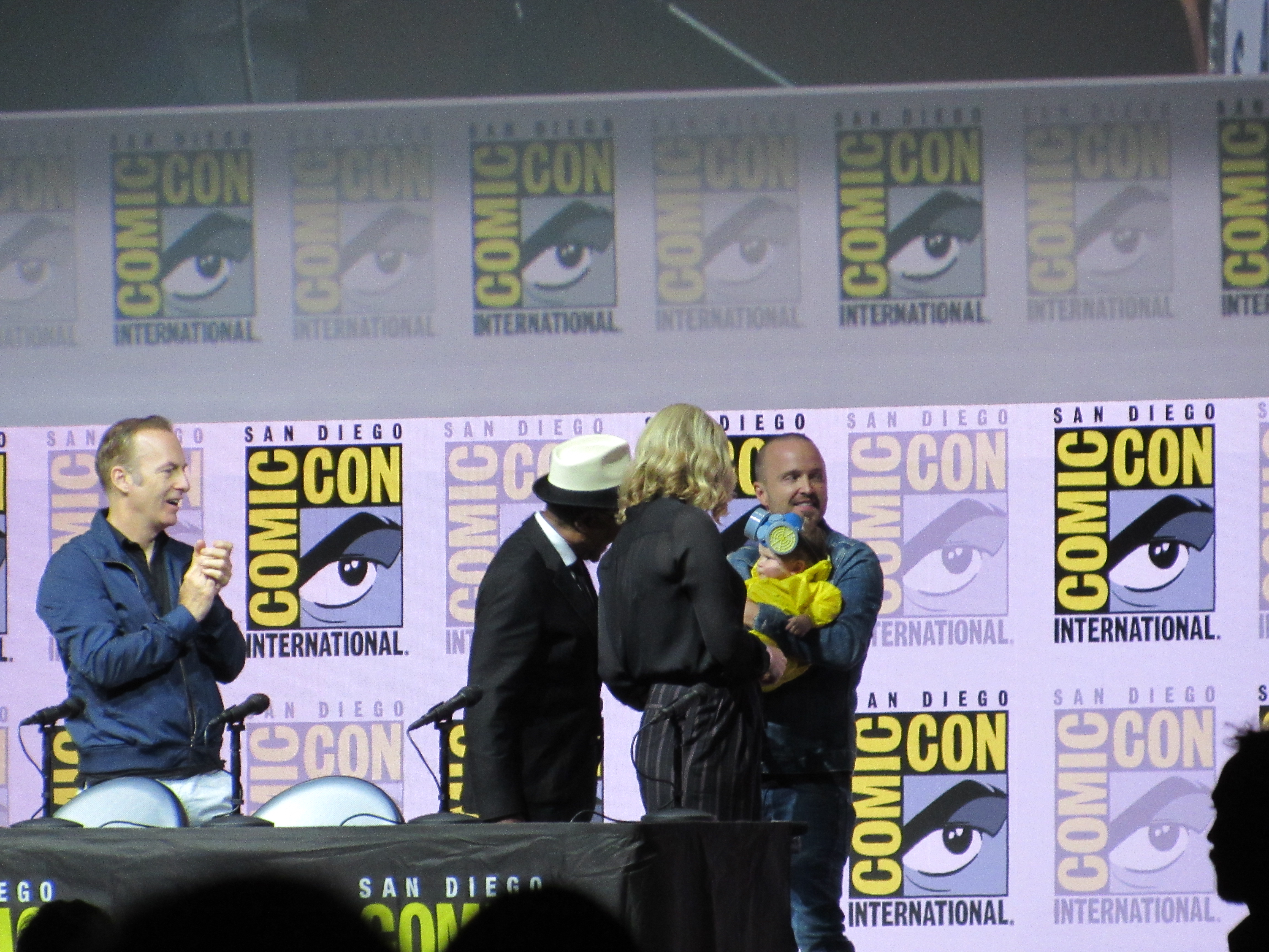 Bill Burr returned as moderator for the Breaking Bad panel, and Vince Gilligan, Bob Odenkirk, and Giancarlo Esposito returned as well. They were joined by cast members Betsy Brandt (Marie), Dean Norris (Hank), R.J. Mitte (Walt Jr.), Anna Gunn (Skyler), Aaron Paul (Jesse), and Bryan Cranston (Walt). Aaron Paul walked onstage holding his baby — who was wearing a hazmat suit! But then he asked his wife to come get the baby.