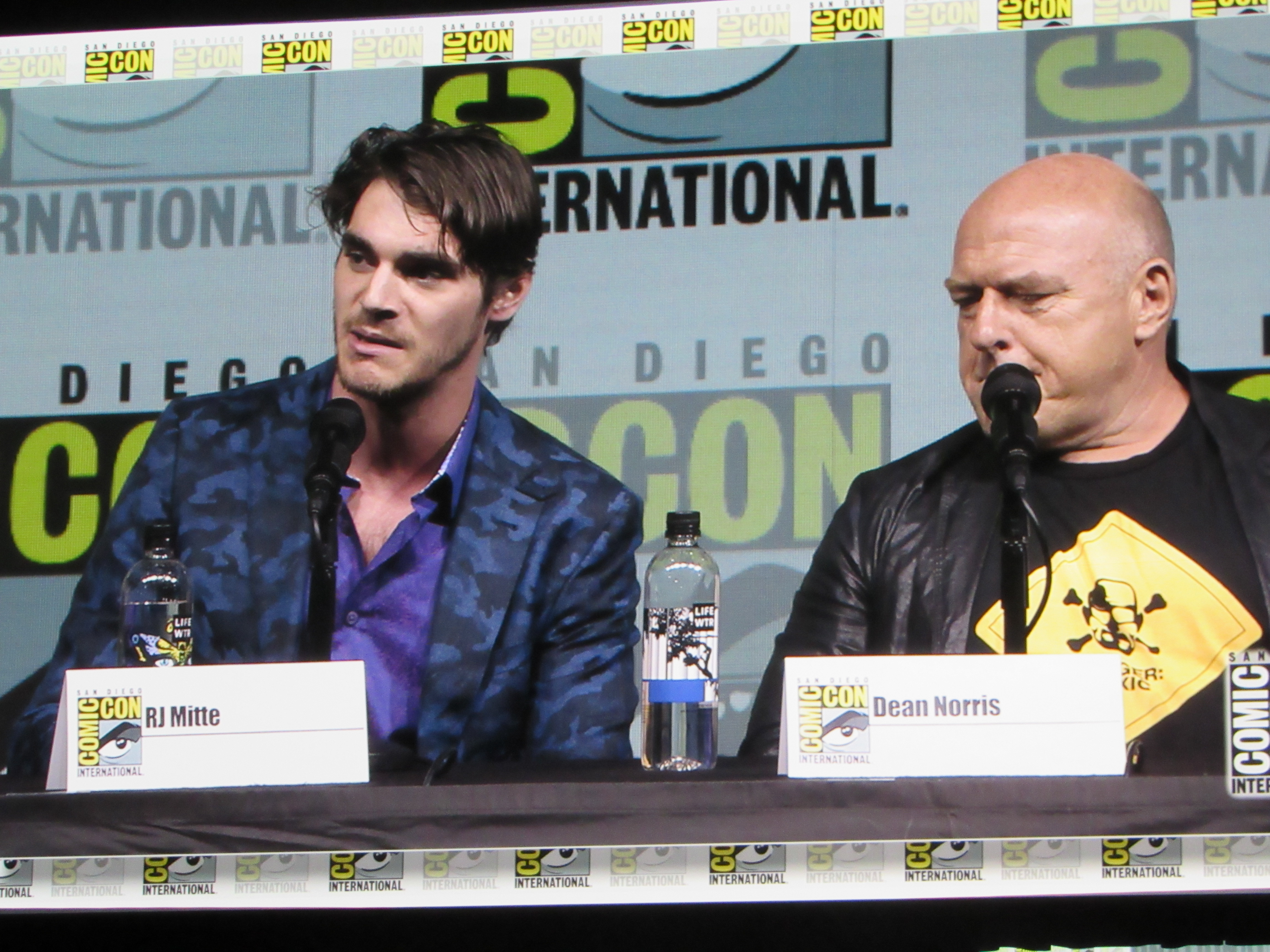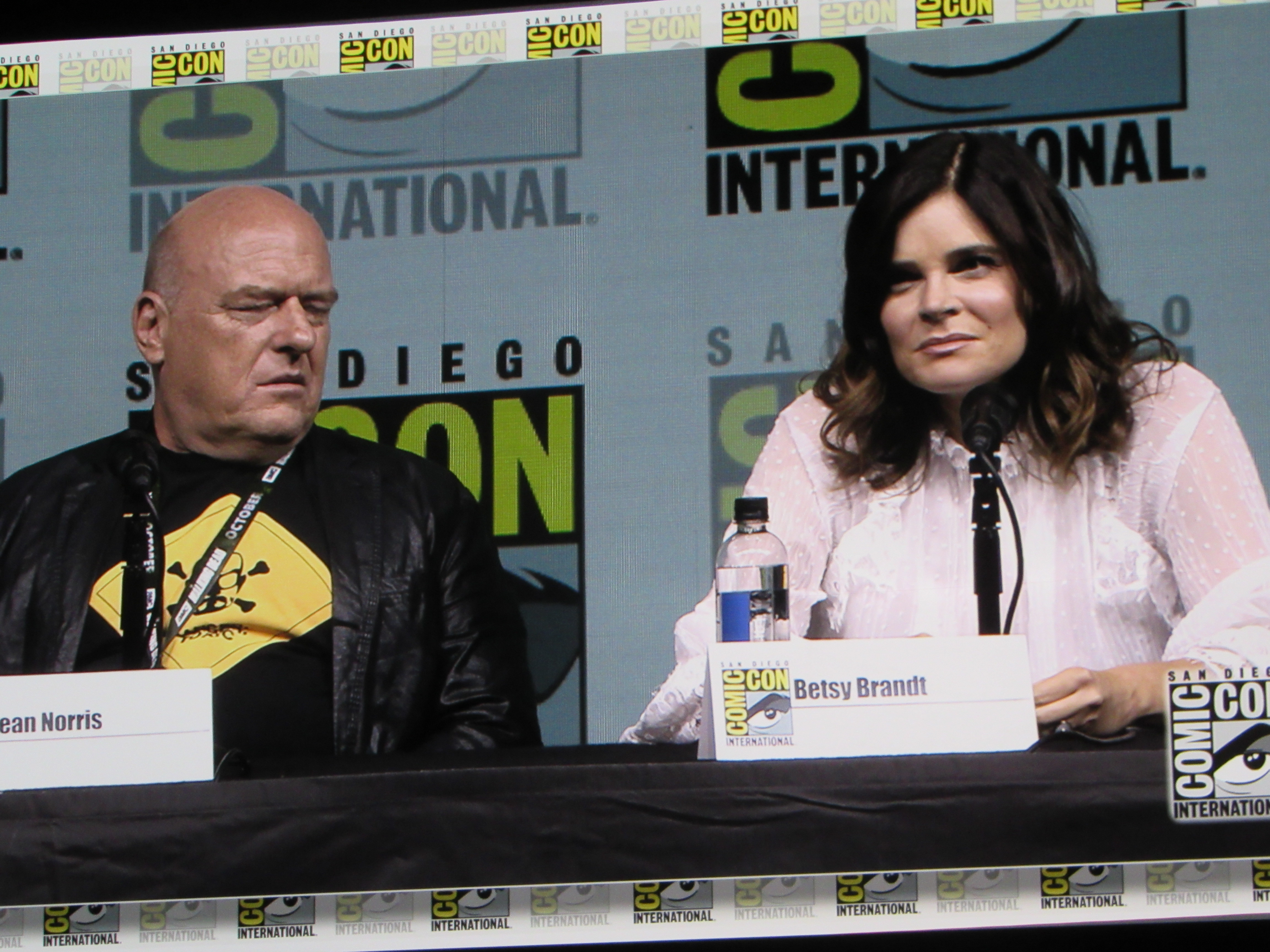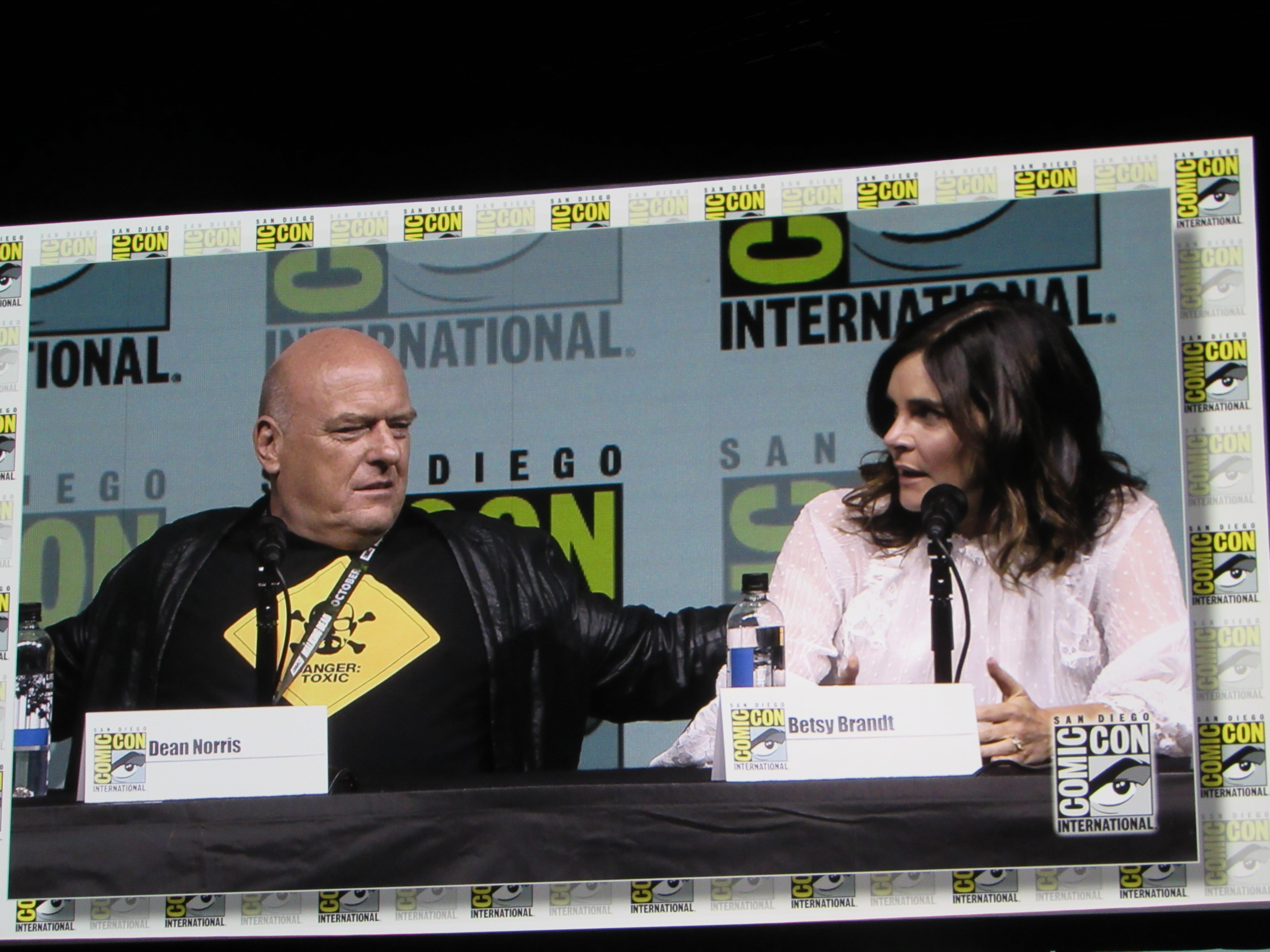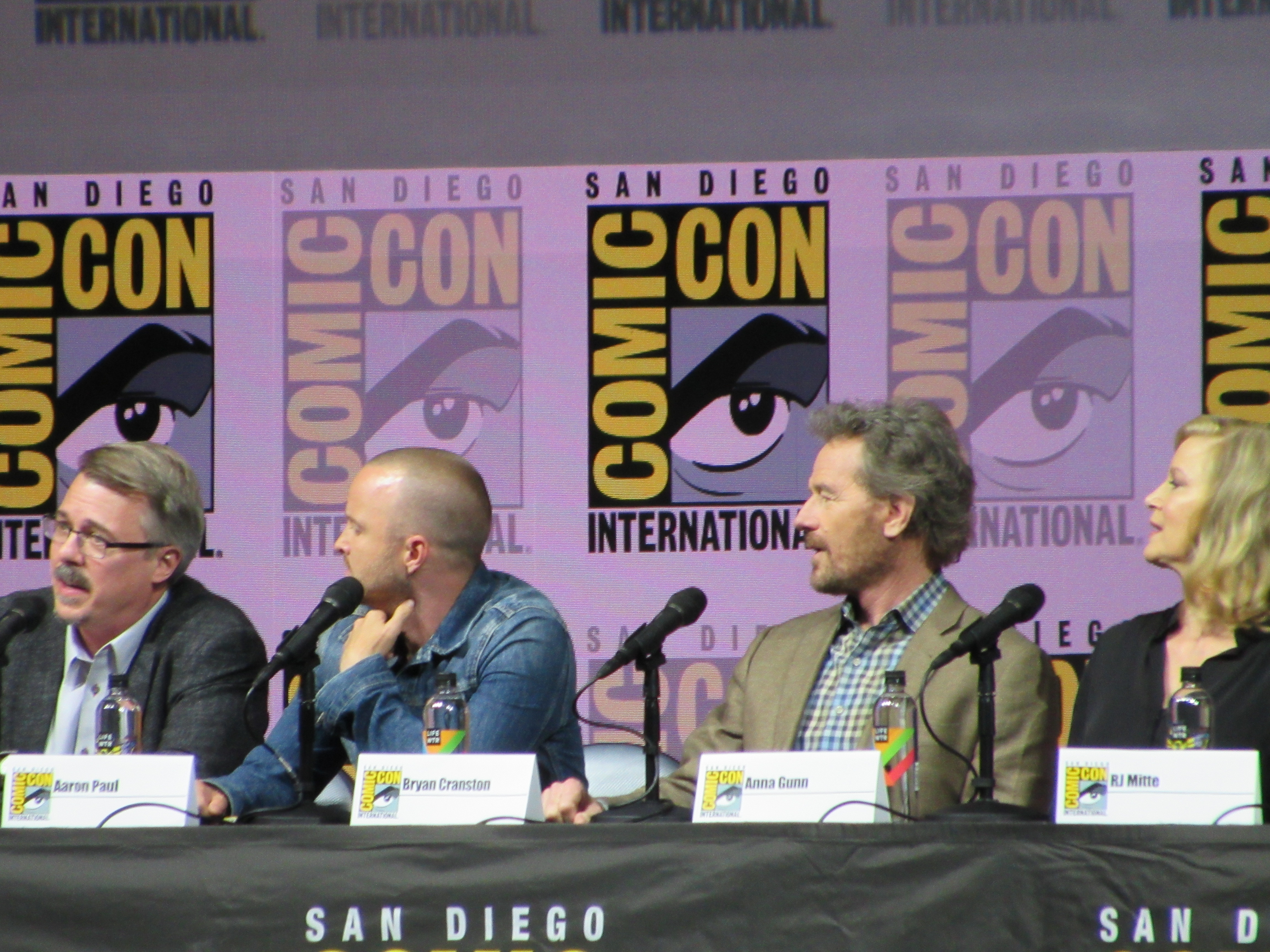 Bill Burr returned as moderator for the Breaking Bad panel, and Vince Gilligan, Bob Odenkirk, and Giancarlo Esposito returned as well. They were joined by cast members Betsy Brandt (Marie), Dean Norris (Hank), R.J. Mitte (Walt Jr.), Anna Gunn (Skyler), Aaron Paul (Jesse), and Bryan Cranston (Walt). Aaron Paul walked onstage holding his baby — who was wearing a hazmat suit! But then he asked his wife to come get the baby.