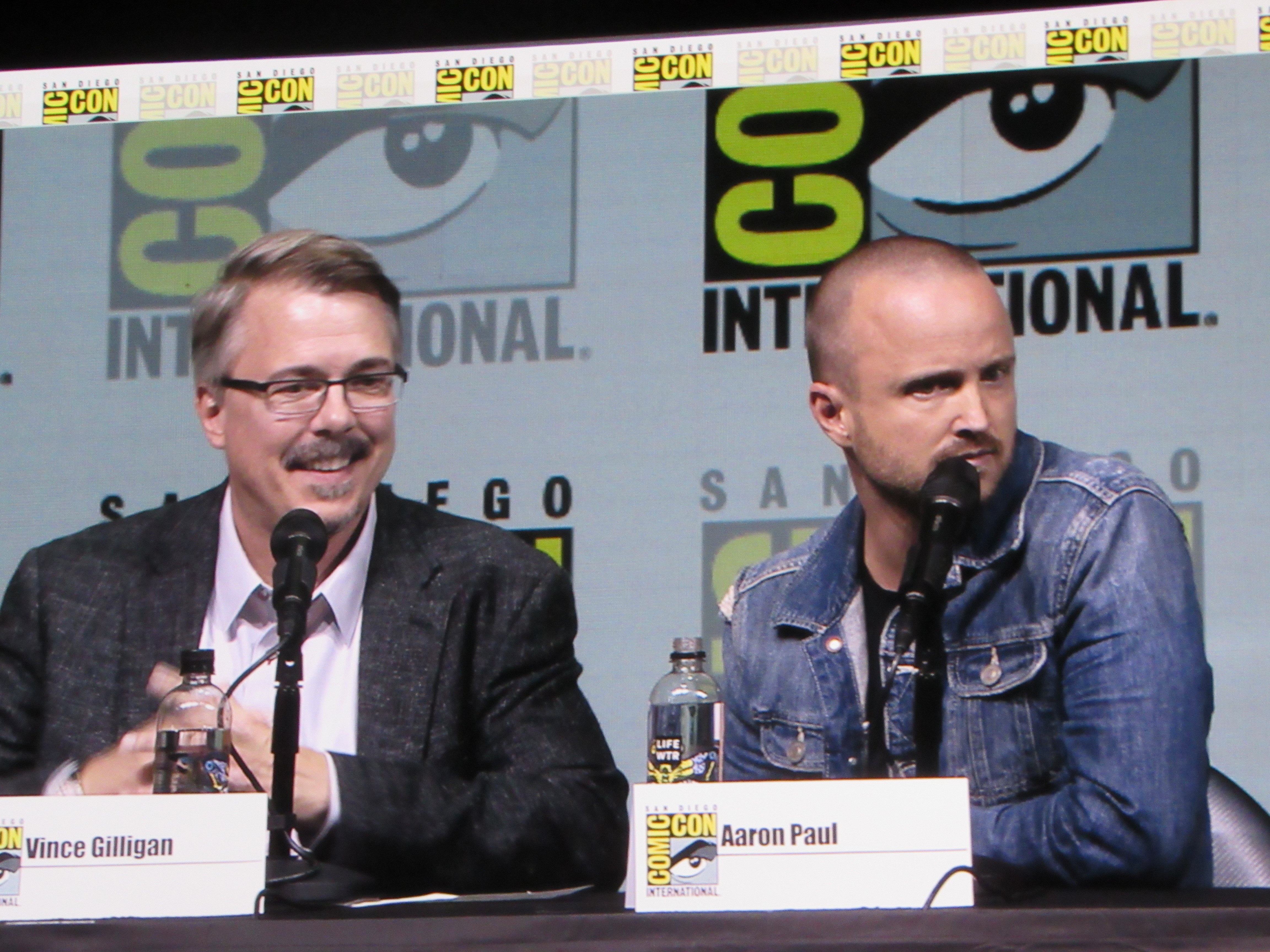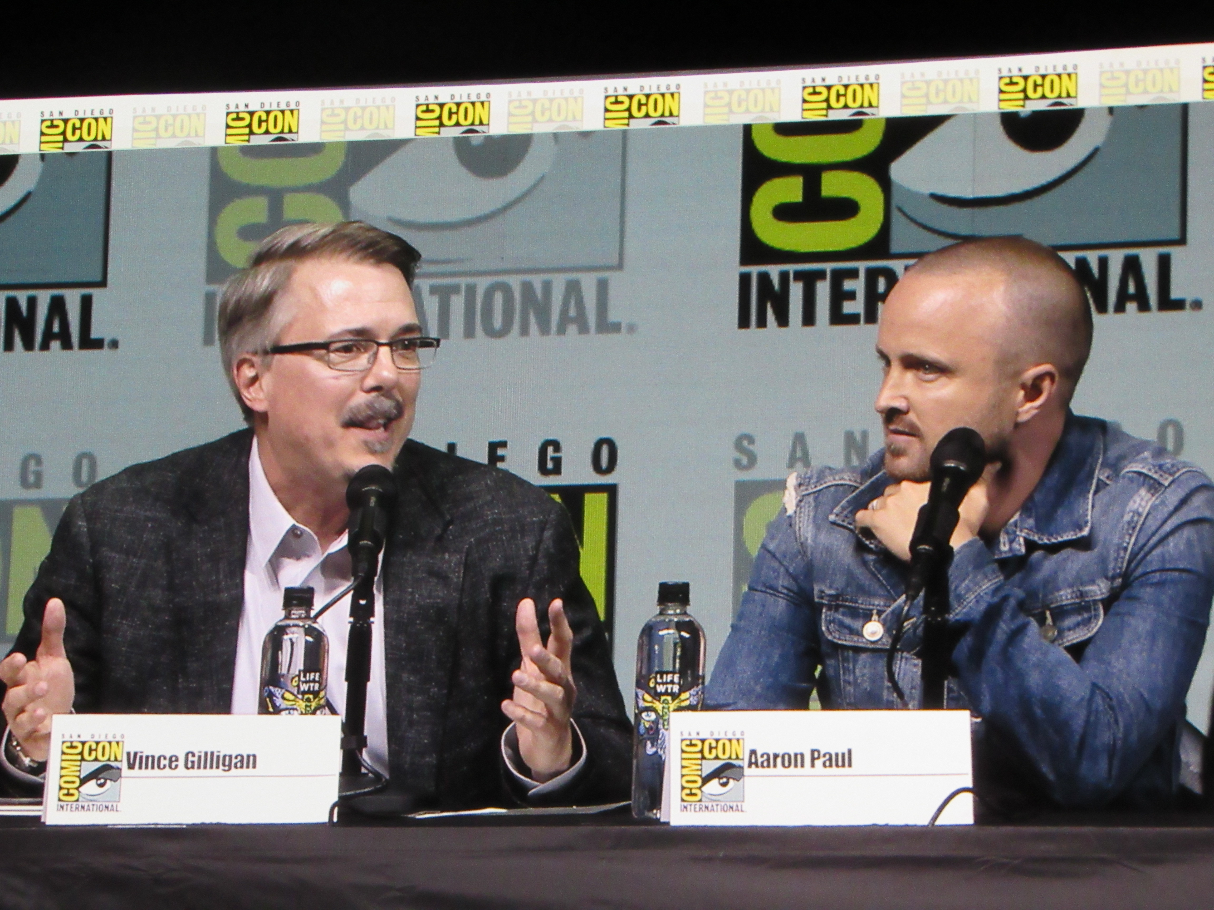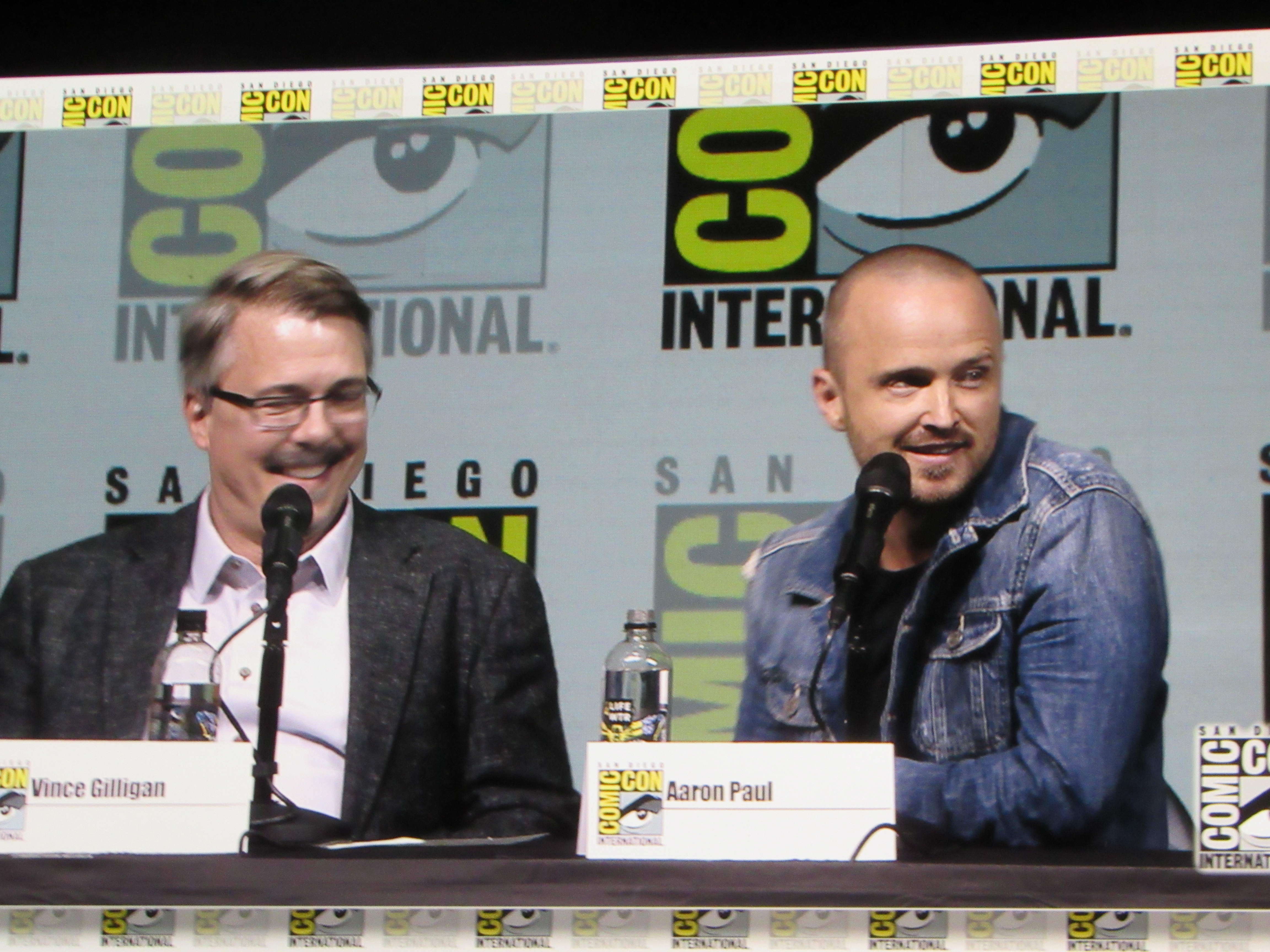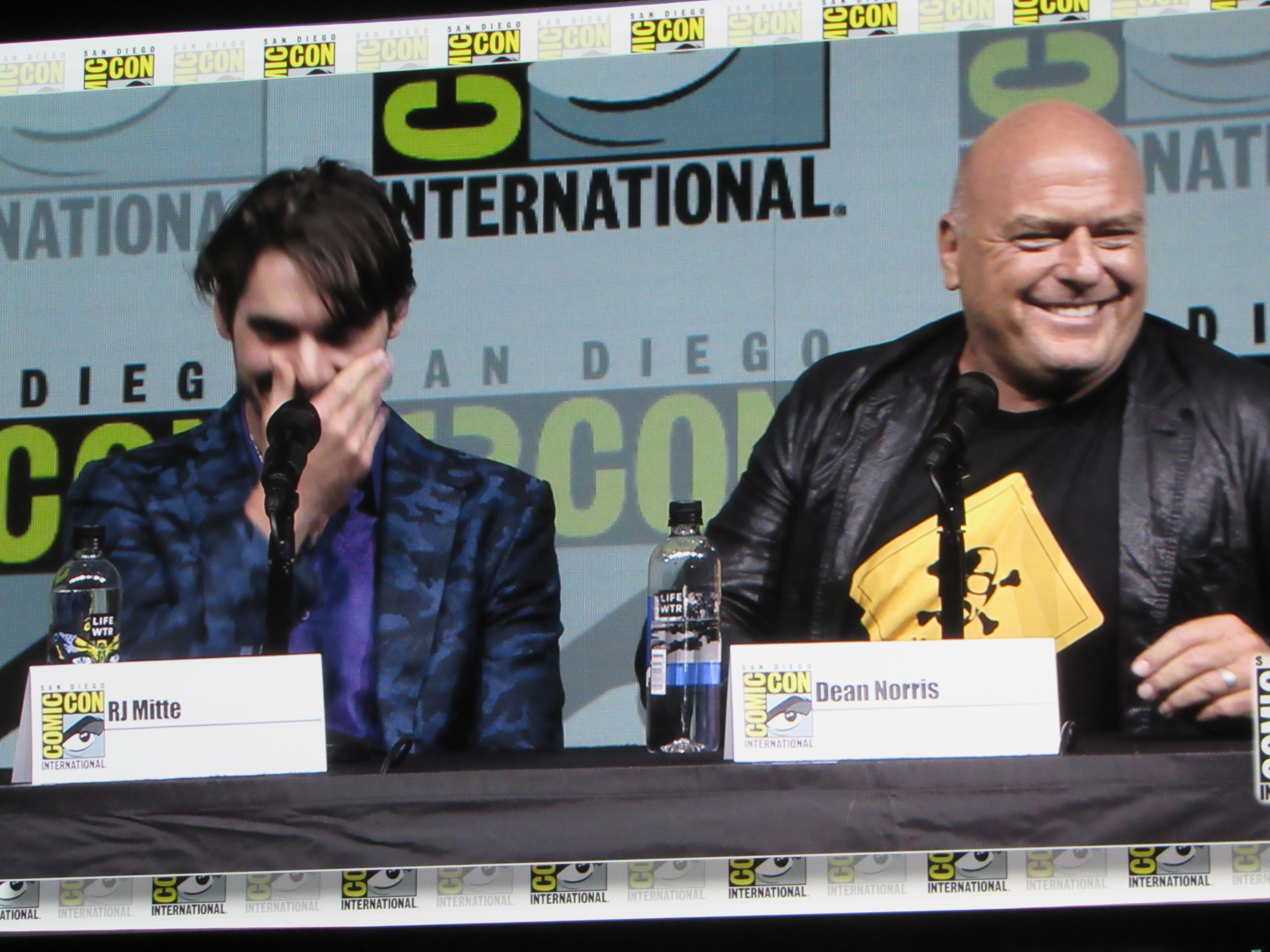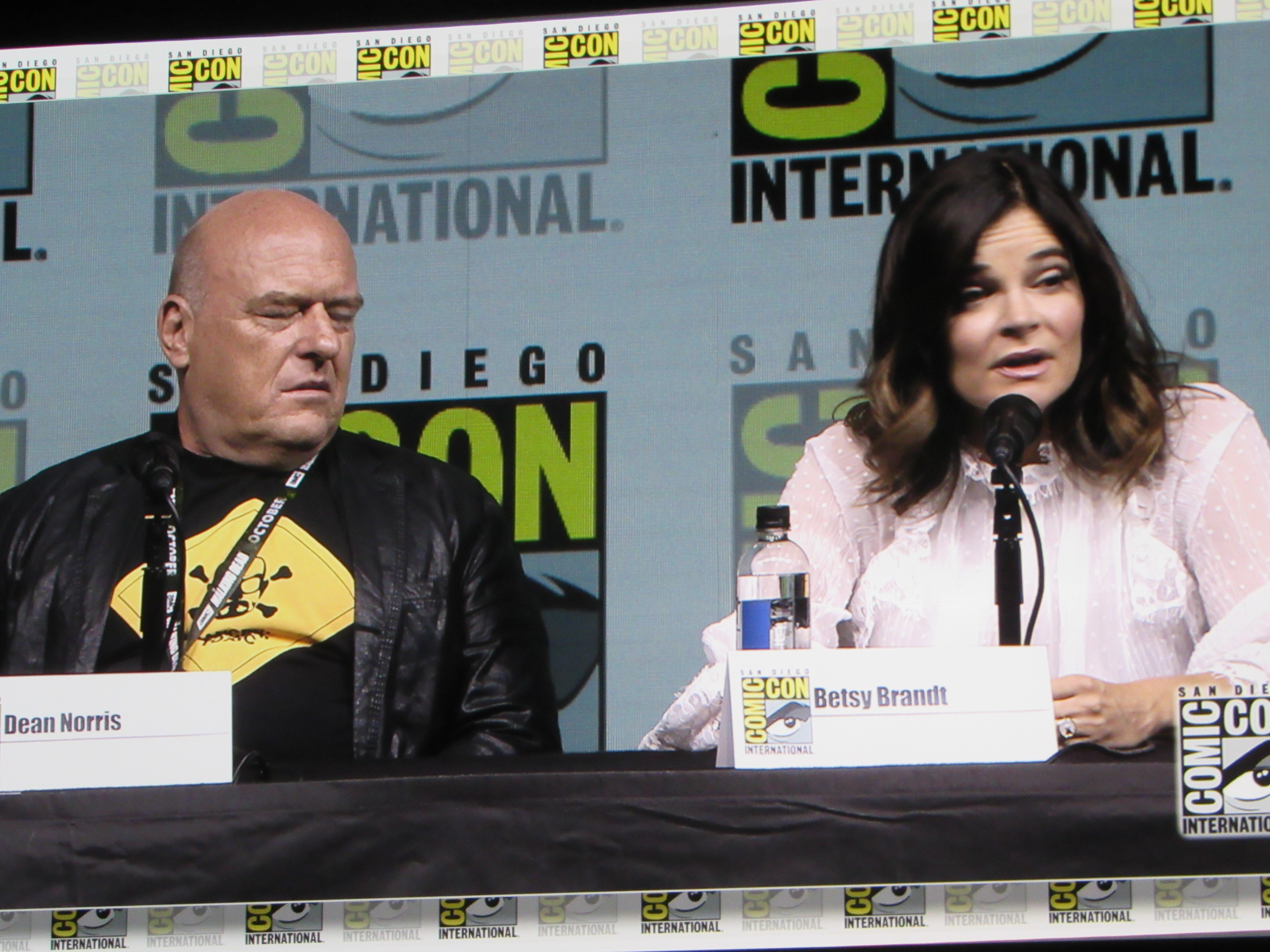 Bill Burr returned as moderator for the Breaking Bad panel, and Vince Gilligan, Bob Odenkirk, and Giancarlo Esposito returned as well. They were joined by cast members Betsy Brandt (Marie), Dean Norris (Hank), R.J. Mitte (Walt Jr.), Anna Gunn (Skyler), Aaron Paul (Jesse), and Bryan Cranston (Walt). Aaron Paul walked onstage holding his baby — who was wearing a hazmat suit! But then he asked his wife to come get the baby.