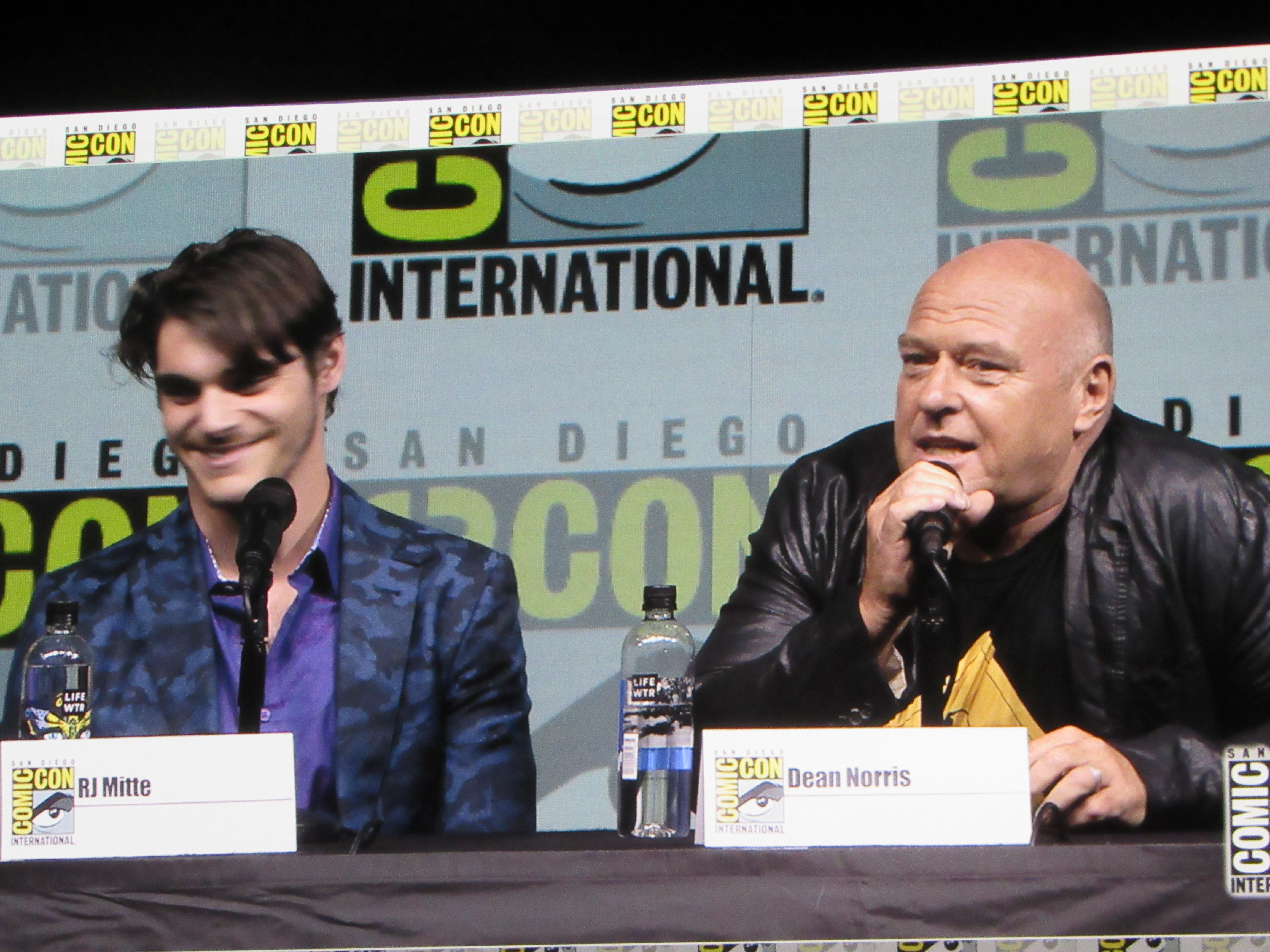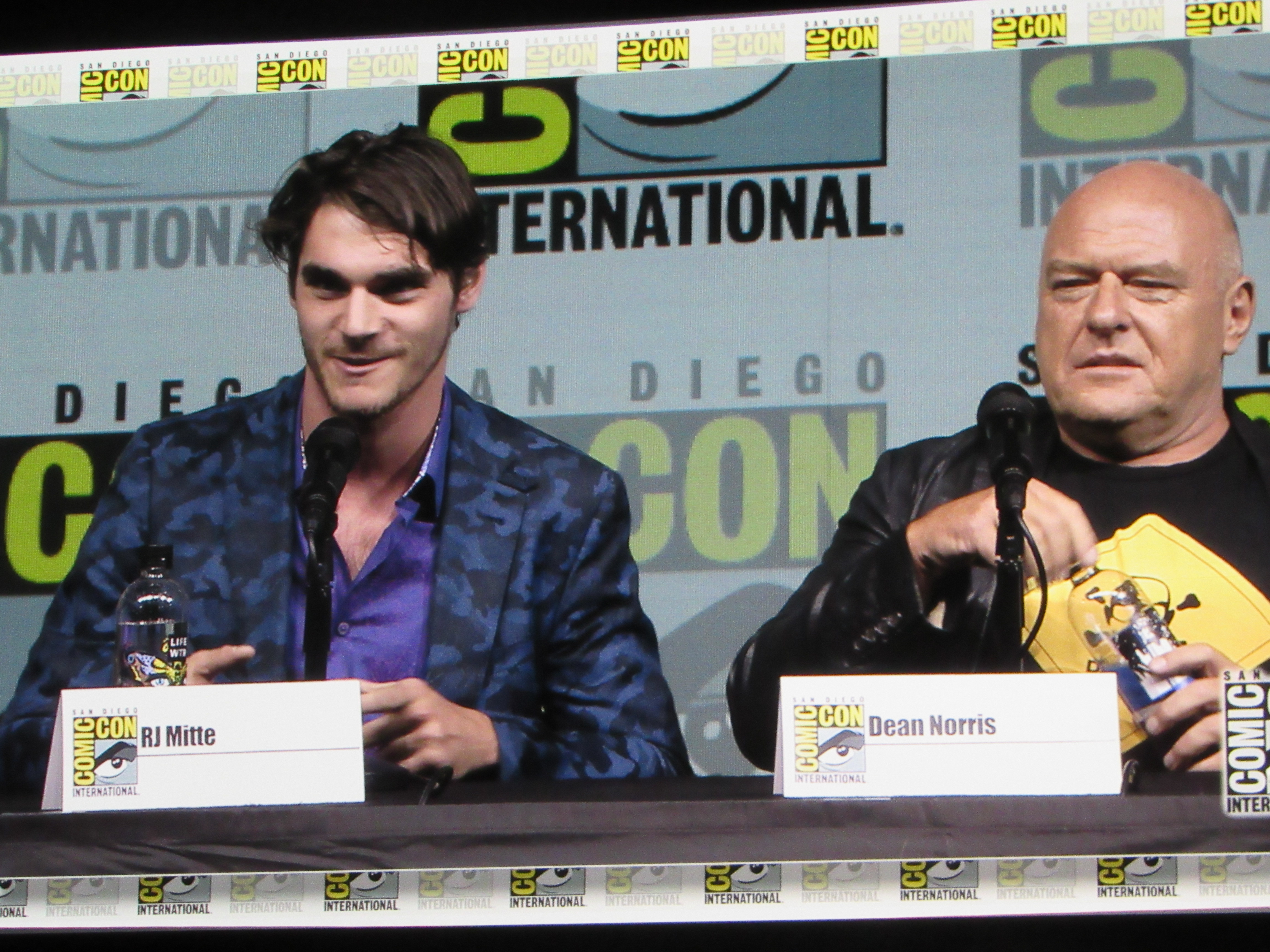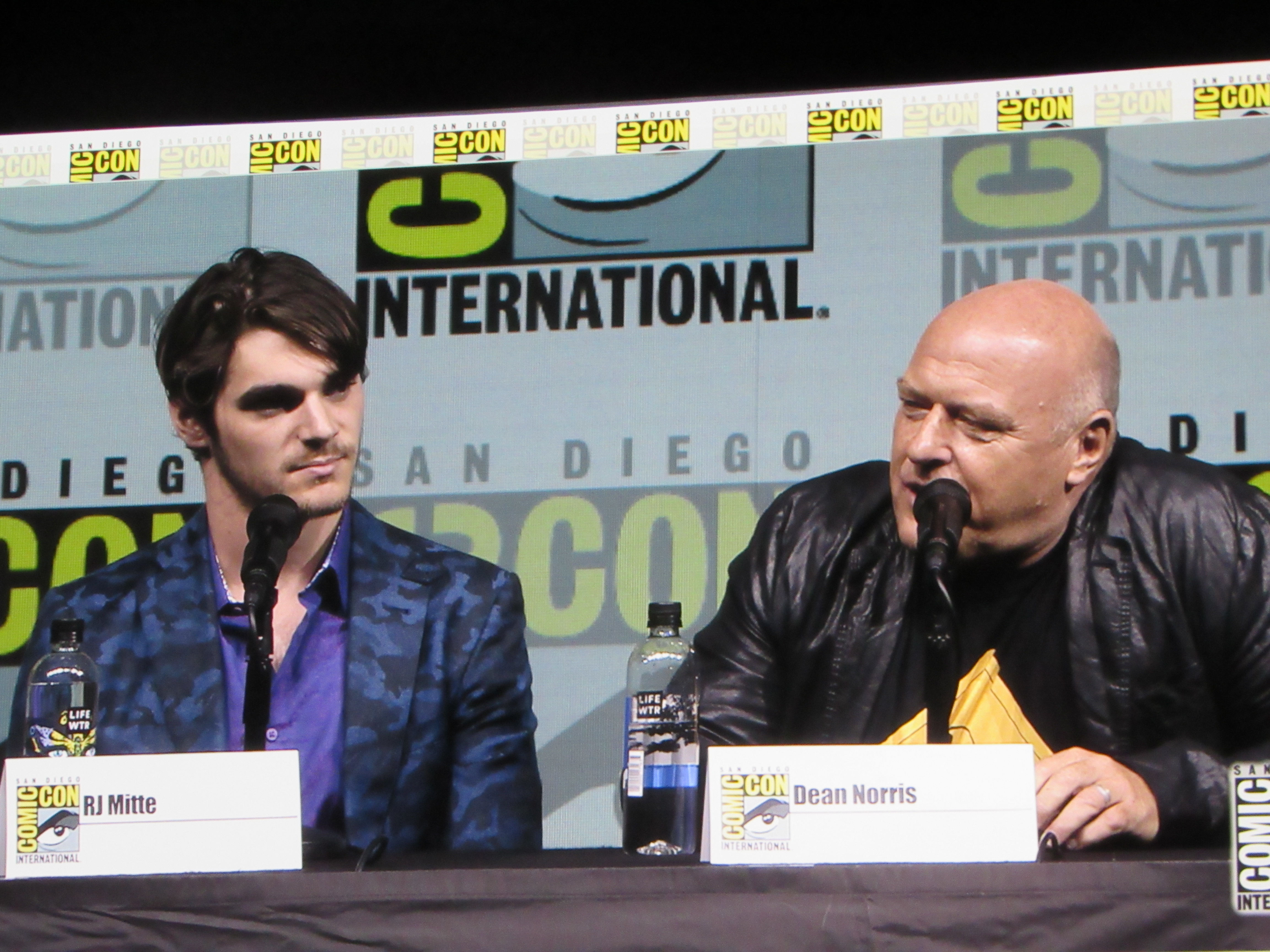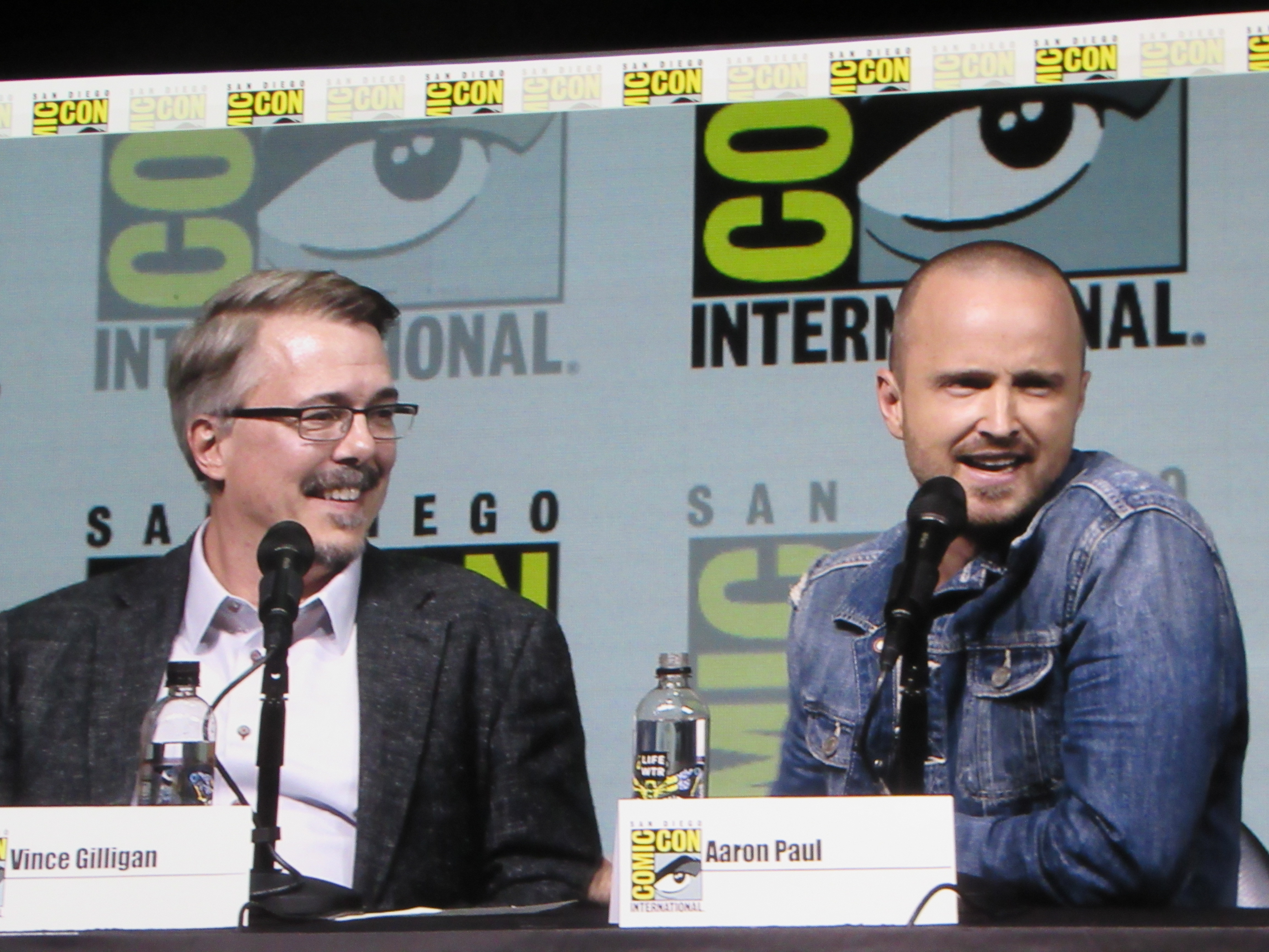 Bill Burr returned as moderator for the Breaking Bad panel, and Vince Gilligan, Bob Odenkirk, and Giancarlo Esposito returned as well. They were joined by cast members Betsy Brandt (Marie), Dean Norris (Hank), R.J. Mitte (Walt Jr.), Anna Gunn (Skyler), Aaron Paul (Jesse), and Bryan Cranston (Walt). Aaron Paul walked onstage holding his baby — who was wearing a hazmat suit! But then he asked his wife to come get the baby.