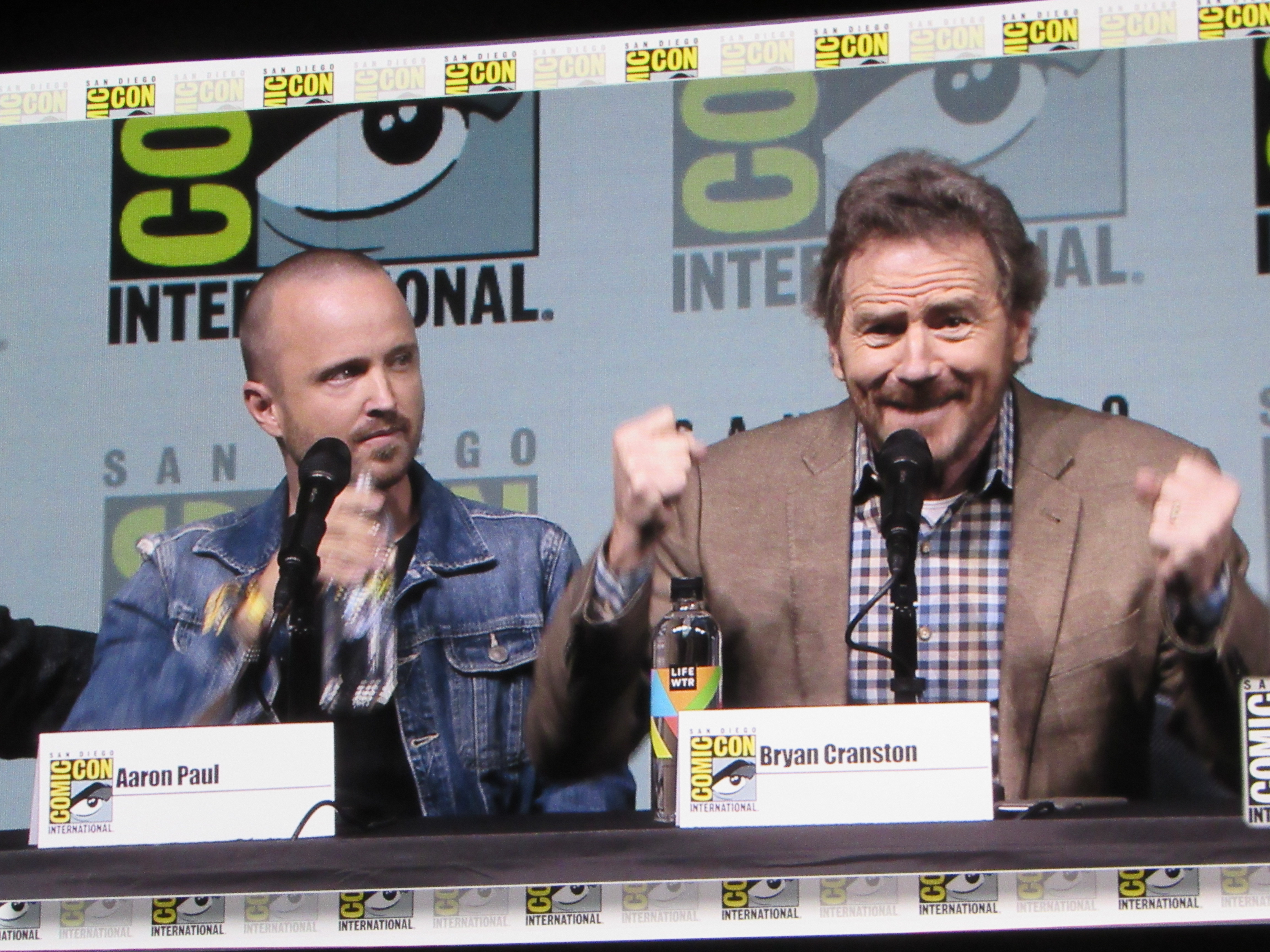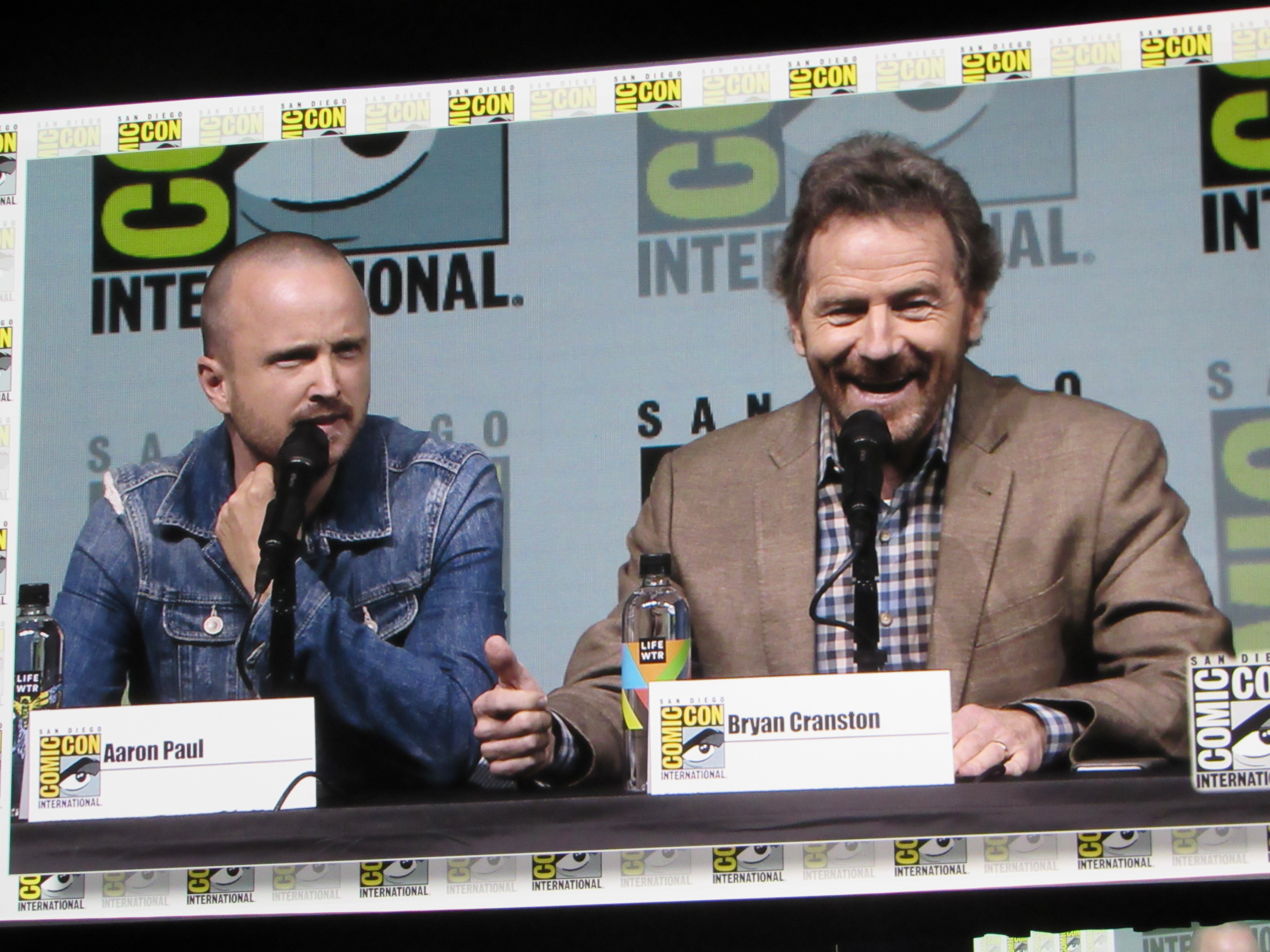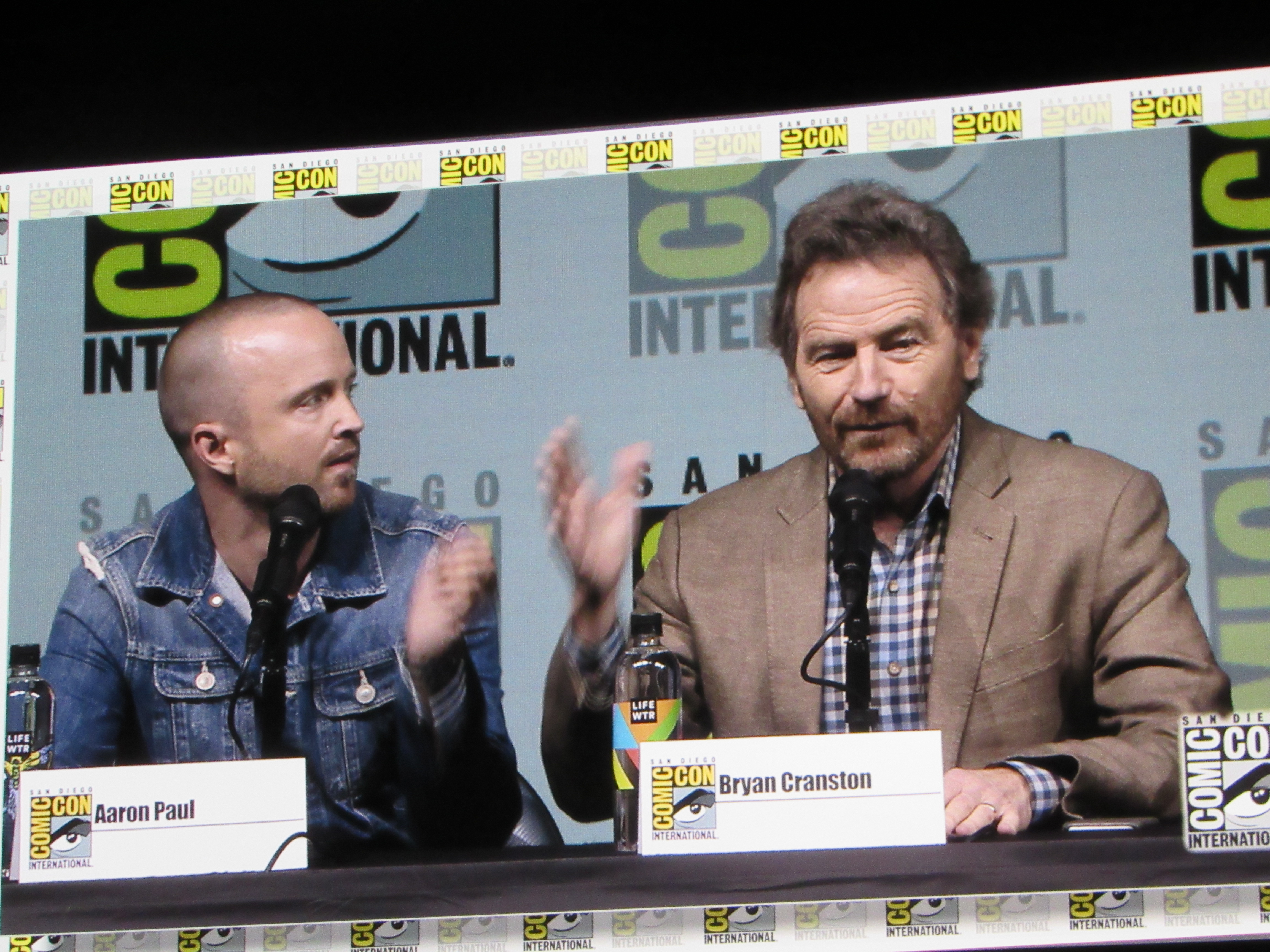 Burr pointed out how the show kept growing and growing exponentially every year, and asked what it was like to keep gaining more and more fans like that. Cranston commented how they started out as a little show, but he knew that they were starting to get big when people started stealing the directional signs indicating where cast and crew should park! This started happening during the second or third season. Then they changed the signs from reading “Breaking Bad” to “Br Ba” but those got stolen too. Paul and Cranston also spoke about how Netflix was instrumental in making the show more popular, as the first three seasons were put on Netflix as the fourth season began shooting.