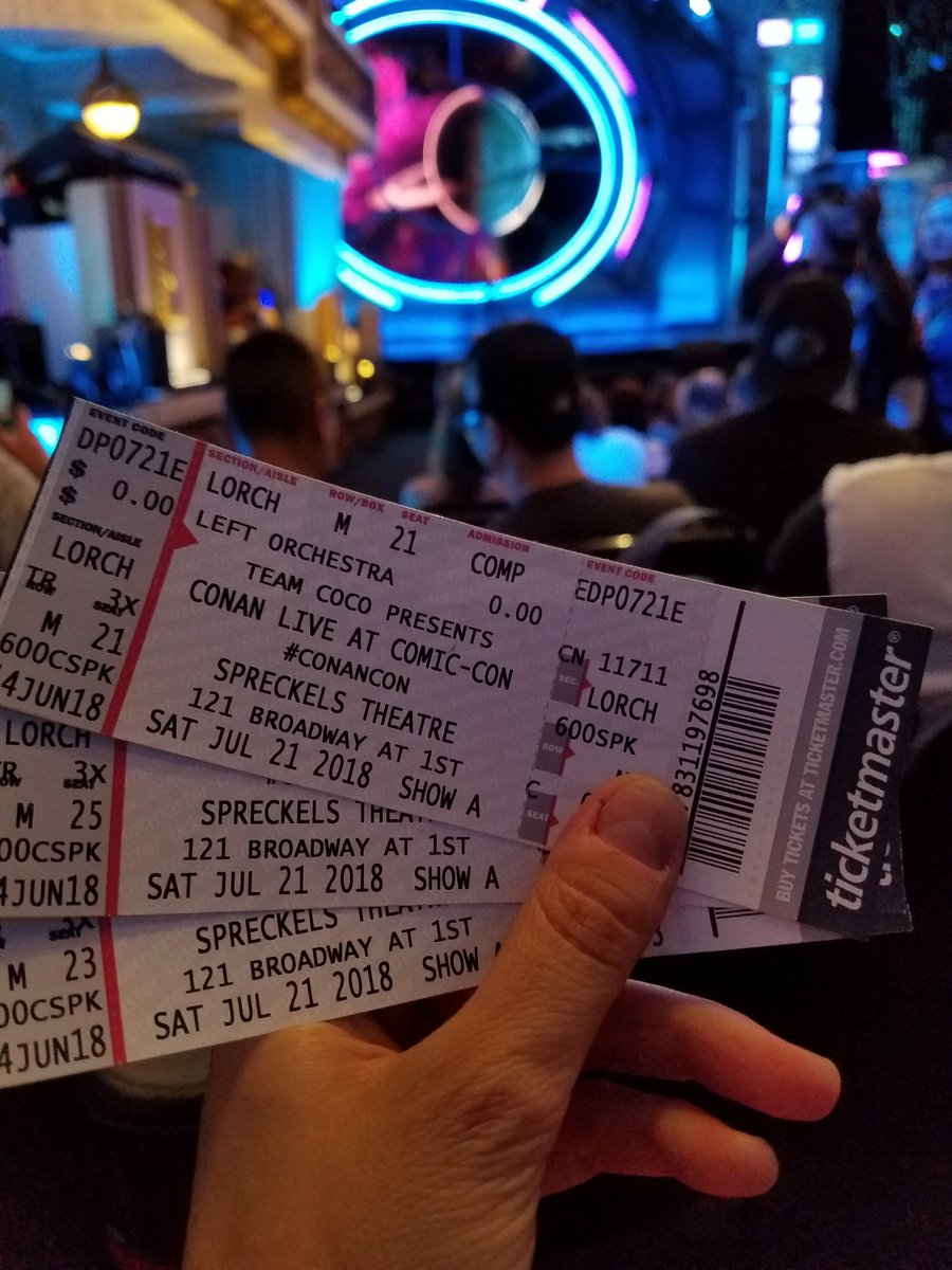 On July 9, 2018, the week before SDCC 2018, Comic-Con International sent out an email to all SDCC attendees notifying them that tickets to tapings of shows of Conan in downtown San Diego at Spreckels Theater during Comic-Con were available. This email contained the link to register for tickets, along with a secret code for SDCC attendees, and instructions to also enter your CCI Member ID. You could request any number of tickets between 1 and 4 for each of the four dates that Conan would be taping during SDCC: Wednesday, July 18 through Saturday, July 22.