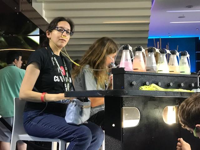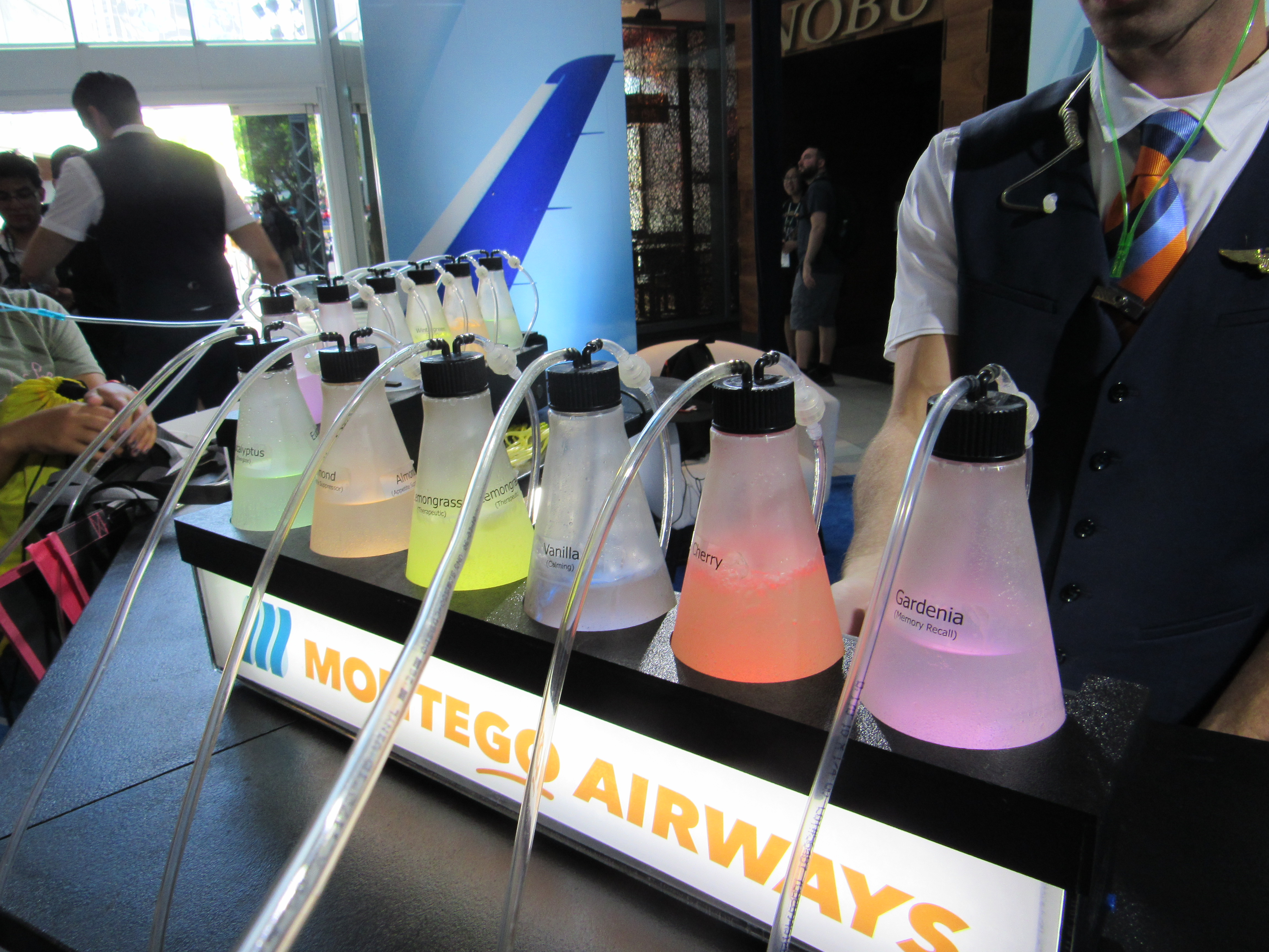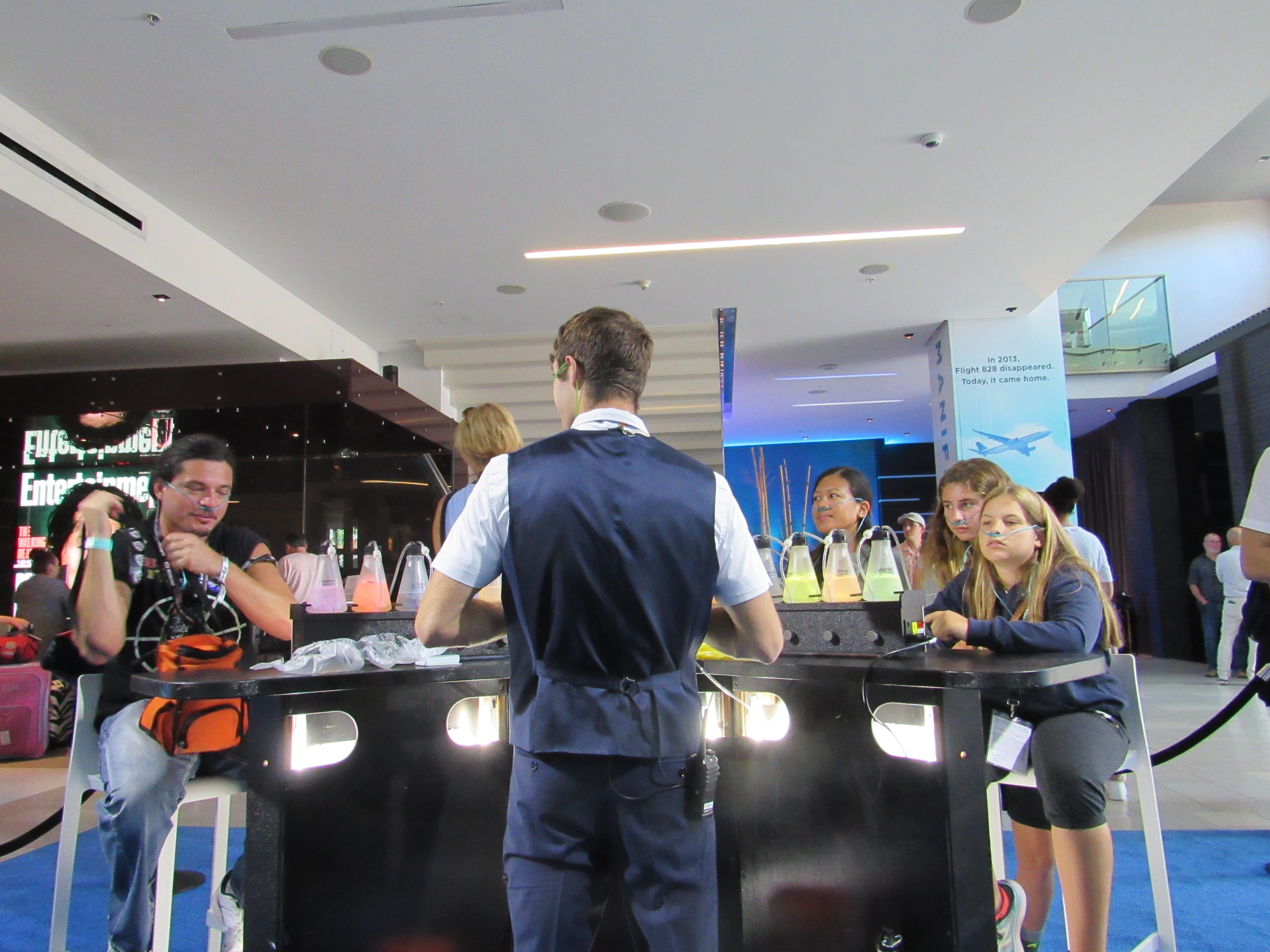 Each person at the bar was given a nostril tube thingy to wear (I just looked it up – apparently the proper name is “nasal cannula”) and then you could insert the end into one of many scents, which each had certain effects. For example, the Gardenia scent was for memory recall, Vanilla was calming, Lemongrass was therapeutic, and Almond was an appetite suppressor. Cherry was… just cherry, I guess! I tried out each of the ones in front of me, while I watched a preview of NBC’s upcoming show Manifest playing on the large monitor.