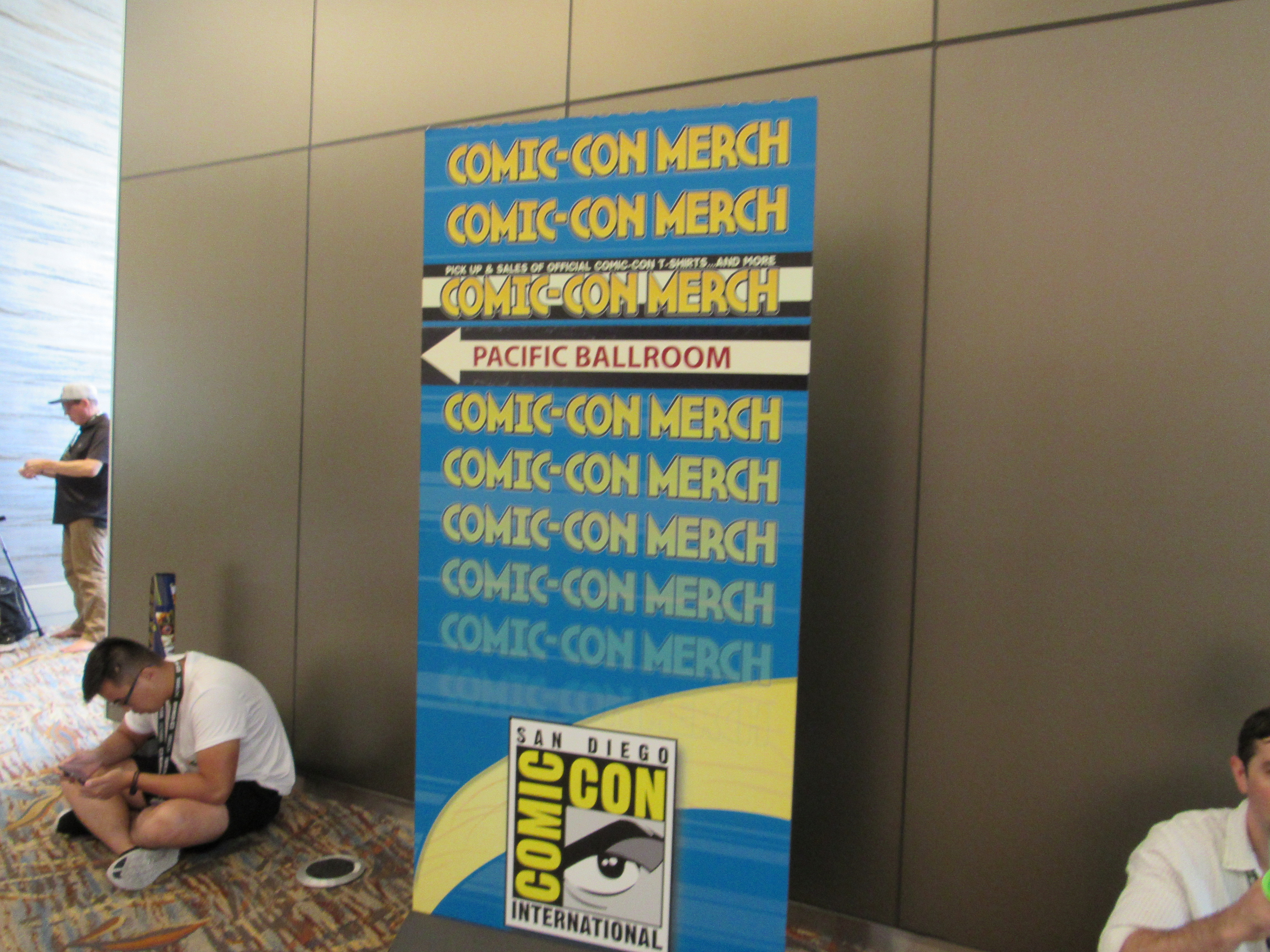 We then went over to the Marriott to pick up our pre-ordered exclusive Comic-Con merch. We each had ordered a T-shirt. I had ordered the Catwoman shirt, while Josh ordered the navy blue collegiate shirt with SDCC in orange writing, plus we ordered an extra Catwoman shirt to give away to one of our lucky readers, so stay tuned for that! The line for pre-orders wasn’t that long, but the line to purchase items without pre-orders was pretty long. There were signs on the walls indicating which items were sold out, which were quite a few. The hats were sold out, as well as the SDCC pins. The only shirt left in men’s sizes was the Catwoman shirt.