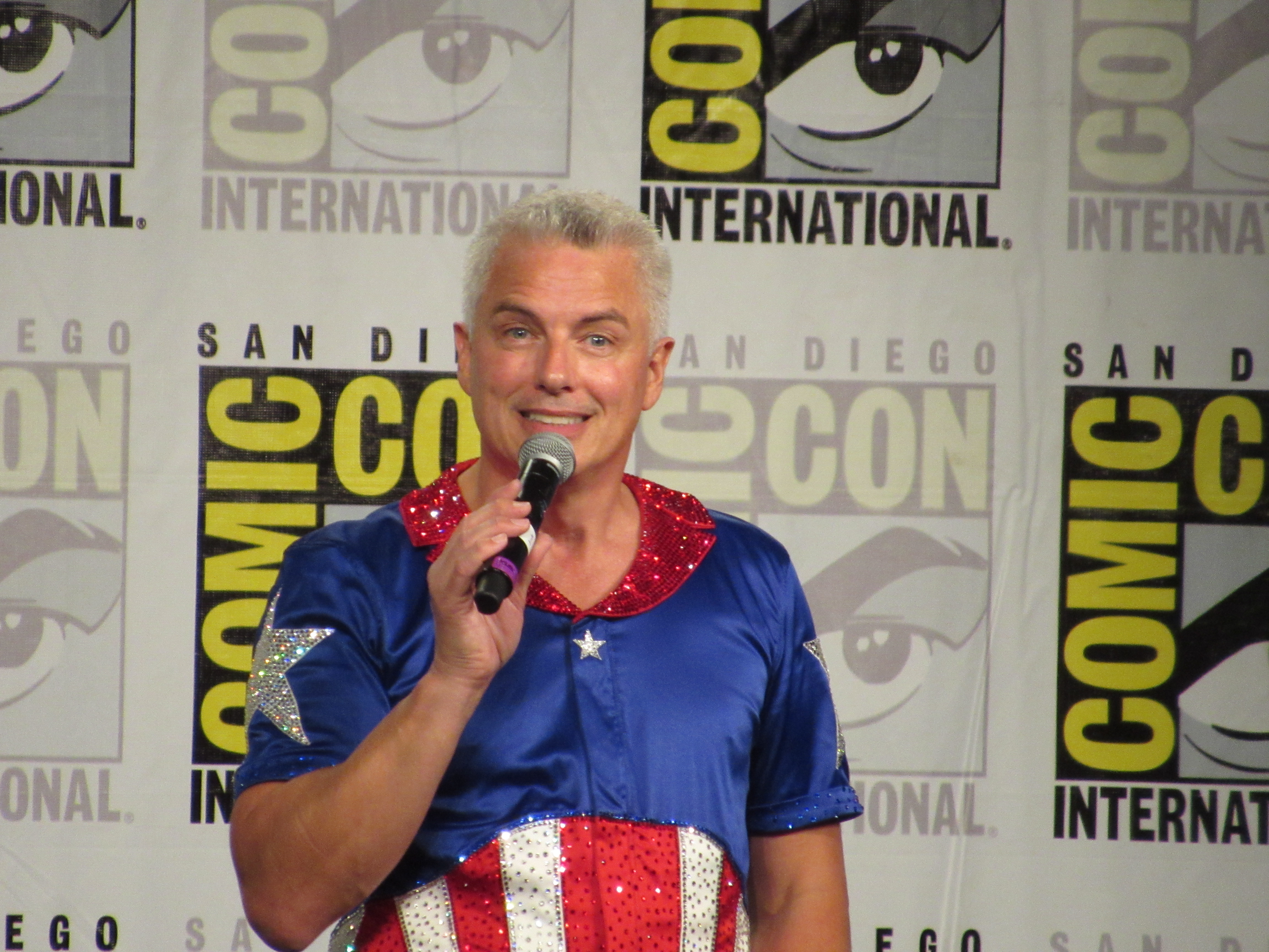 John Barrowman came out on stage debuting his latest cosplay — which he dubbed as “Captina Americana”! He made sure to show off his high heel shoes, which he told us he had gotten for $45 from Amazon Prime — on sale — but that the total cost went up to $1,500 when he added Swarovski crystals to them! He got things started off by saying, “I’m here, I’m queer, I’m ready to steer.”