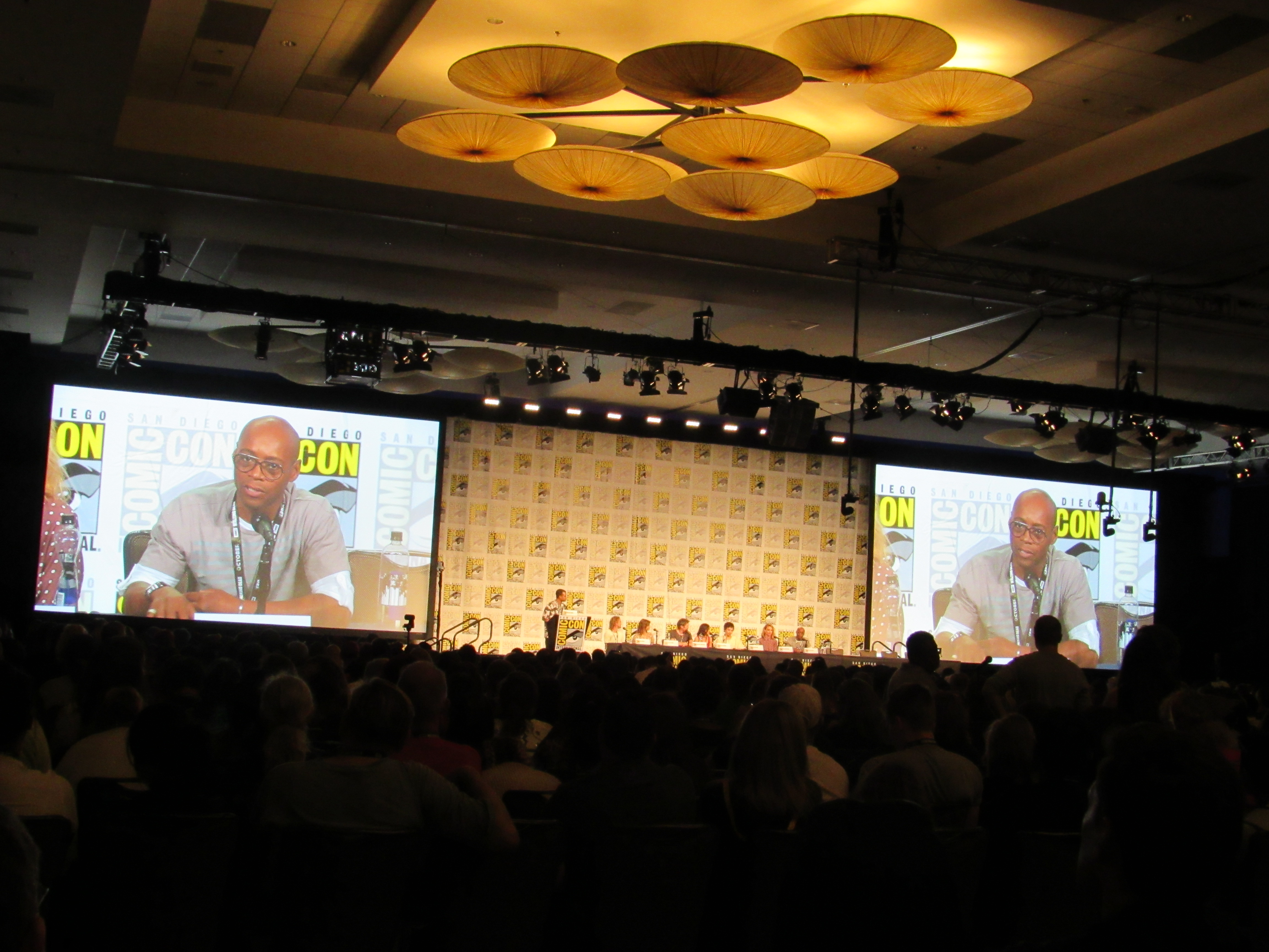 To continue our story of what we did on Thursday at San Diego Comic-Con 2018, after the Doctor Who panel wrapped up in Hall H around 12:45pm, we headed over to the Indigo Ballroom at Hilton Bayfront. We noticed that it seemed like a lot of other people leaving Hall H were doing the same thing – which made sense. We were all Whovians who wanted to see the panel of someone who had appeared on Doctor Who before. And that someone was John Barrowman.