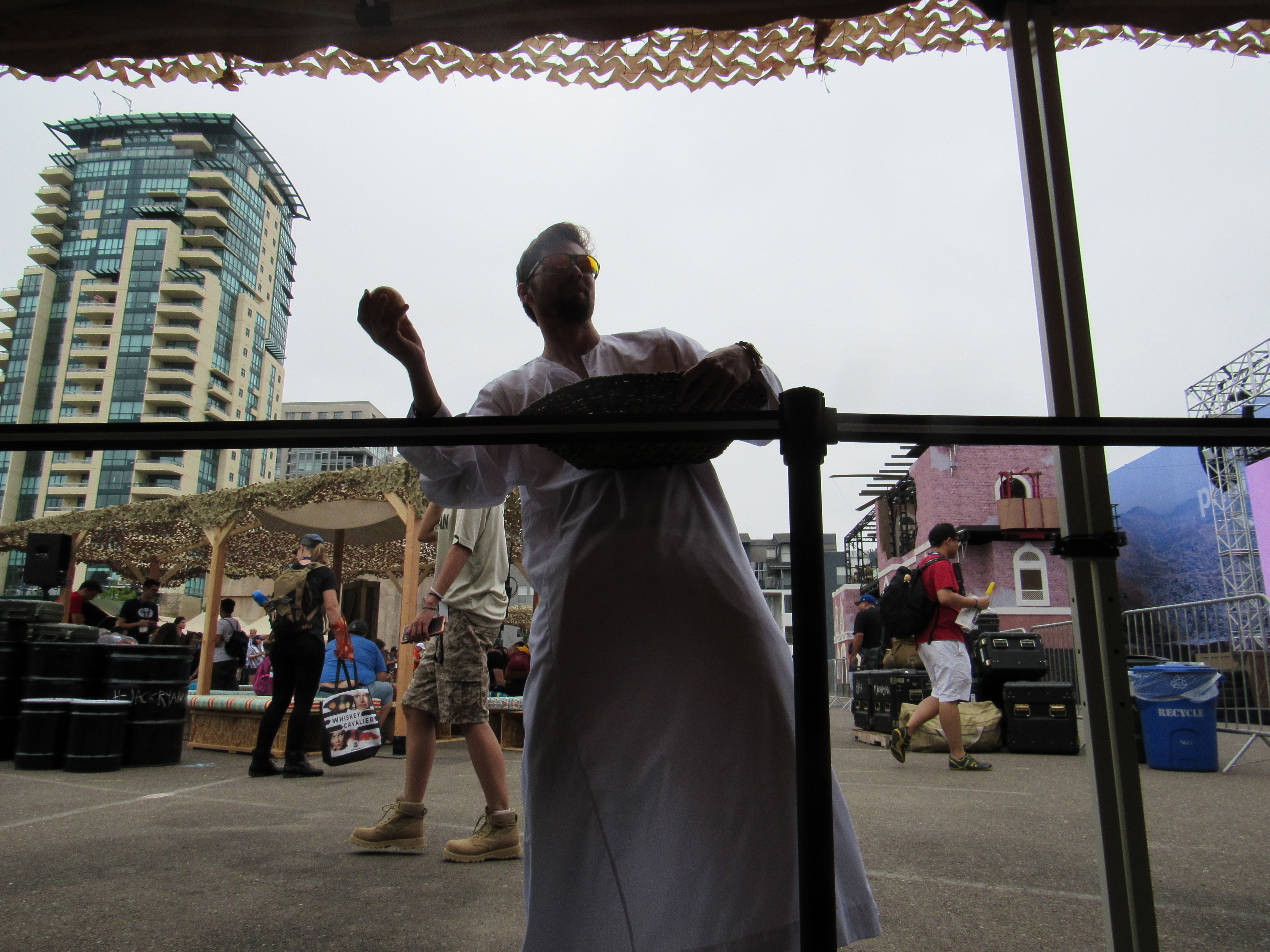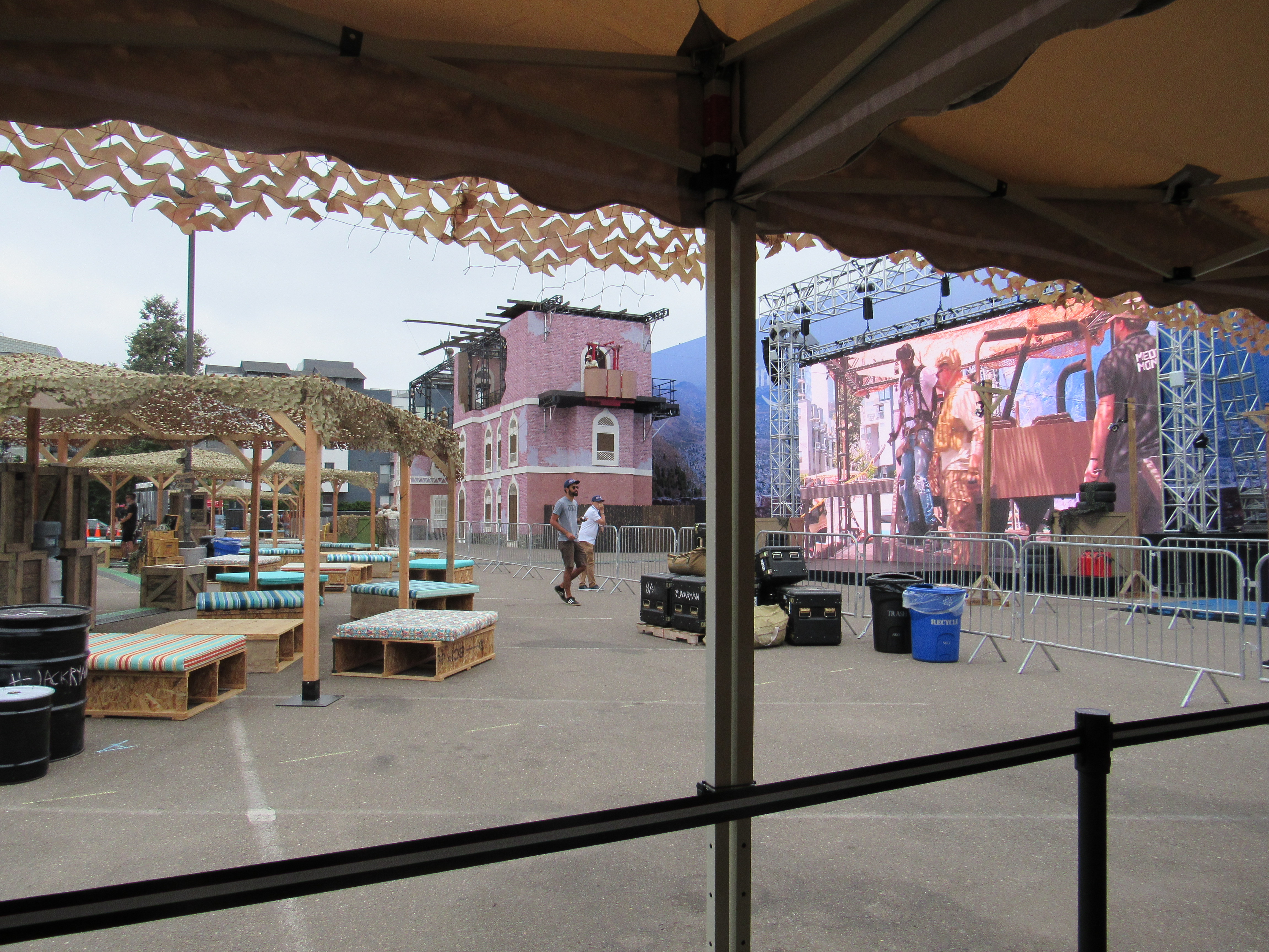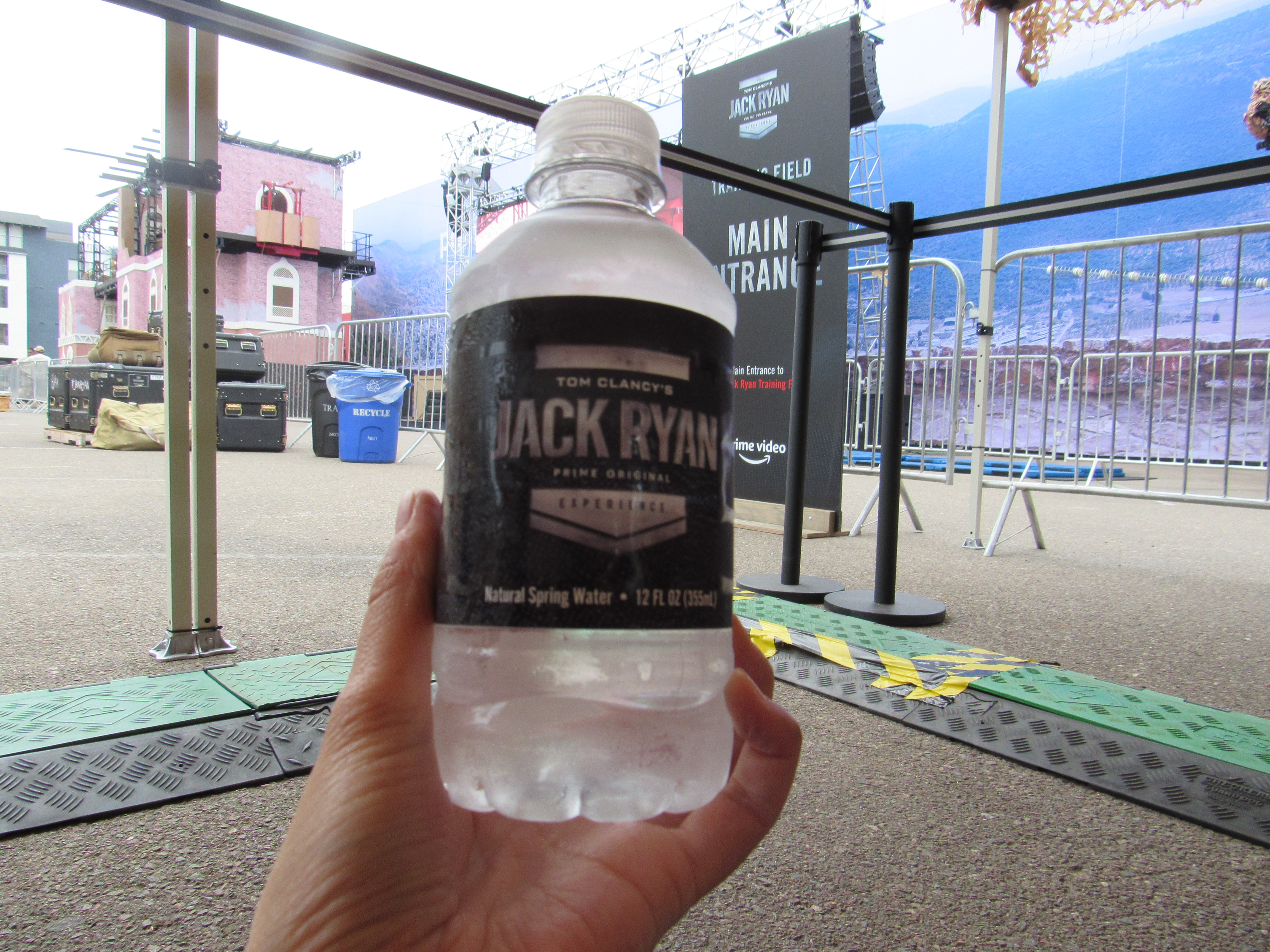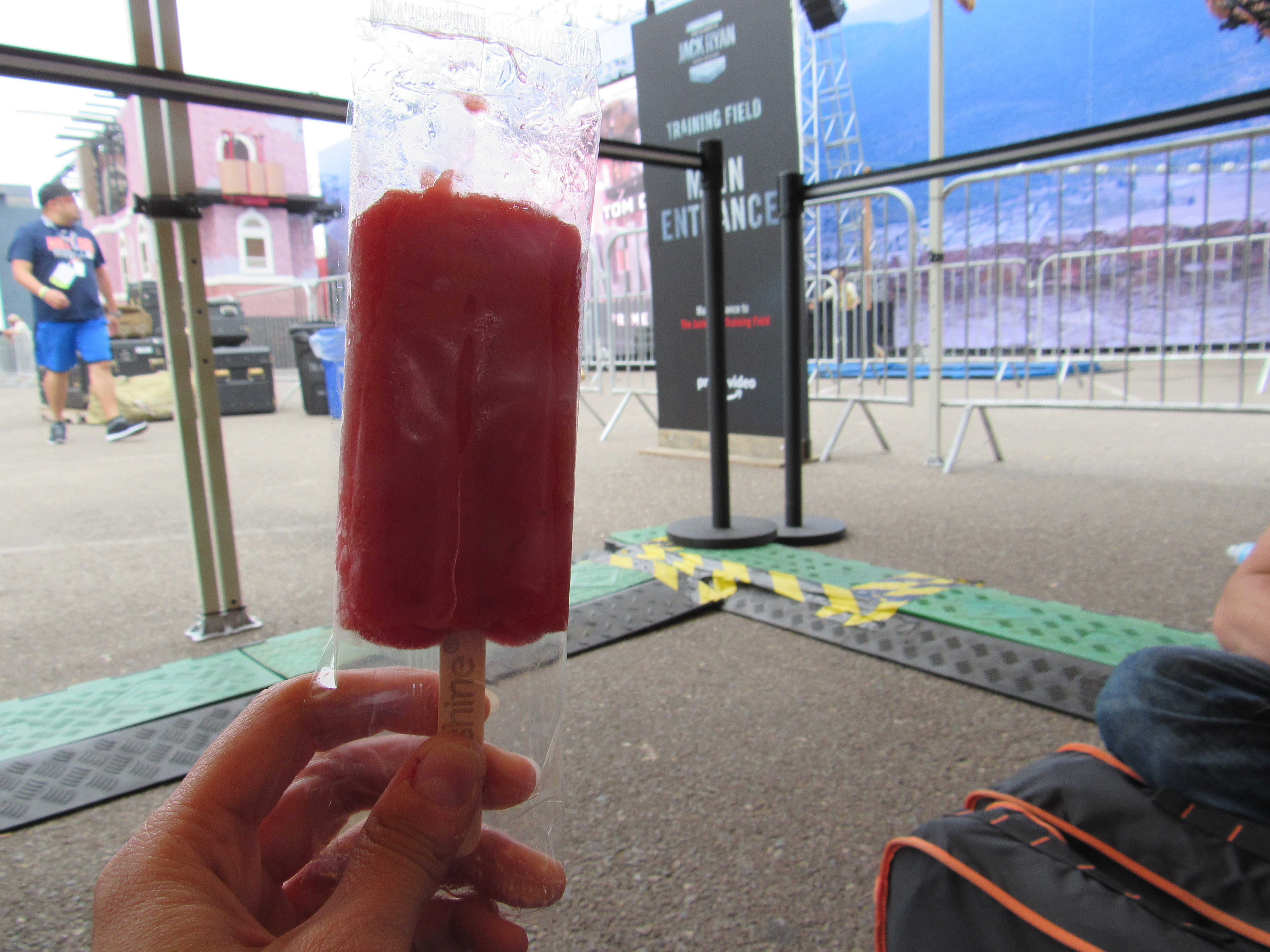 So we waited in line. People started going through the course, while an offsite worker narrated what was going on, which apparently was streaming on Twitch, as well as playing on a big screen for everyone inside the walls of the Jack Ryan offsite to see. An hour went by and we had not moved in line, and we became a bit concerned as to what was happening. Then another went by and we still hadn’t moved. The offsite characters mingled with us a bit in line, giving us some popsicles and offering water and oranges, which was very kind of them. Eventually I took a nap on the asphalt. Apparently while I was in and out, a photographer came up and took my photo, and quite up close according to Carlos and Violet. I felt violated, and a little irritated because Violet and Carlos just let it happen, but, I let it go.