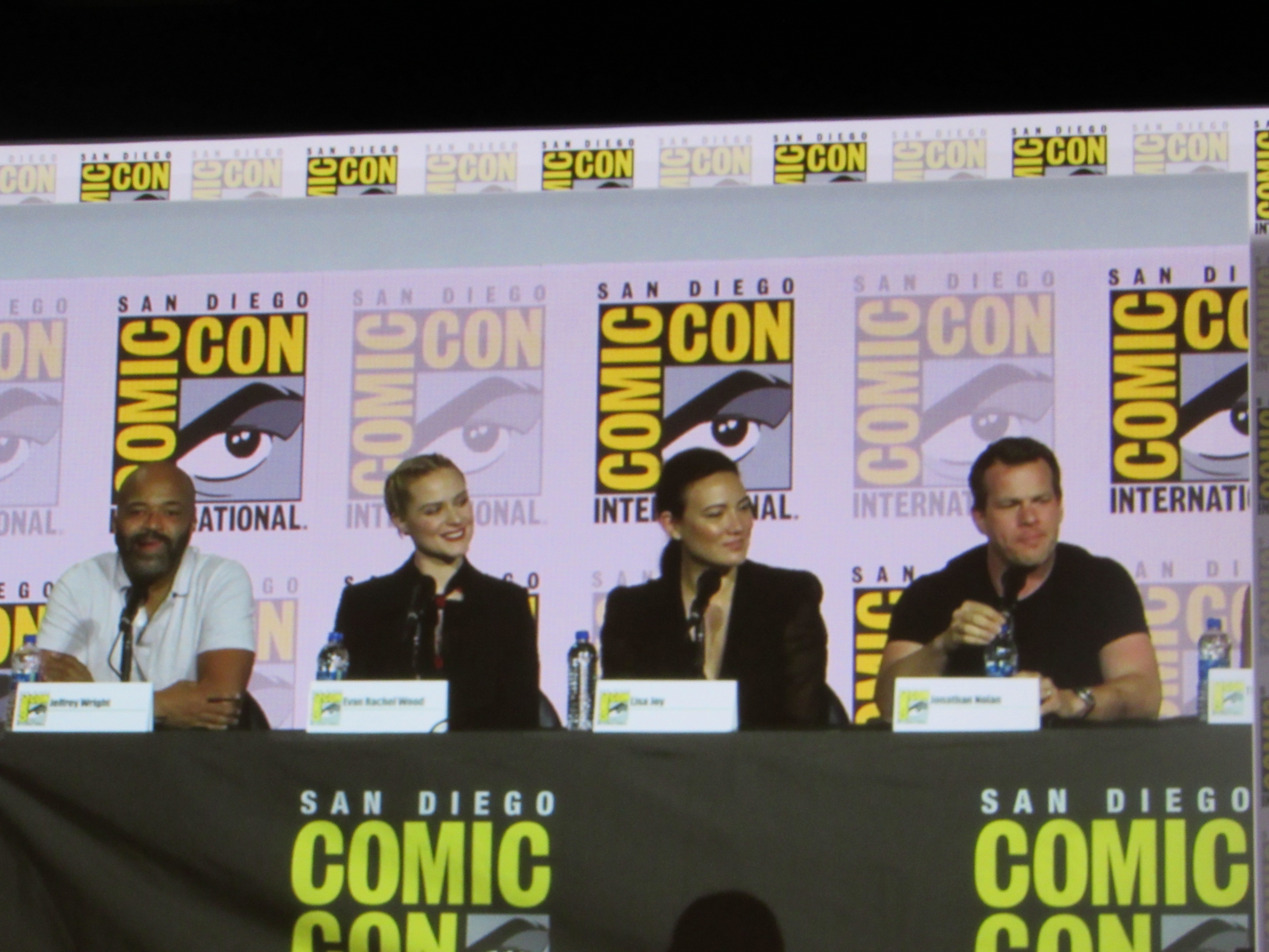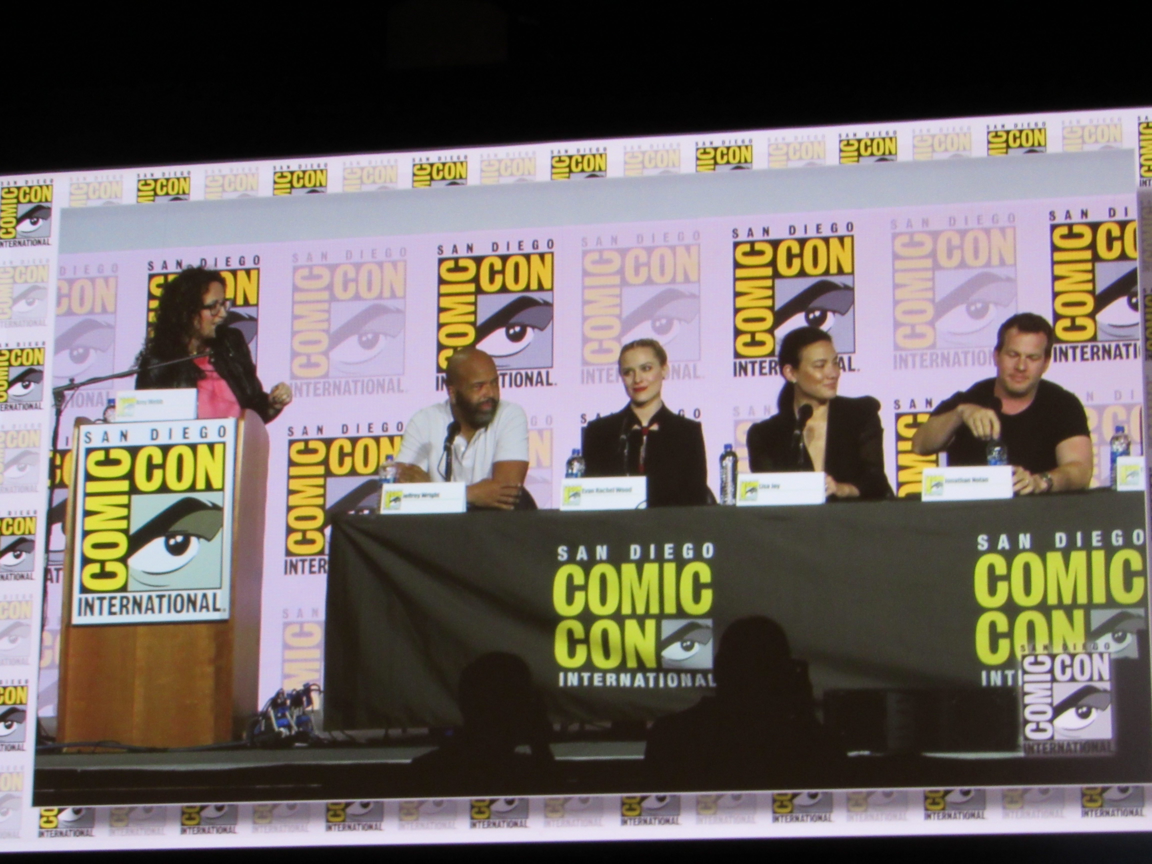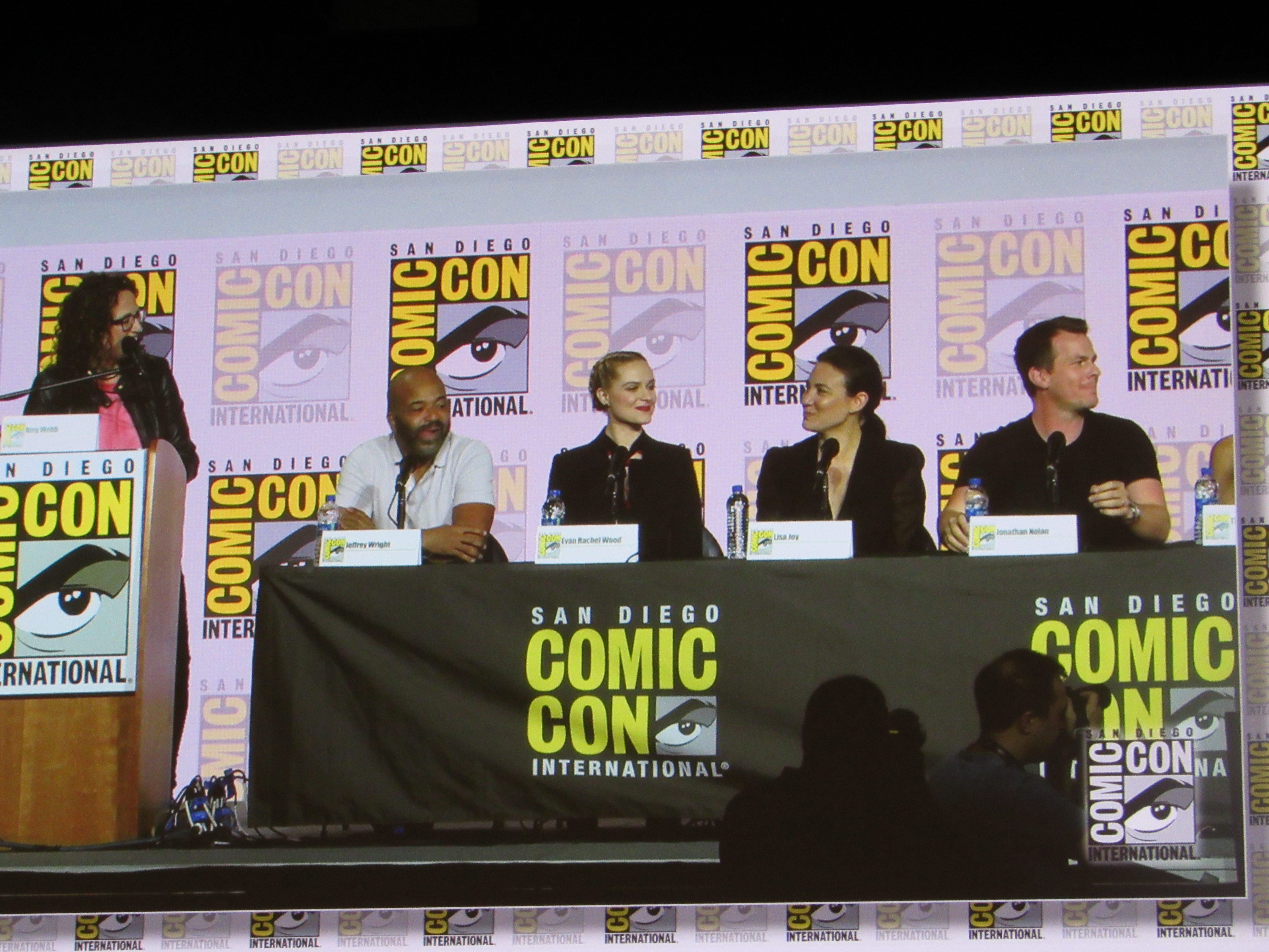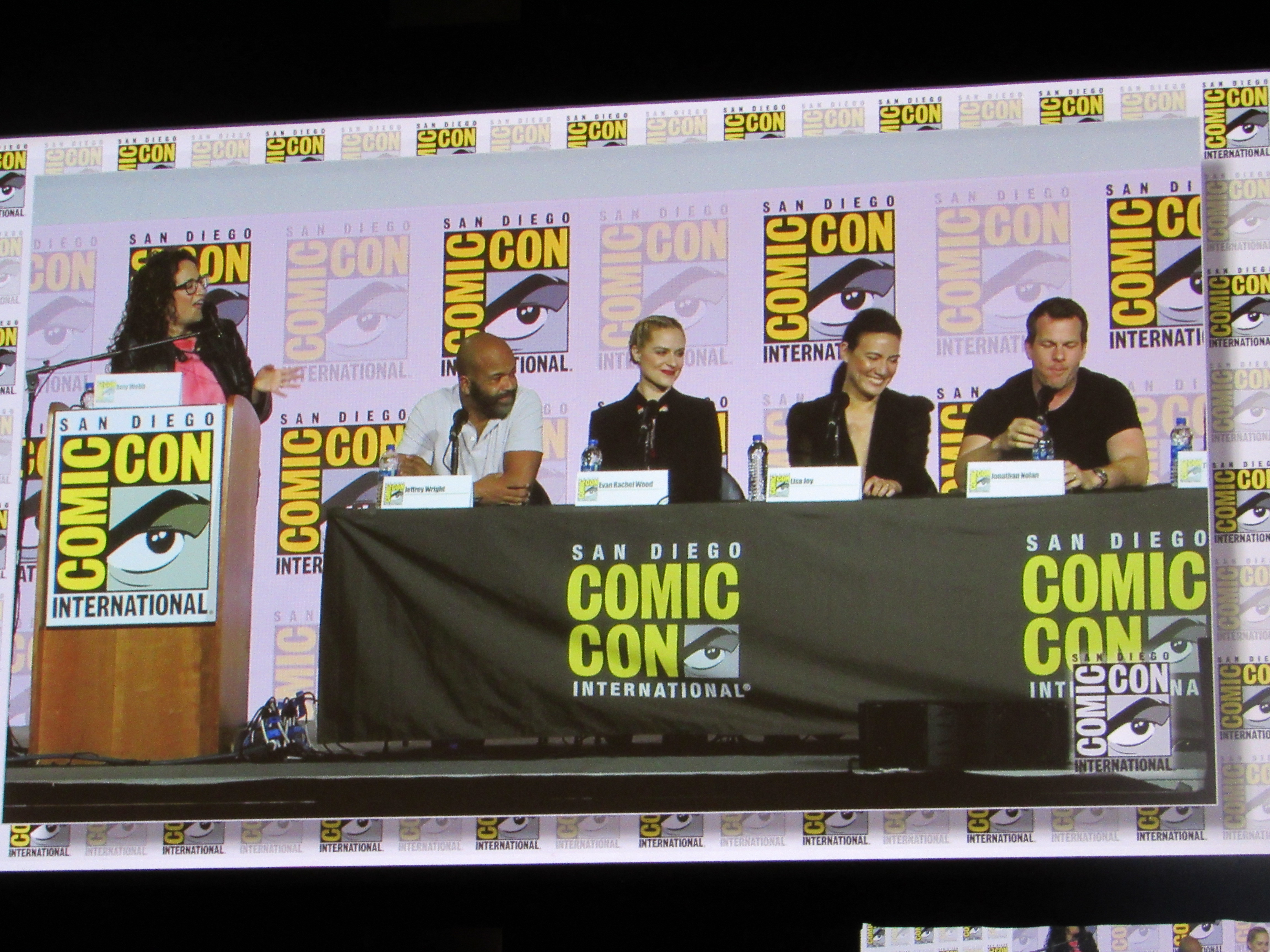 Panelists included husband and wife creators Jonathan (“Jonah”) Nolan and Lisa Joy, as well as cast members Jeffrey Wright, Evan Rachel Wood, Thandie Newton, Tessa Thompson, and newcomer Aaron Paul.