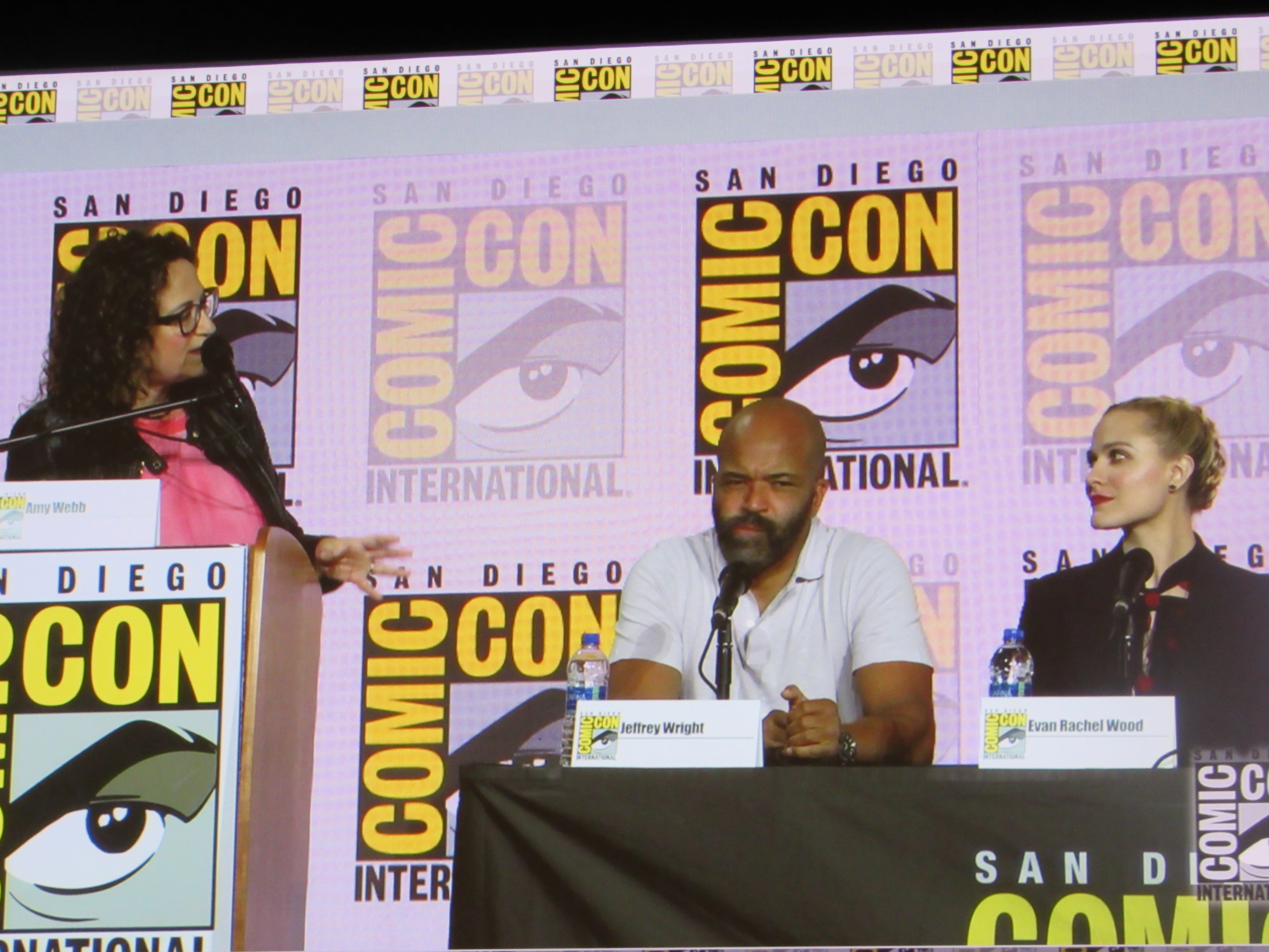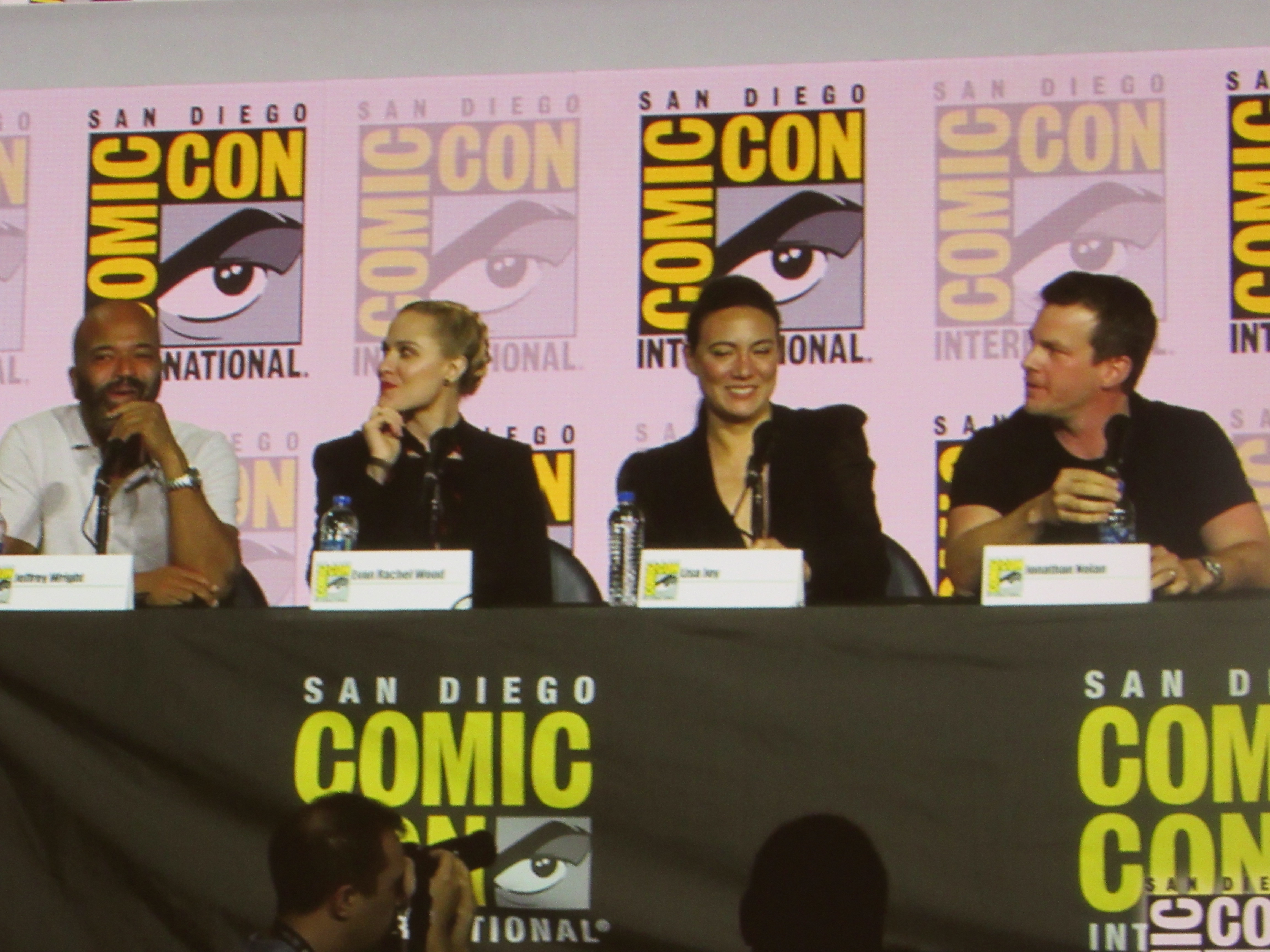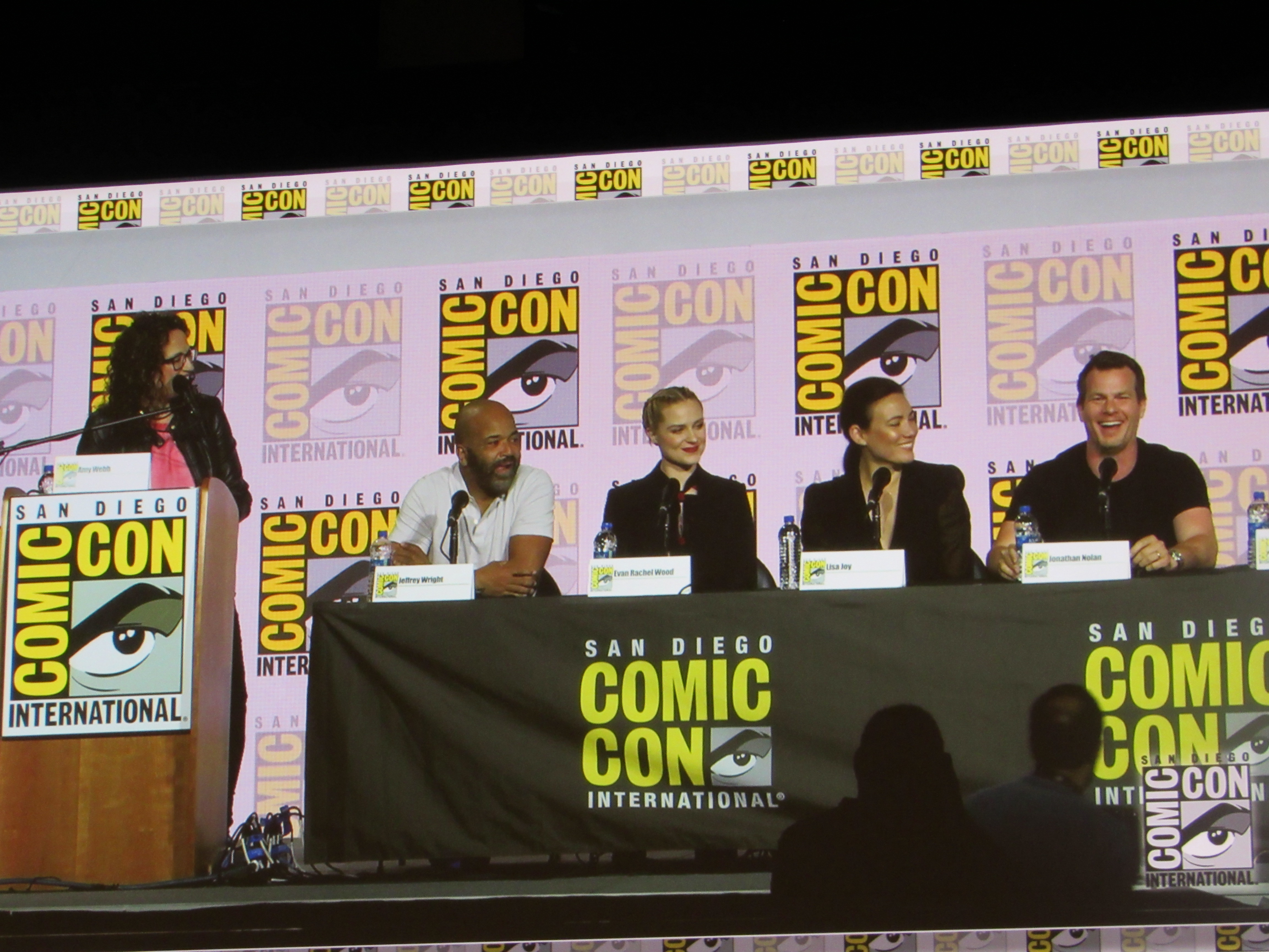 Panelists included husband and wife creators Jonathan (“Jonah”) Nolan and Lisa Joy, as well as cast members Jeffrey Wright, Evan Rachel Wood, Thandie Newton, Tessa Thompson, and newcomer Aaron Paul.