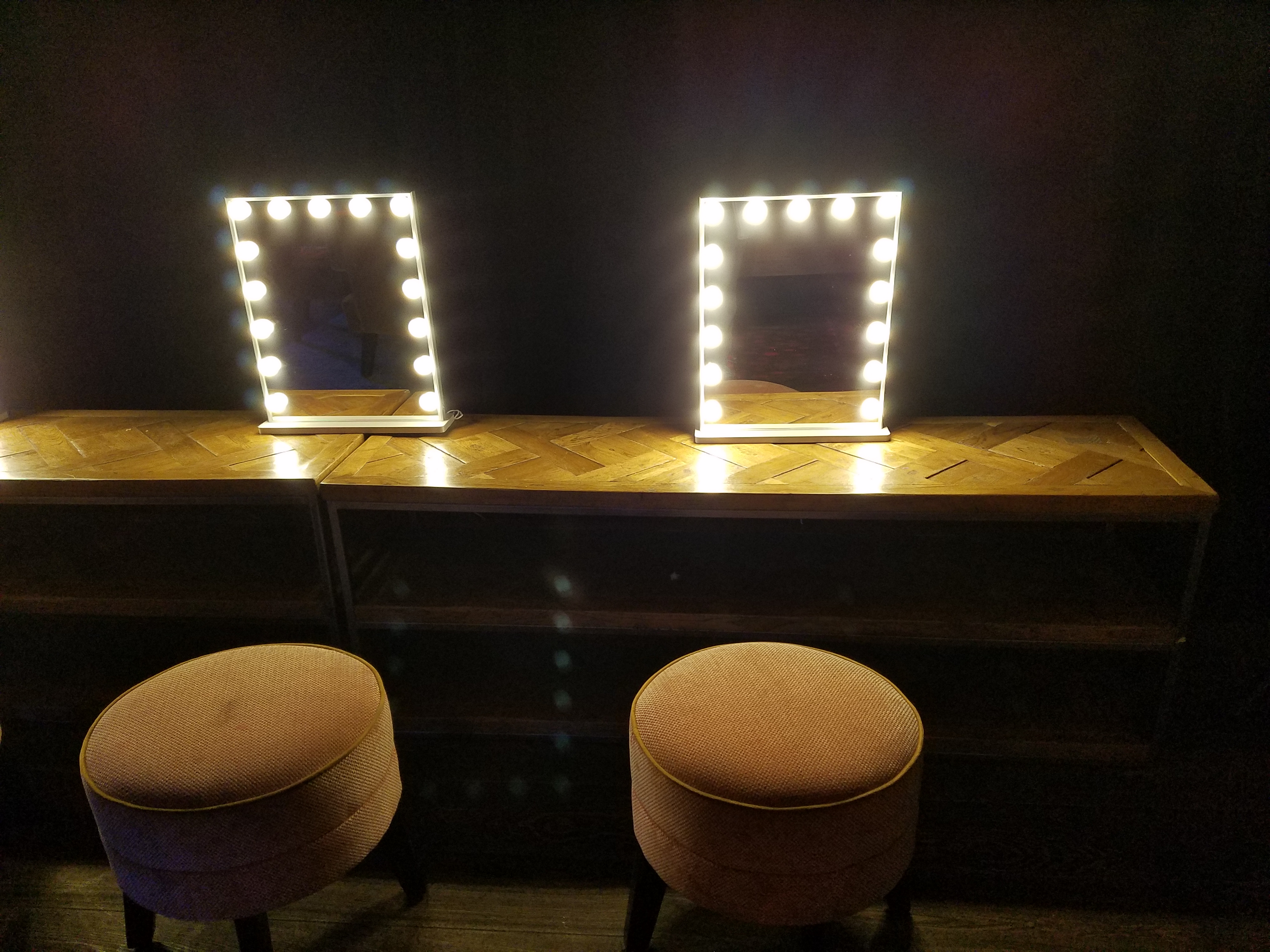They let us in about 10 or so at a time. Upon entering, we went down some stairs and into a lounge. There were a couple of photo op areas, including a bar, as well as a neon sign. There was an empty stage, which apparently later, according to our friend @CorgiKohmader, had a lounge singer and dancers. Additionally, there was a blackjack table where we played a couple hands of blackjack.