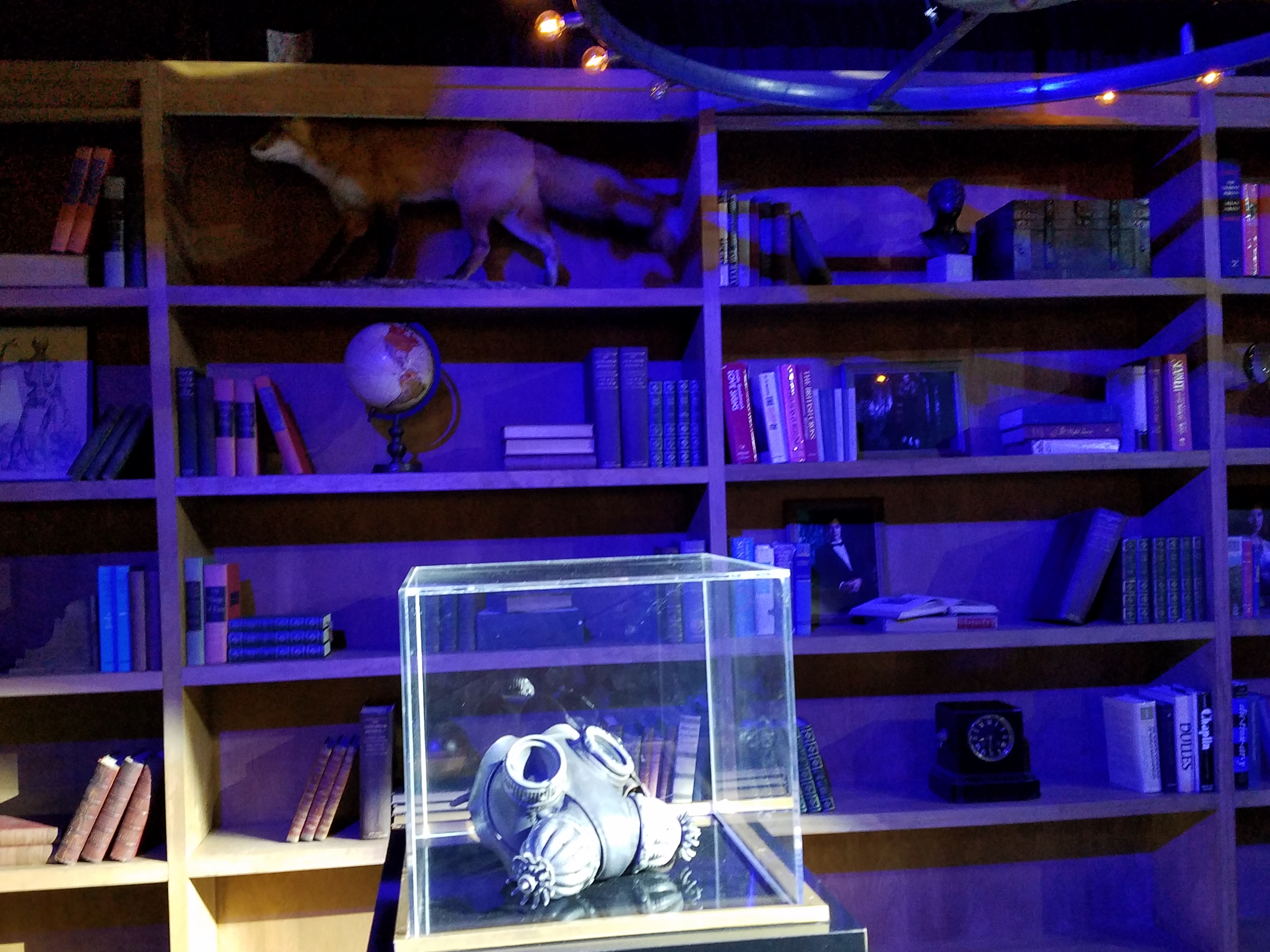 In the next room was what looked like a library, as well as a dining room area, and some couches where a well-dressed man was sitting and writing. A woman standing at a spinning wheel asked me if I would like a postcard, then she proceeded to use the spinning wheel to stamp a raven onto the postcard. She told me that I could write a postcard and mail it from there! Behind the bookshelf was a hidden room with a bed, which I recognized from when I watched the Pennyworth pilot on Preview Night.