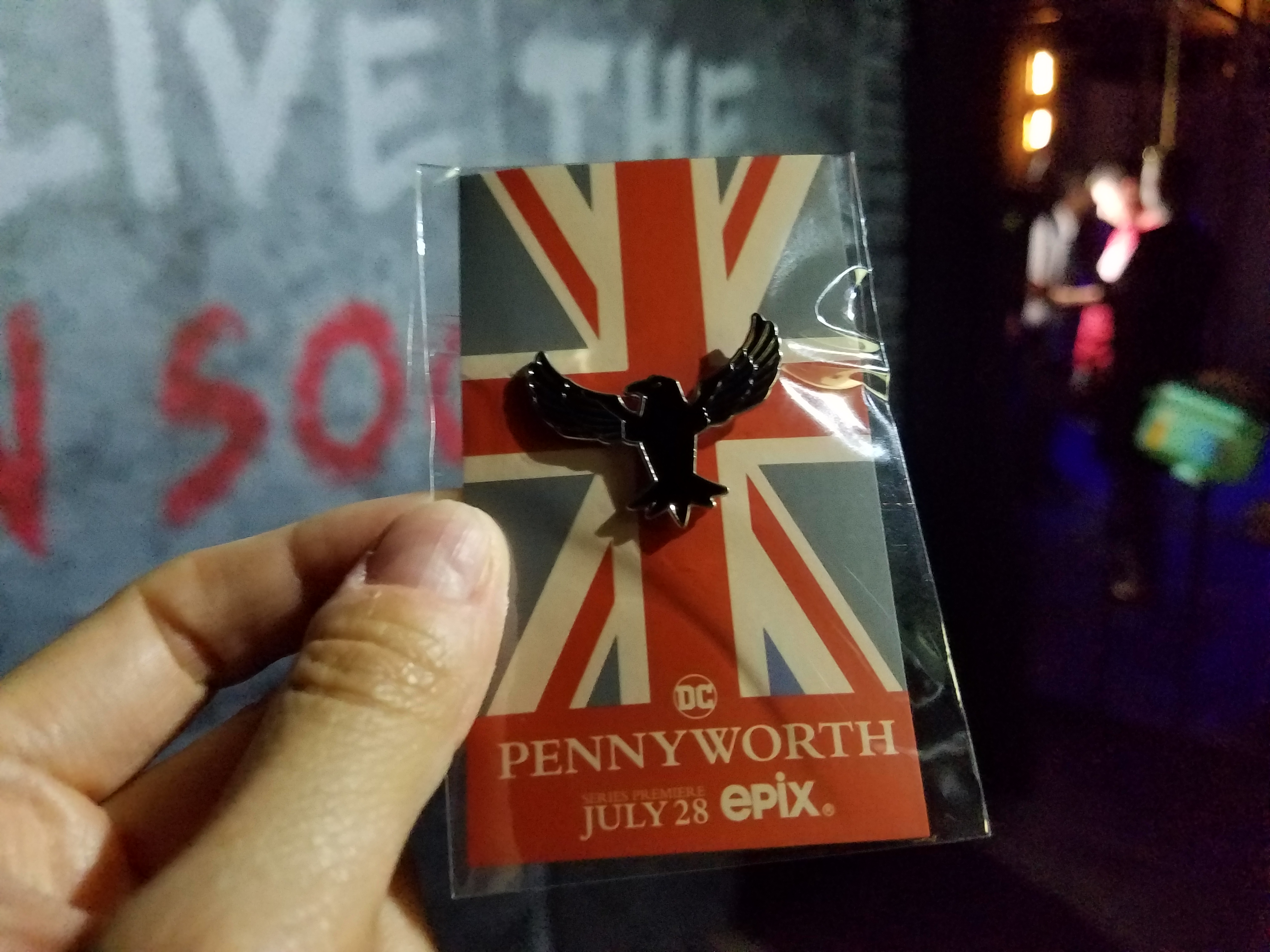 On Thursday, after we got out of the Terminator: Dark Fate panel and grabbed some lunch from a lunch cart along the marina, we didn’t have anything specifically planned, other than checking out offsites. I did a quick Twitter search and discovered that the Pennyworth offsite seemed to have a pretty short line. So we headed over there and sure enough, the line was not that long. Along the way, we were handed a postcard advertising for the offsite, probably because they were trying to get more people over there. We only ended up waiting about 20 minutes or so.