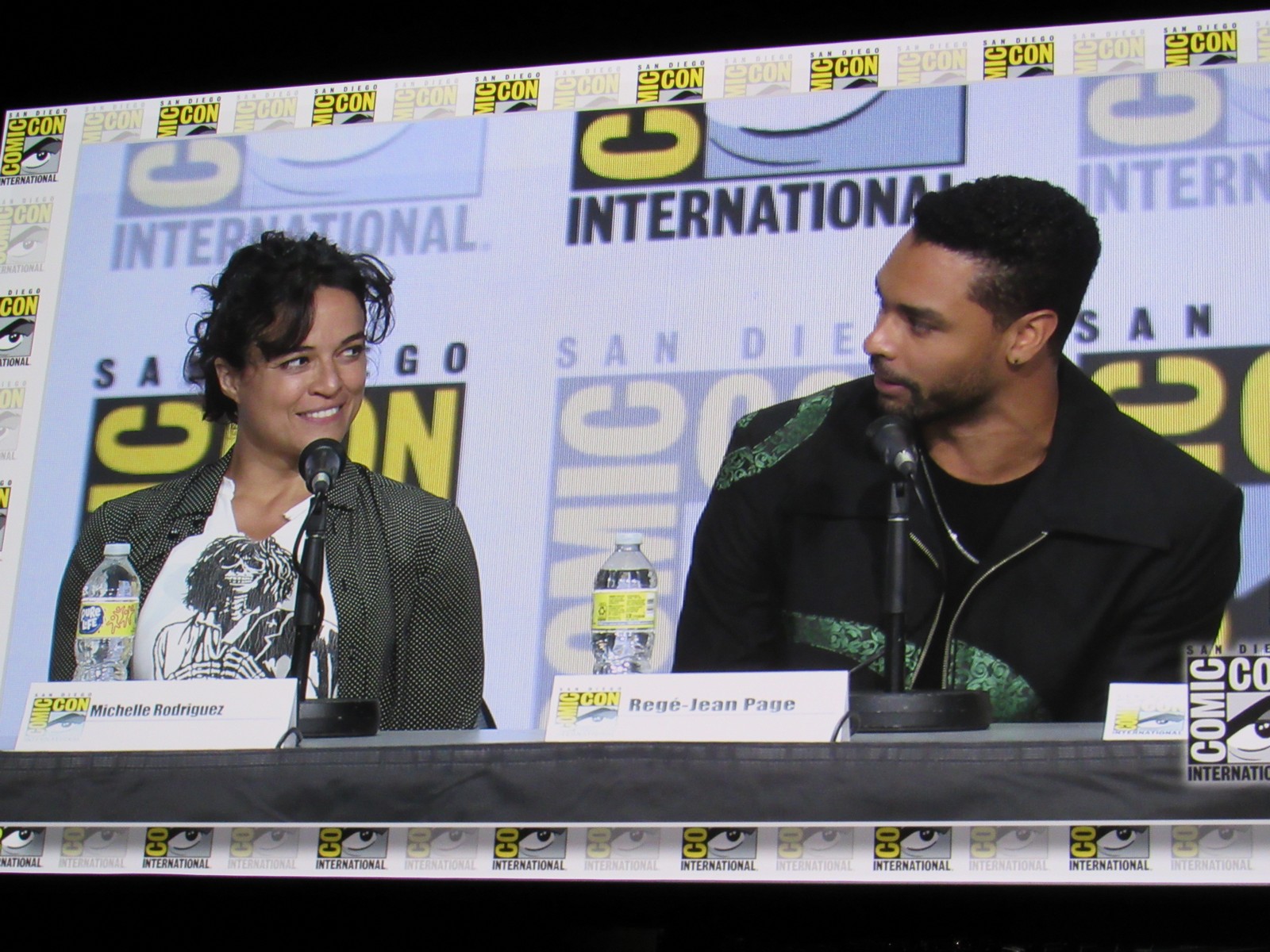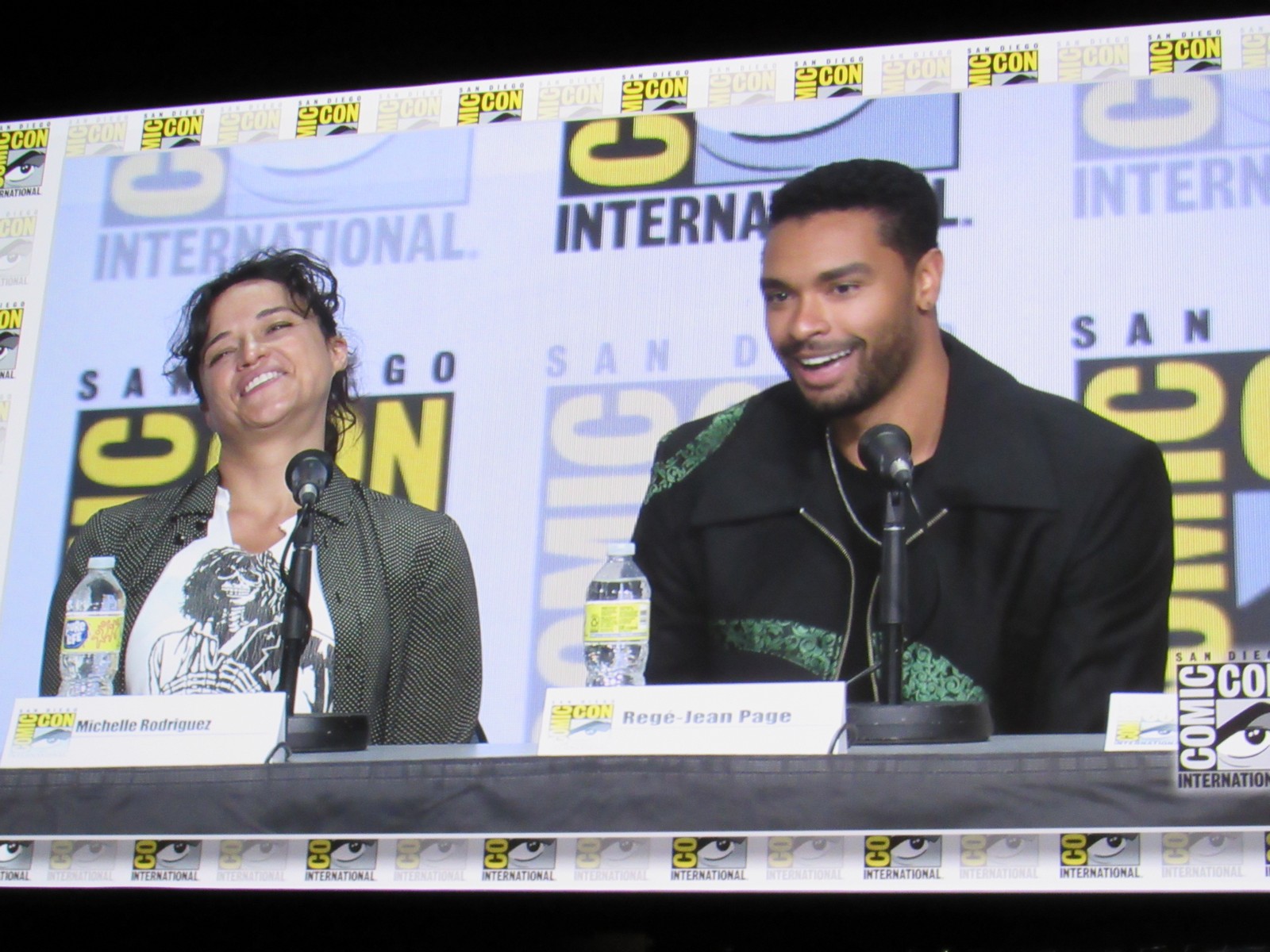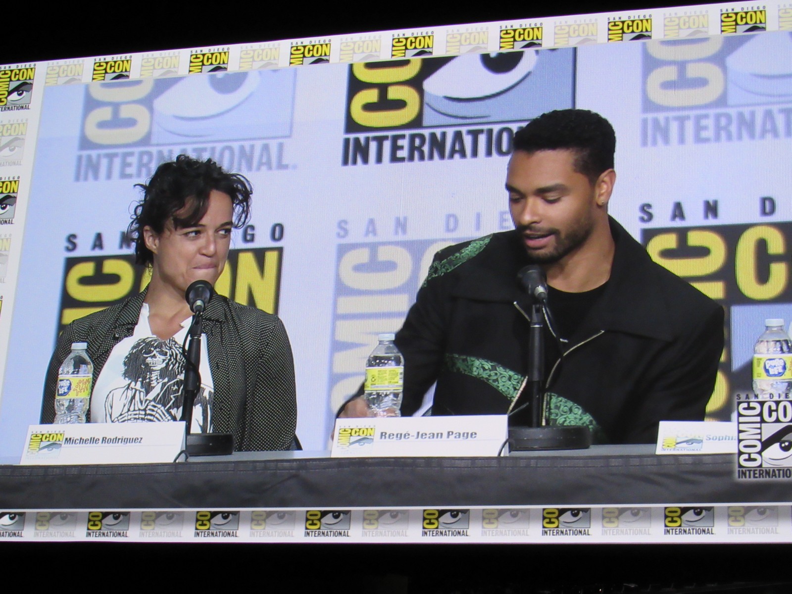 Michelle, whose character is a Barbarian, and Regé, whose character is a Paladin, talked about their training. Michelle revealed that she gained 10 lbs of muscle from protein shakes, push ups, sit ups, lifting weights, and taking out her frustrations out on a punching bag. Regé talked about how he got really good with wielding a sword, and due to the stunt training, his thighs were killing him, but also he “had the best ass in [his] life.”