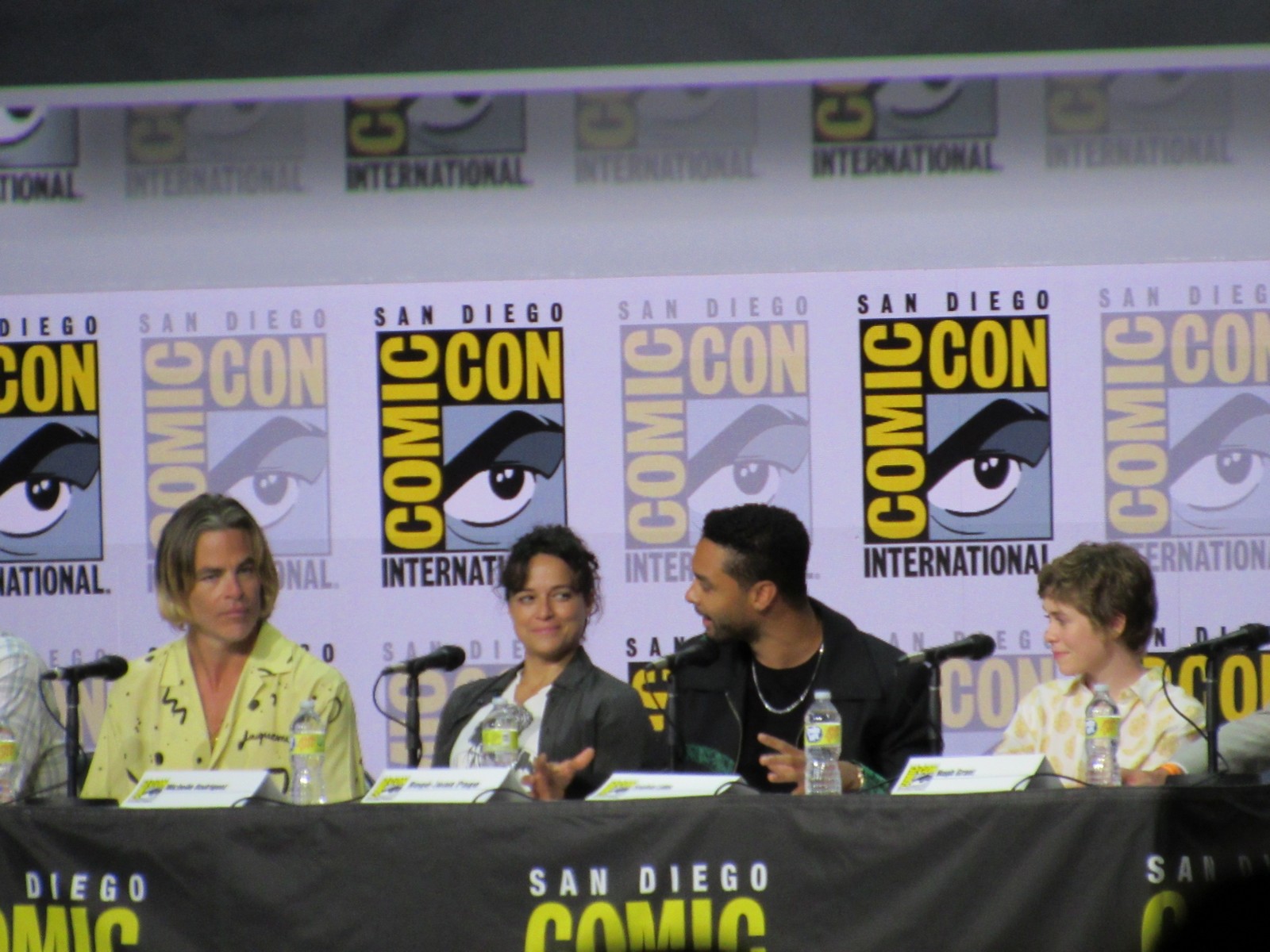 Eddie then introduced and brought out the moderator, Karl Jacobs. Josh immediately recognized him as one of the guys on Mr. Beast. Before bringing out any of the panelists, we watched a behind the scenes clip of Dungeons & Dragons: Honor Among Thieves. Well, that is, after it glitched out a couple of times and they had to restart it! I guess everyone is still a little rusty after 3 years.