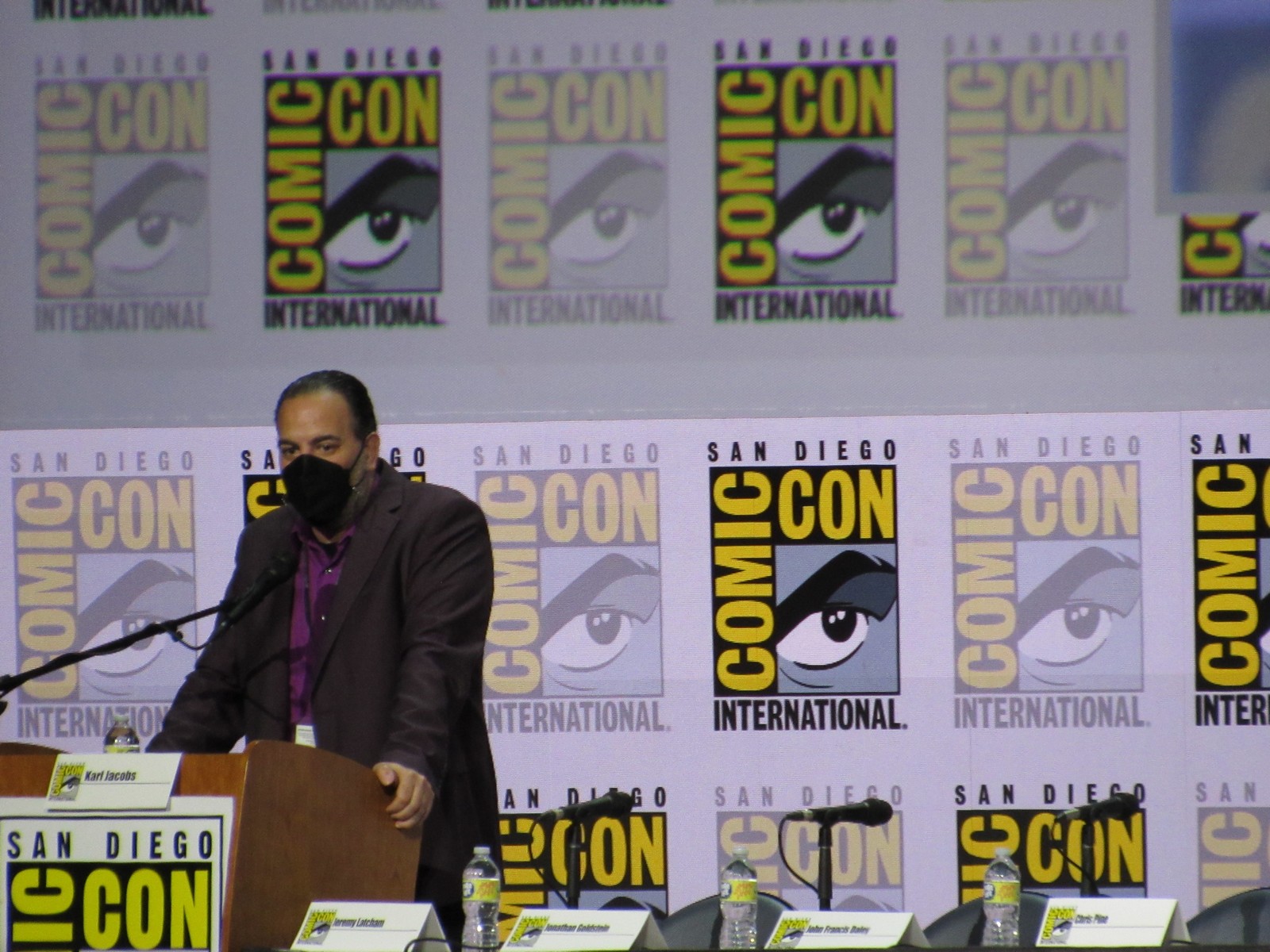 We didn’t anticipate there being much of a line to get into the 6,500 seat room, so we figured 30 minutes would be sufficient. As we exited the convention center, we were directed to go all the way around the tents set up outside of Hall H, and were not allowed to cut through the middle section. As we rounded the corner, we saw a short line extending down the street just a bit, before turning back around and heading toward the Hall H tents, so we could see that the line to get into Hall H was essentially a walk in, as expected. However, it turned out that it wasn’t quite so easy as that.