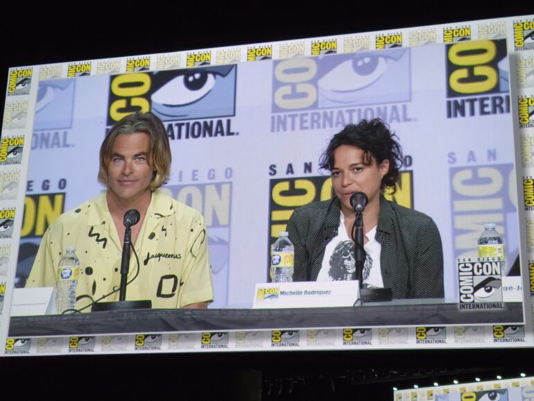 Following the clip, Karl brought out Producer Jeremy Latcham and the film’s Director/Screenwriting team of Jonathan Goldstein and John Francis Daley. Jonathan mentioned that they had been in “the trenches with COVID” making this movie the past two years, so seeing everyone’s faces reminded them why they do this.