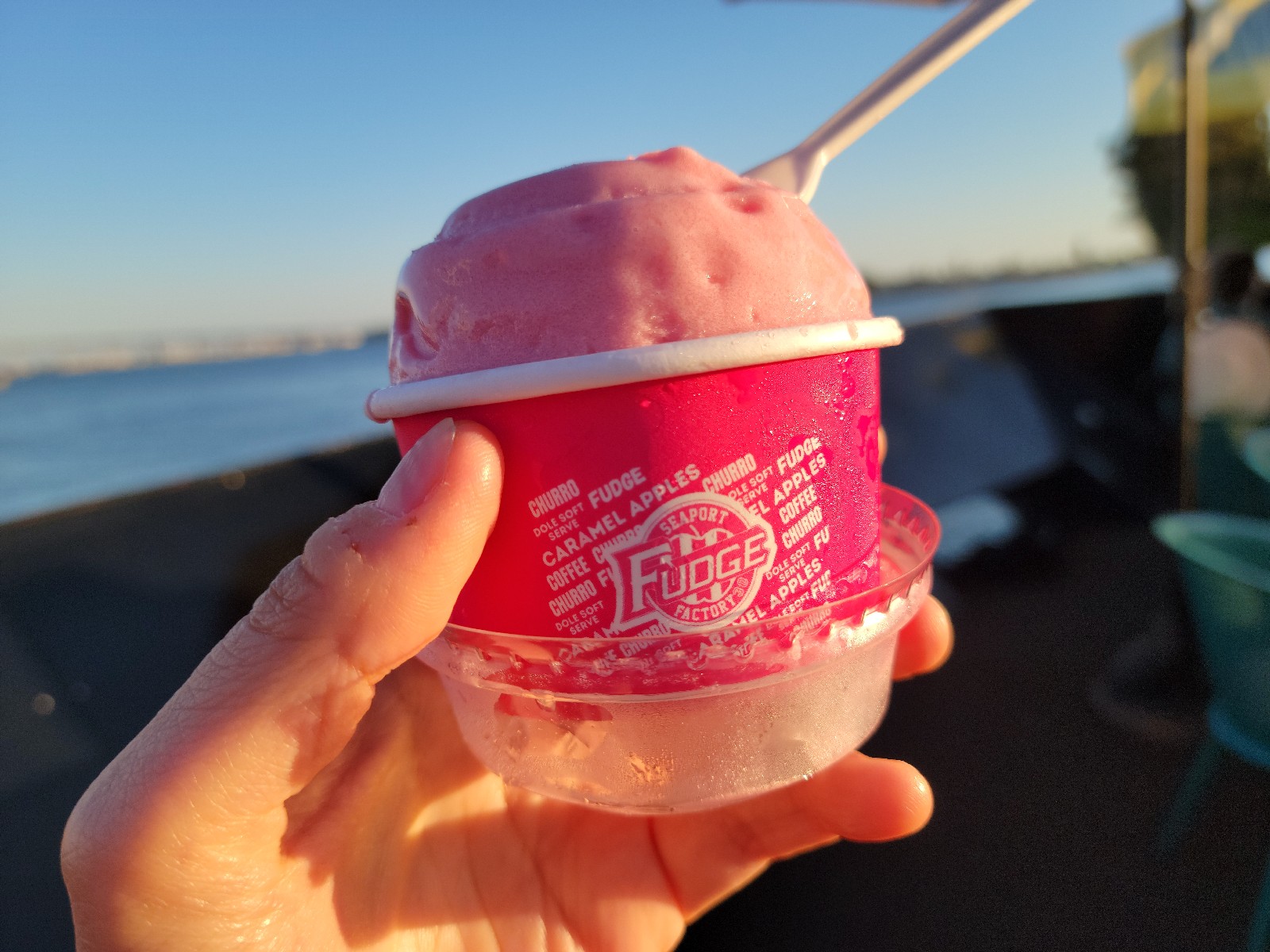 As we headed toward the back, there was a bar with a huge crowd. Just then, someone came down the stairs and sneakily whispered to anyone in hearing distance, “There’s much less of a line at the bar upstairs.” So we took that as our cue to head upstairs and go exploring up there. Indeed, as promised, there was hardly anyone in line at the bar on this level. We also quickly found a Seaport Fudge Factory booth giving away Dole Whip! They were out of pineapple, so the only flavors they had left were mango and watermelon. I don’t like mango, so opted for watermelon. Then we headed outside to enjoy the Dole Whip and take in the sights.